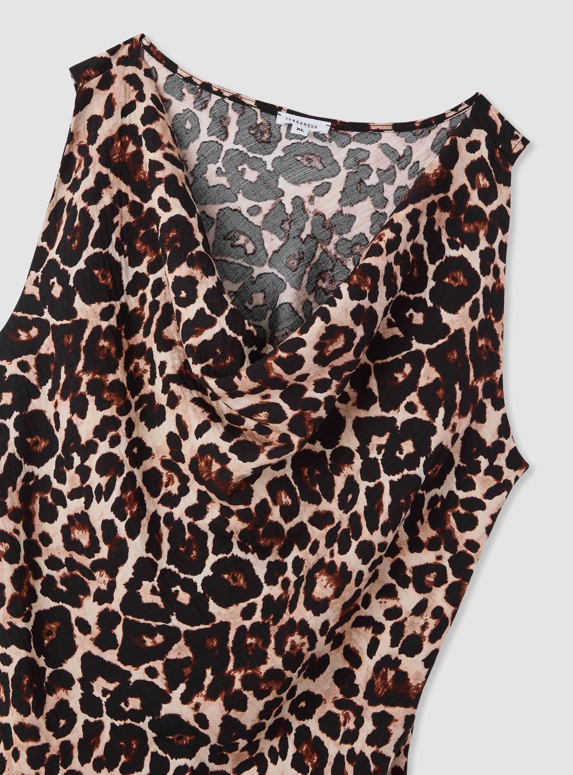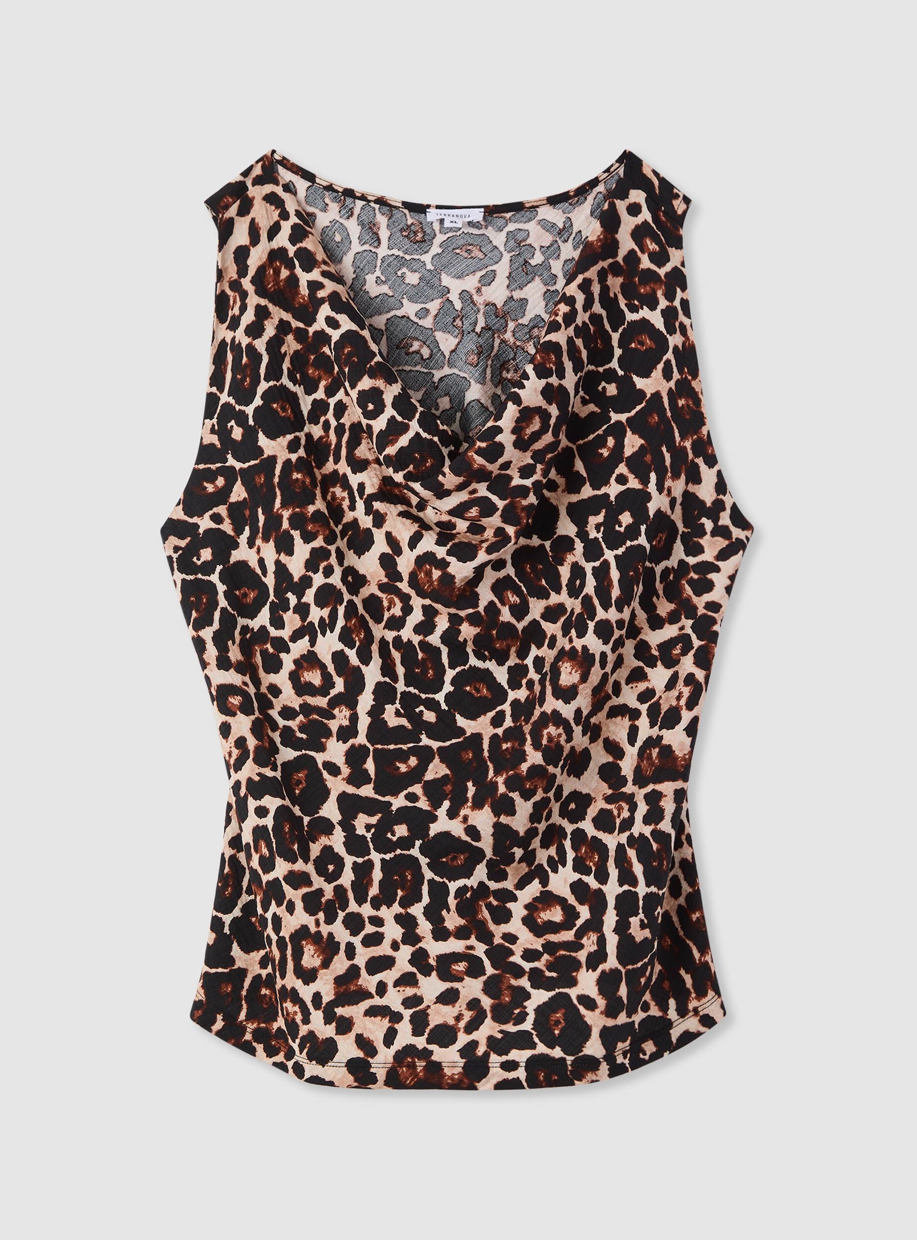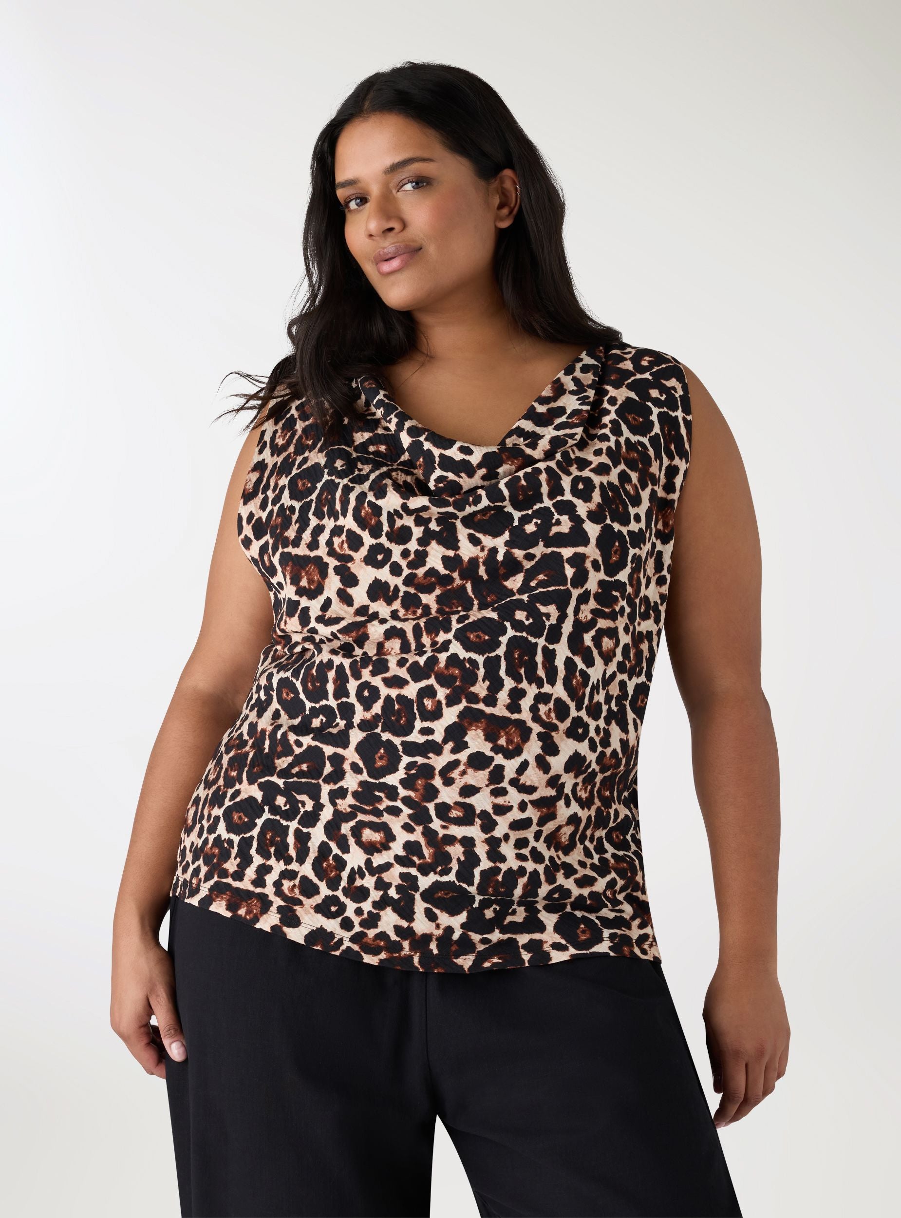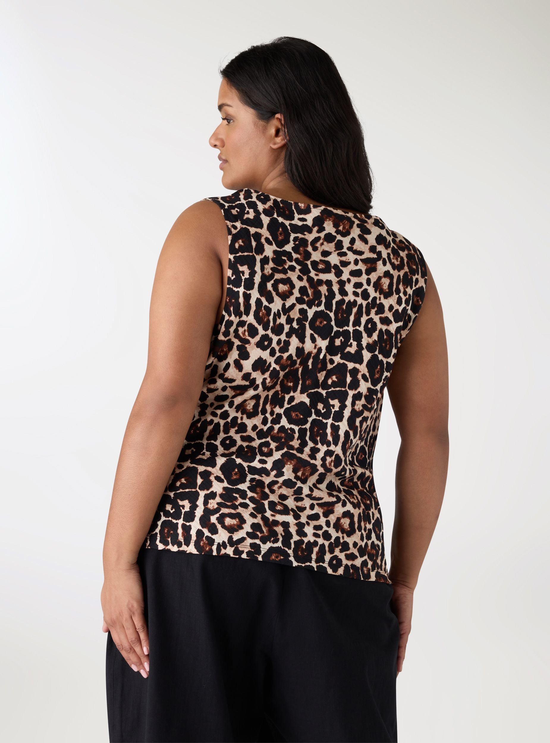 Ženski top sa animalnim printom i dizajnom bez rukava, osmišljen da unese karakter u svakodnevne kombinacije. Naborani izrez sprijeda naglašava dekolte, dok zadnji dio koji više pokriva uravnotežuje liniju. Regularan kroj, idealan uz farmerke i blejzer za kancelariju ili uz suknju i aksesoare za večernje izlaske.Detalji
