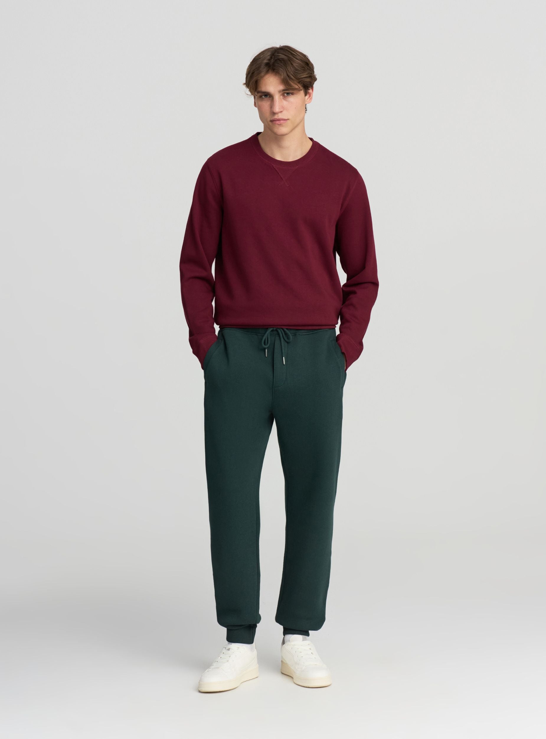 Muški trenirke od teške frotir tkanine, savršene za hladnu sezonu. Jednobojni model s podešivom vezicom u struku, praktičnim bočnim džepovima i udobnim stražnjim džepom. Udobna kroja i suštinski dizajn za idealan ležerni stil u slobodno vrijeme.Detalji