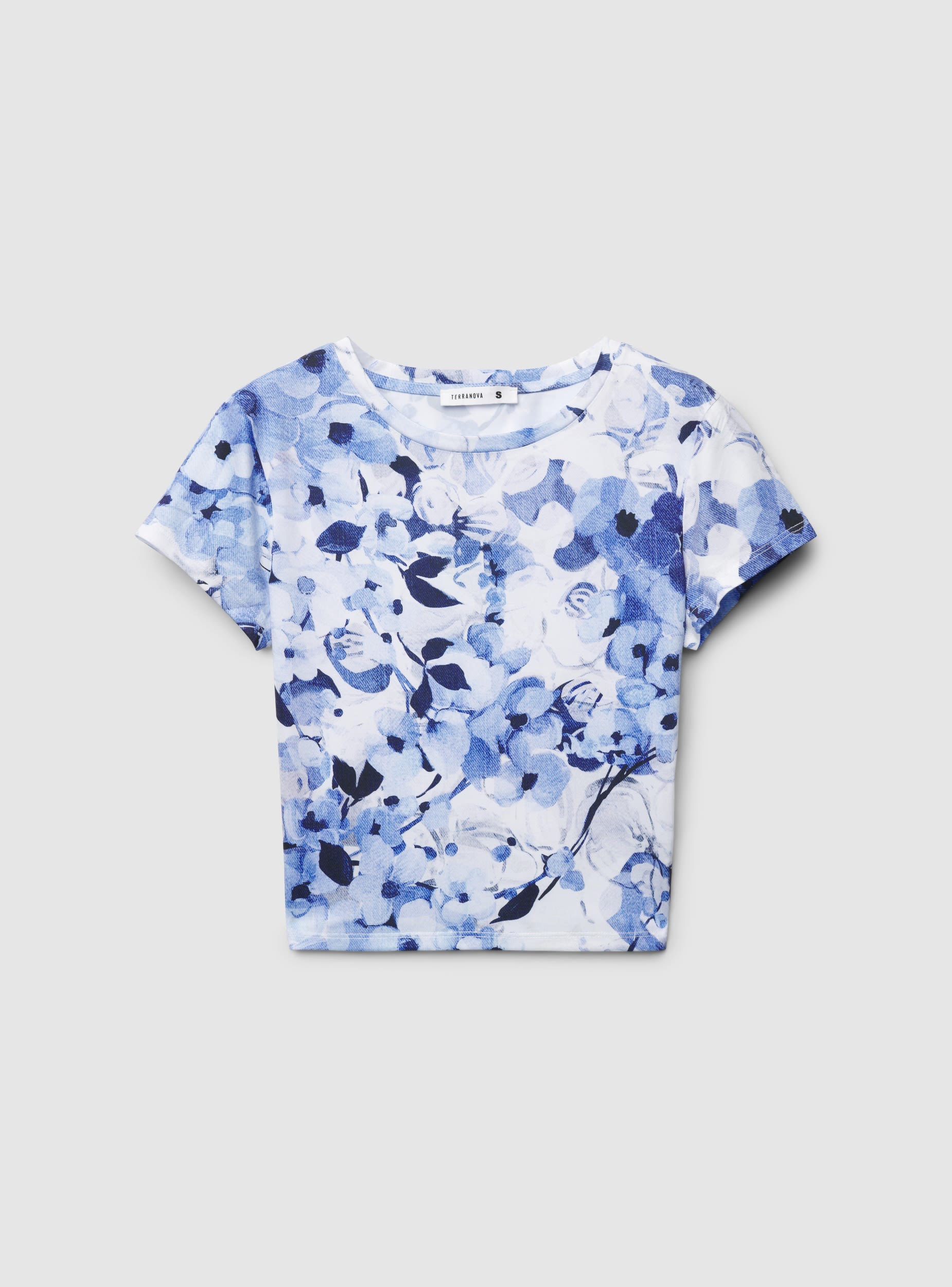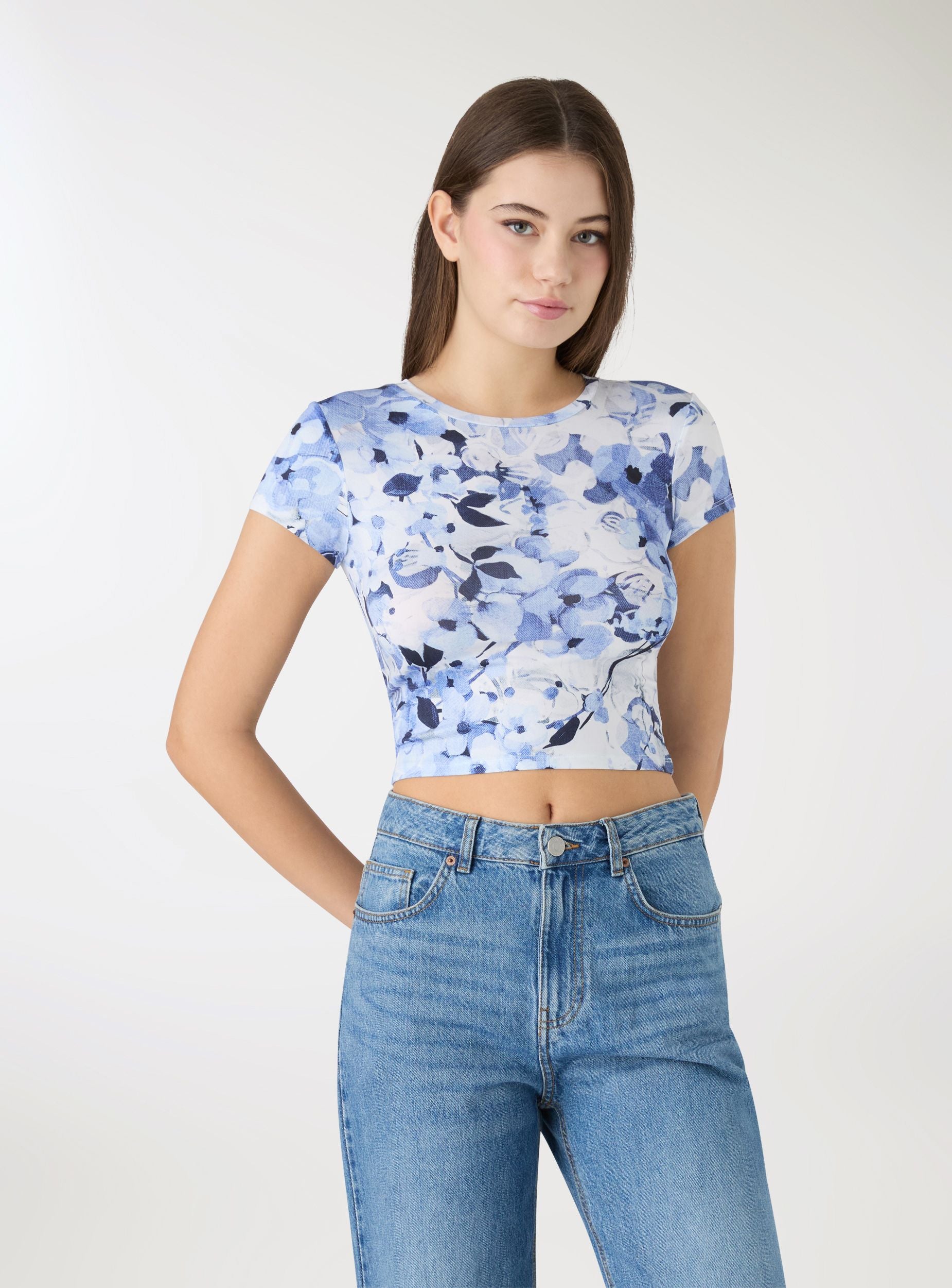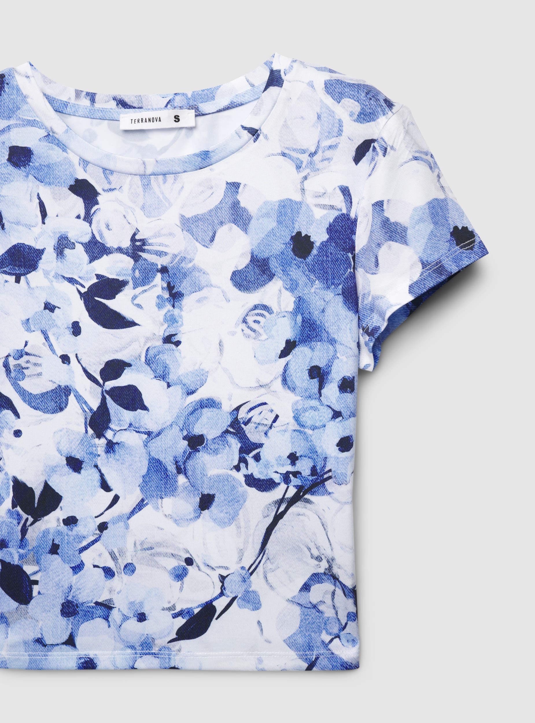 Ženska majica s cvjetnim printom, idealna za ležeran i moderan izgled. Crop model s okruglim izrezom i kratkim rukavima, savršen za kombinovanje s farmerkama ili suknjama visokog struka. Silueta prati oblik tijela bez stezanja, pružajući svakodnevnu udobnost.Detalji