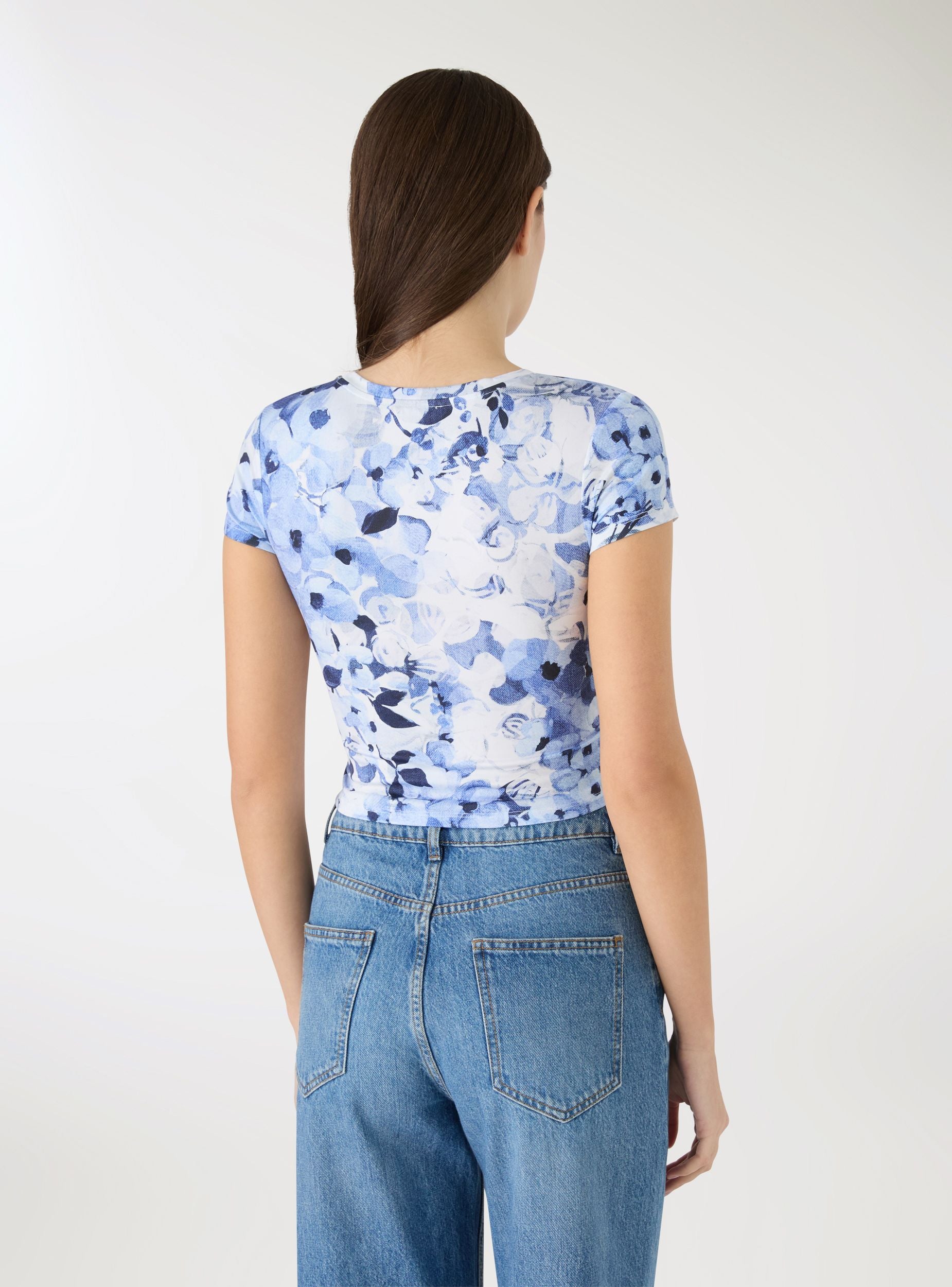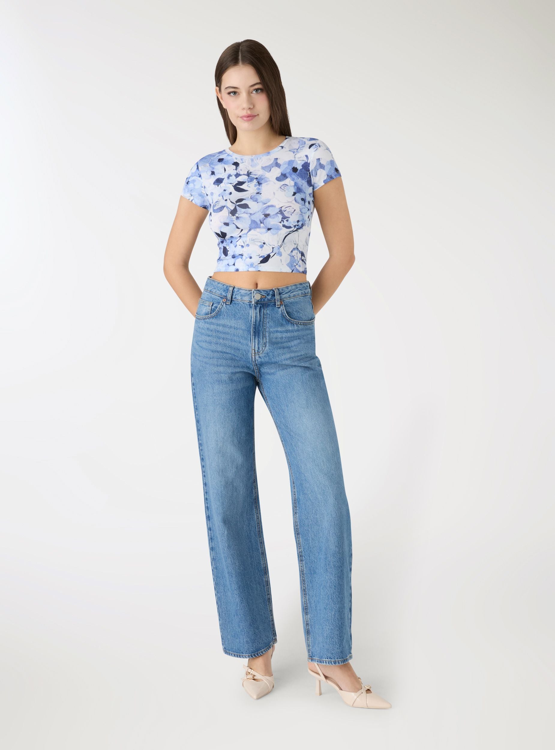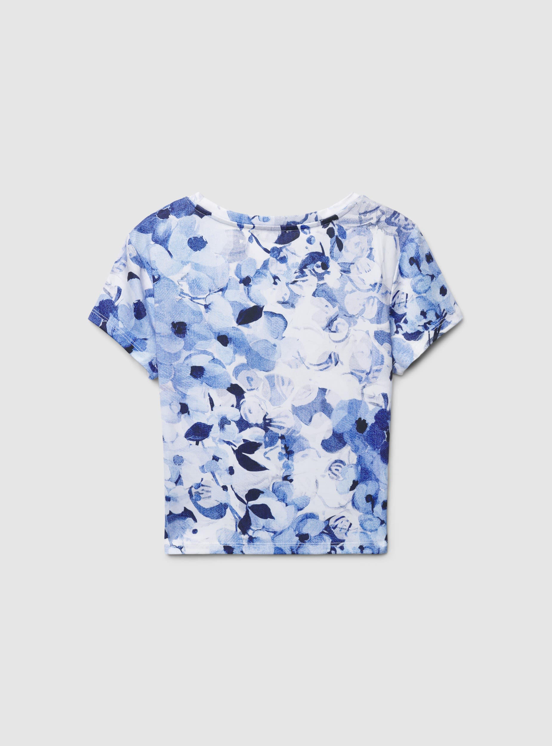 Ženska majica s cvjetnim printom, idealna za ležeran i moderan izgled. Crop model s okruglim izrezom i kratkim rukavima, savršen za kombinovanje s farmerkama ili suknjama visokog struka. Silueta prati oblik tijela bez stezanja, pružajući svakodnevnu udobnost.Detalji