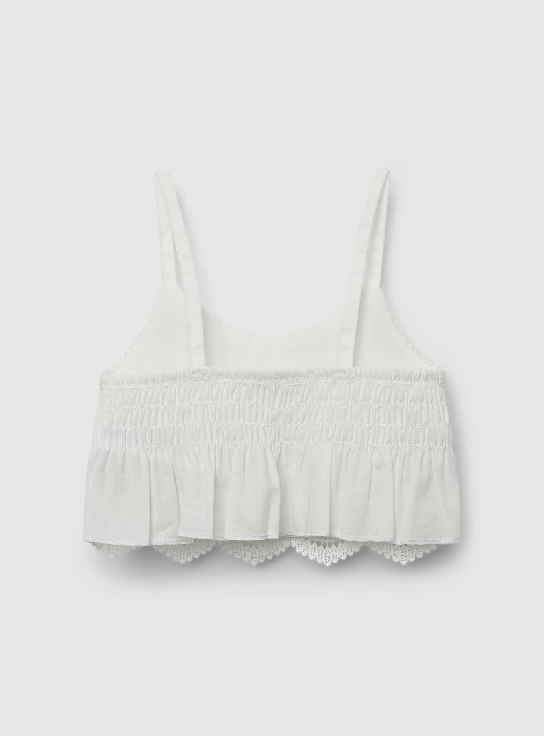 Crop majica za djevojčice ukrašena rafiniranim efektom čipke s šarenim detaljima koji dodaju živahan i veseli dodir. Savršena za ljetne dane, lako se kombinira s lepršavim suknjama ili kratkim hlačama za svjež i bezbrižan izgled. Idealna za slobodno vrijeme, odmore ili posebne prigode kada želite dodati bohemski dodir svom outfitu.Detalji