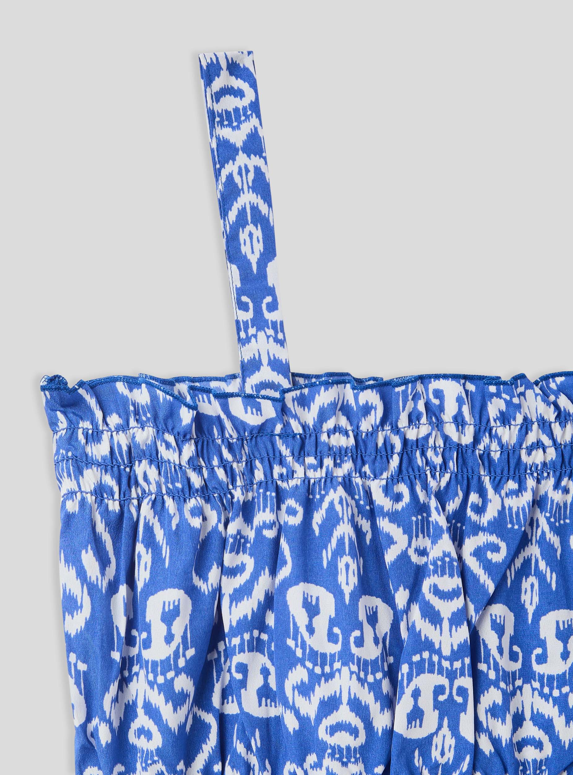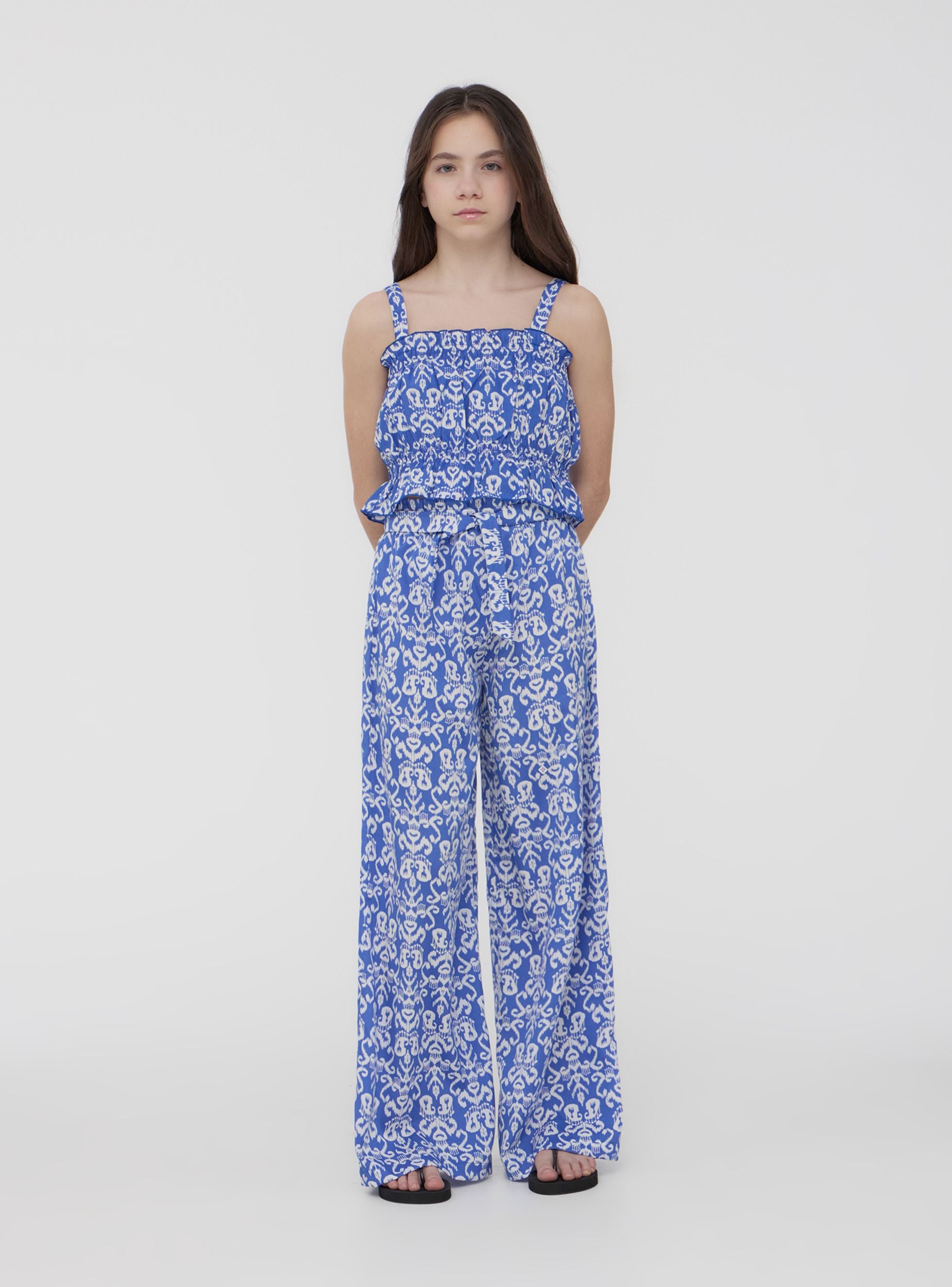 Top za djevojčicu s kratkim krojem, obogaćen živopisnim etničkim uzorkom koji daje originalan i moderan dodir. Tanke naramenice i lagani dizajn čine ga idealnim za ljetne dane, osiguravajući udobnost i slobodu kretanja. Savršeno se može kombinirati s suknjama ili hlačicama, za svjež i energičan izgled. Komad koji spaja stil i praktičnost za svaku priliku.Detalji