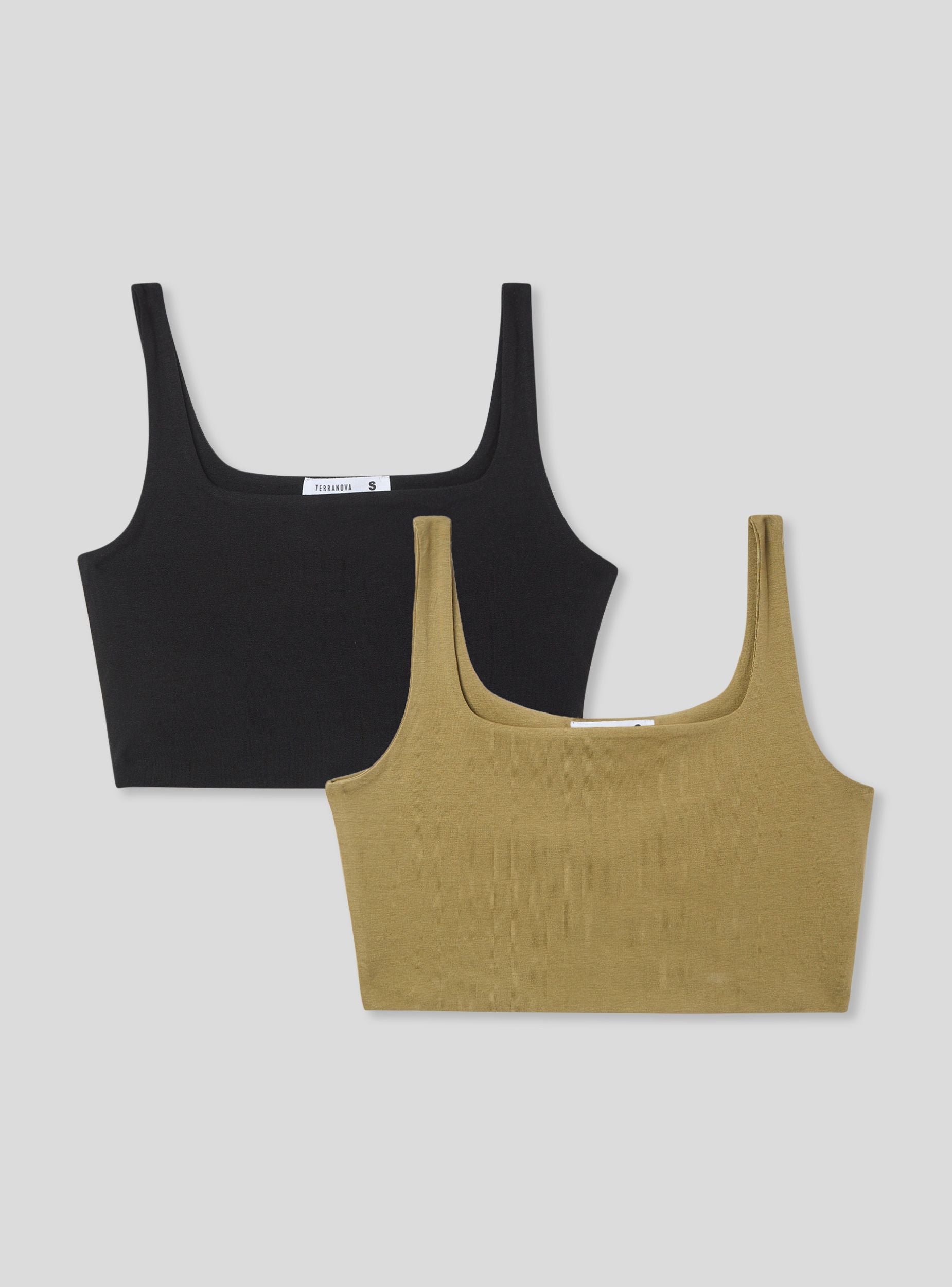 Sada složená ze dvou dámských topů, ideální pro doplnění šatníku o všestranný a pohodlný styl. Mají rafinovaný čtvercový výstřih, který zvýrazňuje dekolt, a crop design, který je činí perfektními pro teplejší dny. Oba topy, v jednobarevném provedení, nabízejí dotek jednoduchosti a praktičnosti. Základní volba pro ty, kteří hledají pohodlí a styl v jednom kousku.Detaily