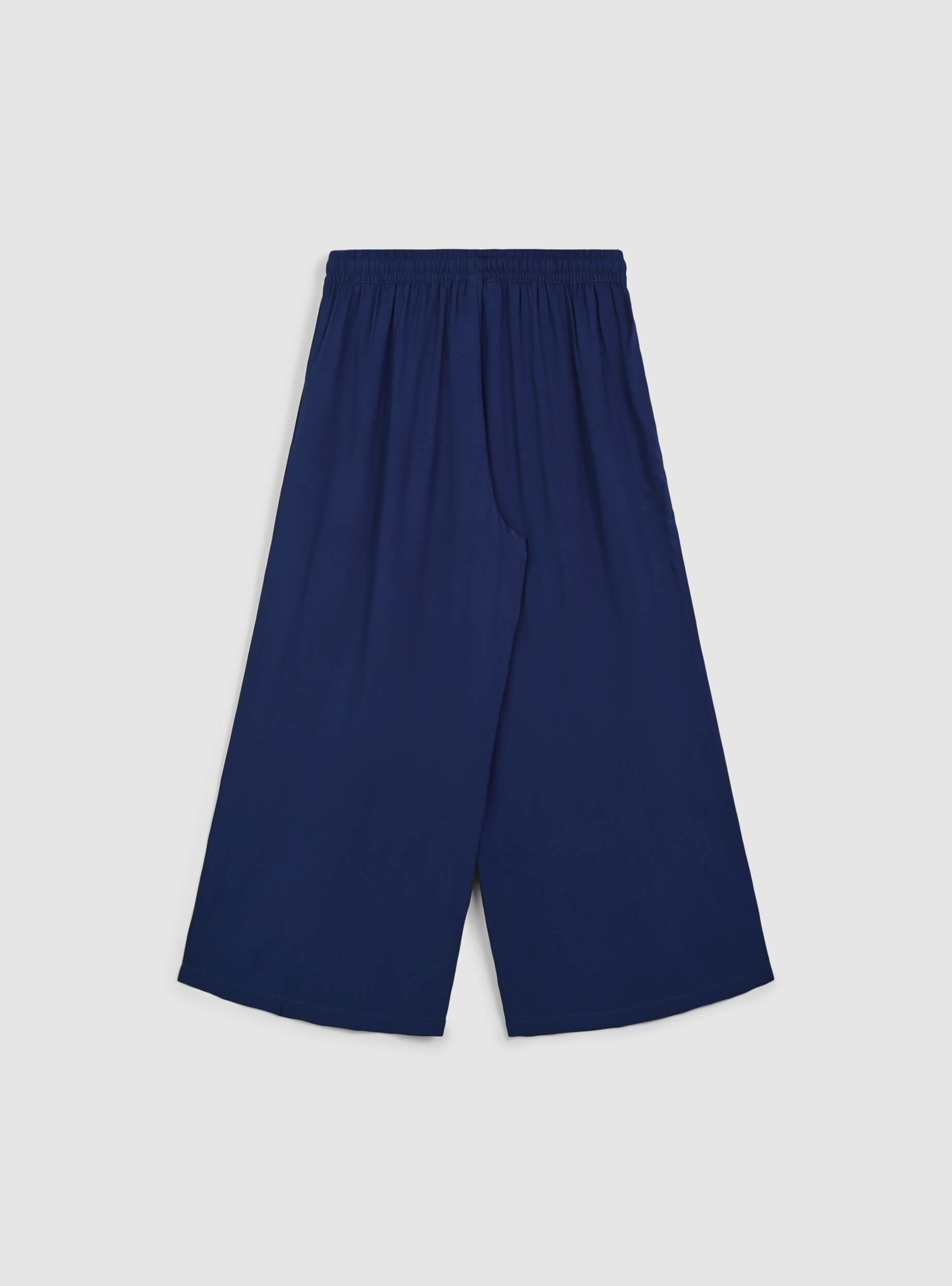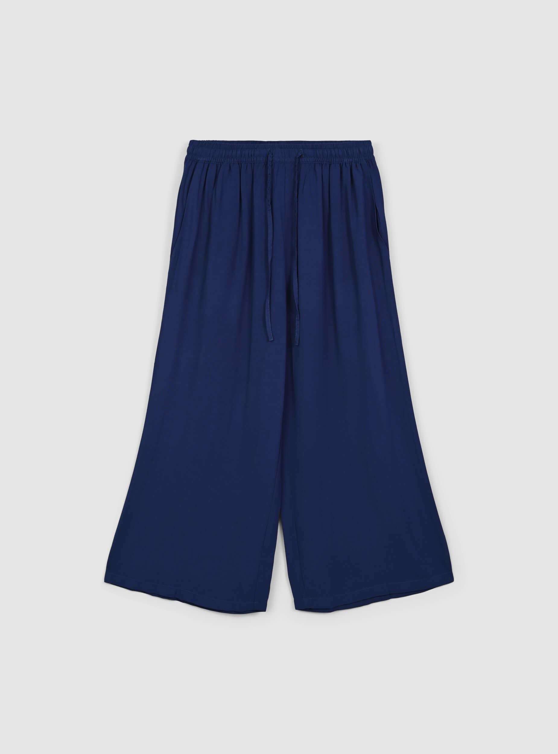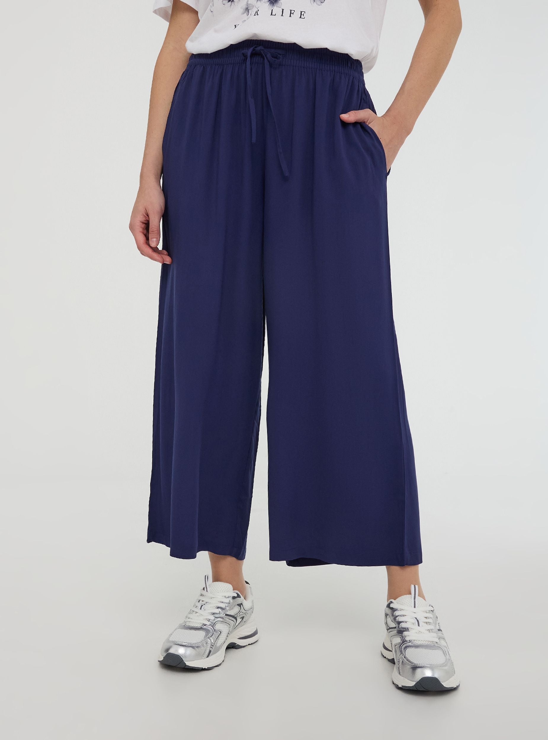 Dámské kalhoty s jednobarevným designem a širokým palazzo střihem. Krátká délka dodává moderní a univerzální vzhled, ideální pro každodenní nebo elegantní kombinace. Disponují praktickými bočními kapsami a pohodlnou šňůrkou v pase, která umožňuje optimální nastavení velikosti. Elastický pas zajišťuje pohodlí a flexibilitu při nošení, což tyto kalhoty činí ideálními pro ty, kteří hledají sofistikovaný styl bez obětování pohodlí.Detaily