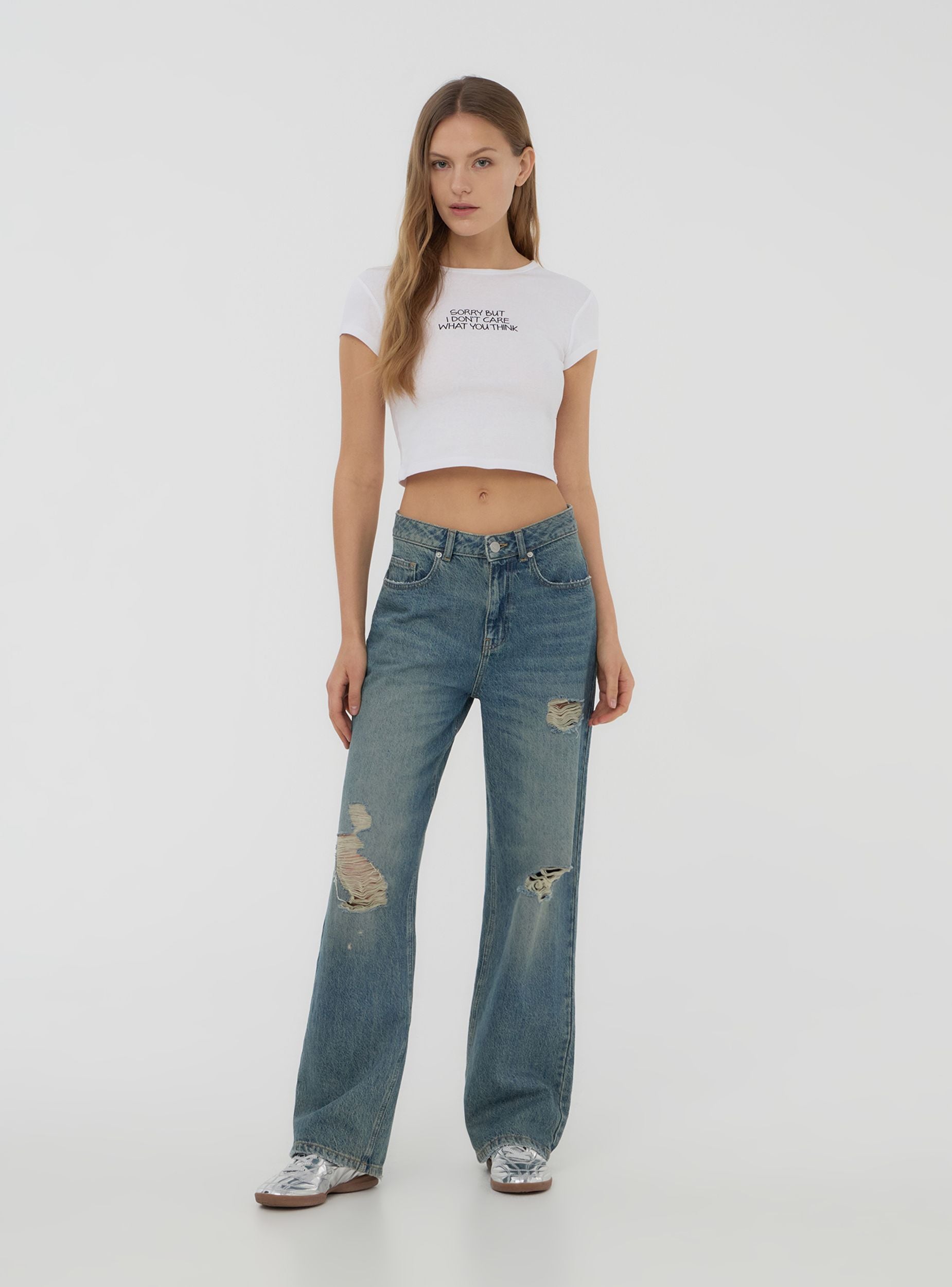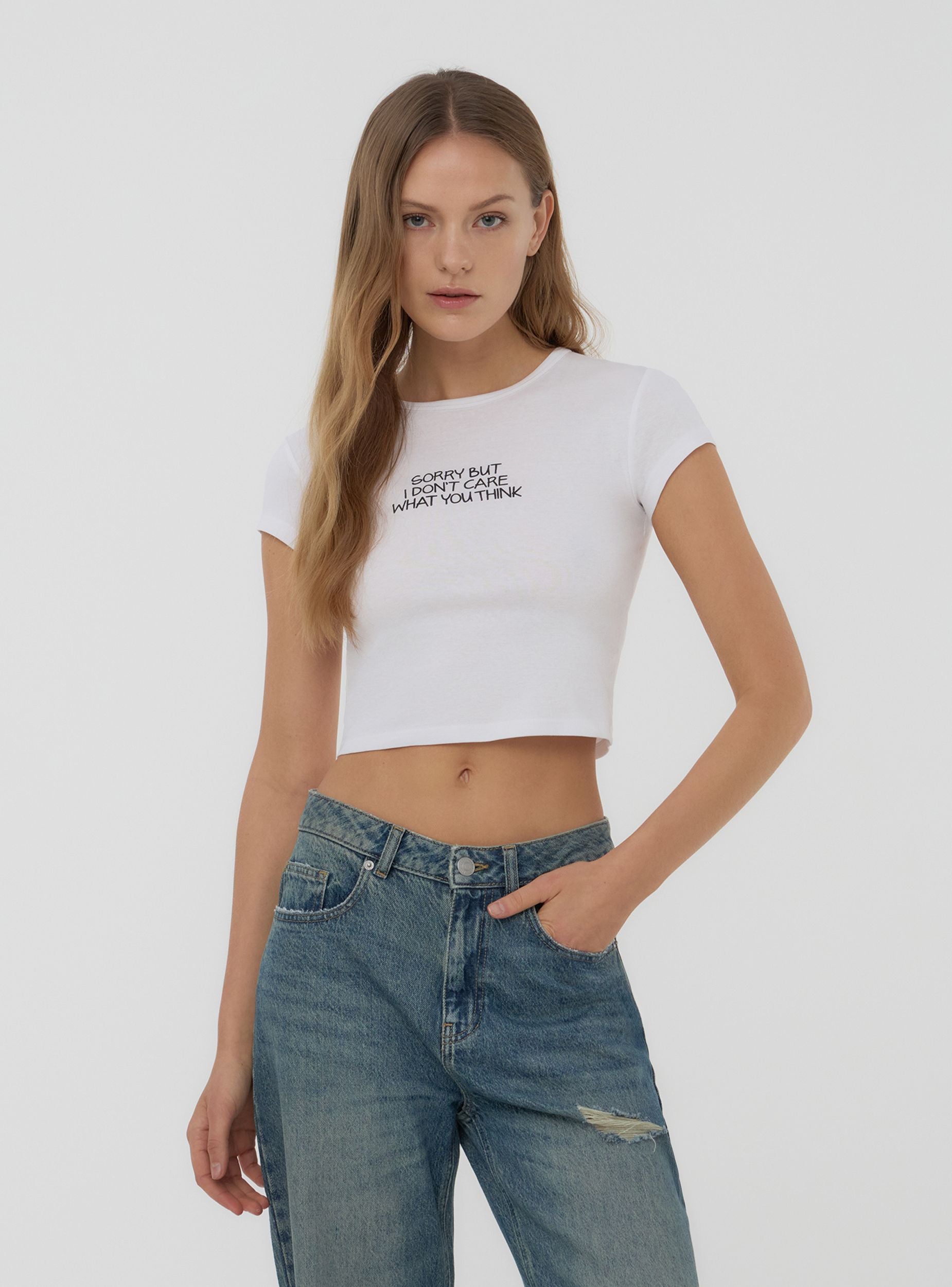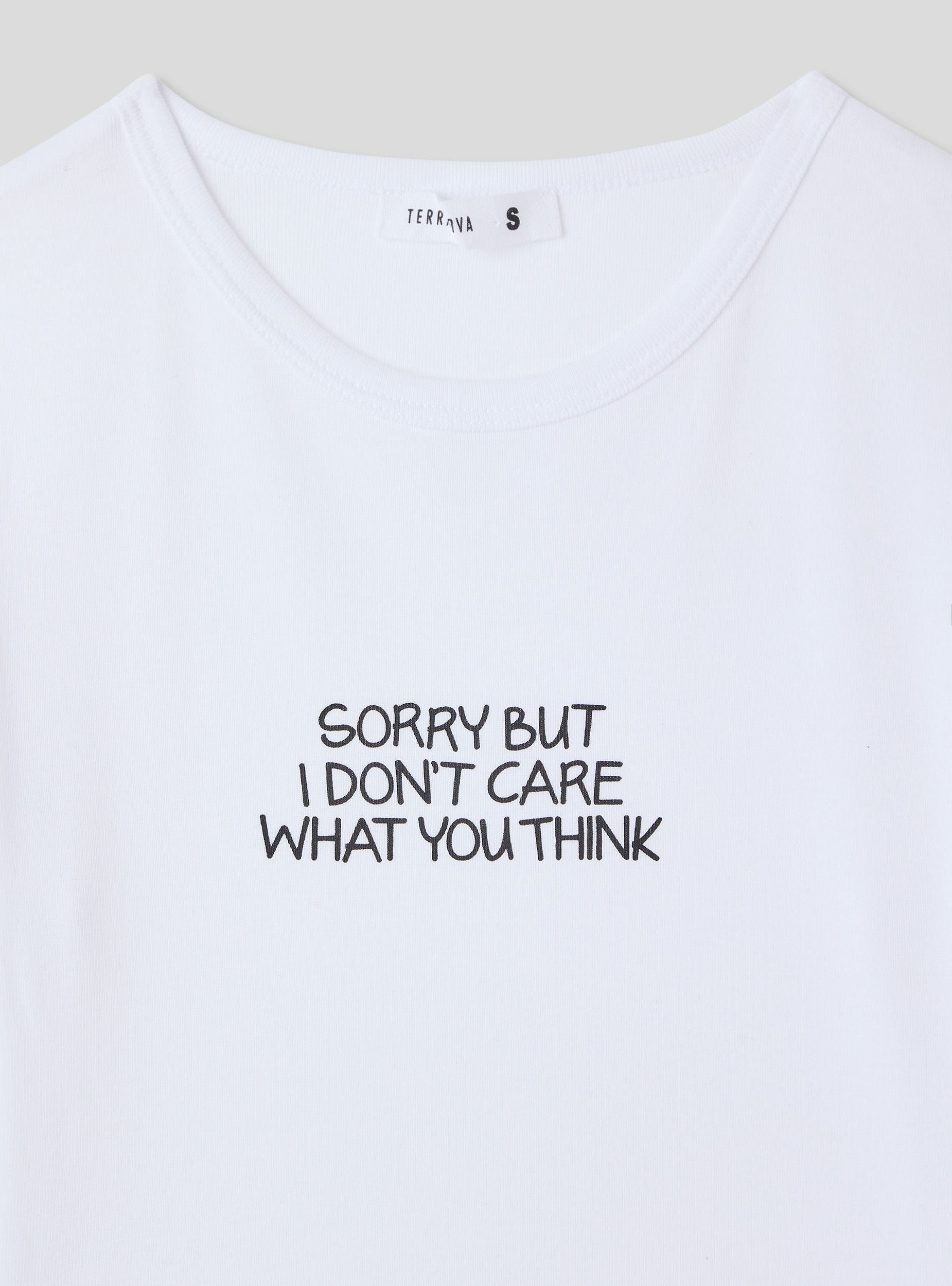 Dámské tričko s krátkým střihem, ideální pro svěží a módní vzhled. Má kulatý výstřih a krátké rukávy, což zajišťuje pohodlí a praktičnost. Zvláštností tohoto kousku je vtipný nápis umístěný vepředu, který dodává outfitu nádech ironie a osobnosti. Ideální pro ty, kteří rádi vyjadřují svůj styl lehkým a hravým způsobem, toto tričko je perfektní pro neformální a každodenní kombinace.Detaily