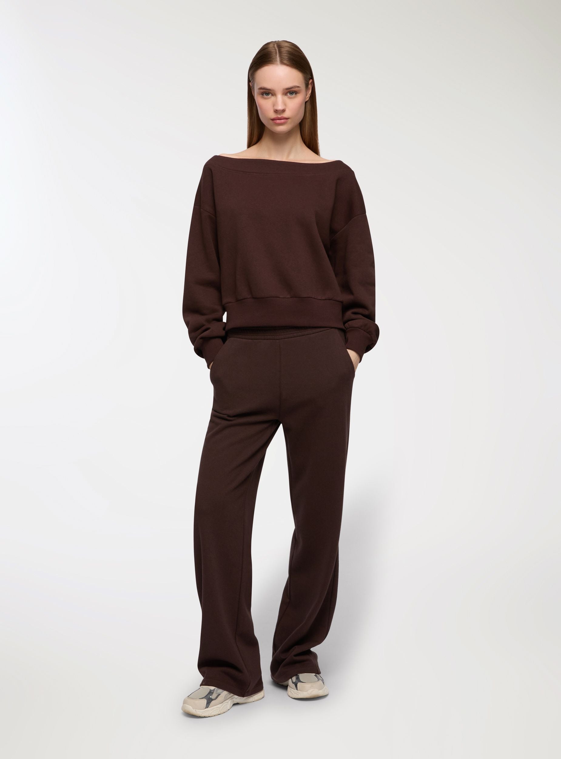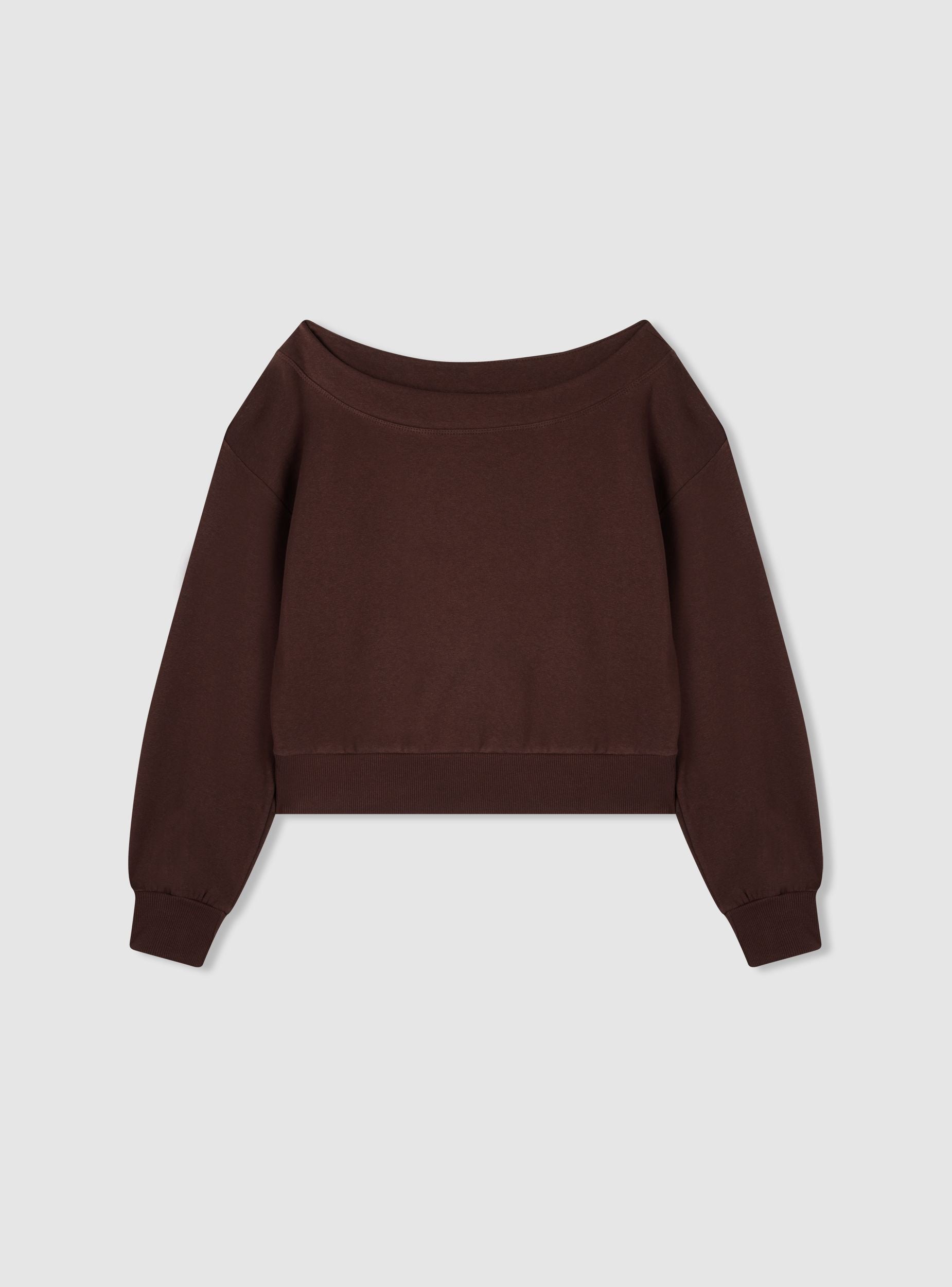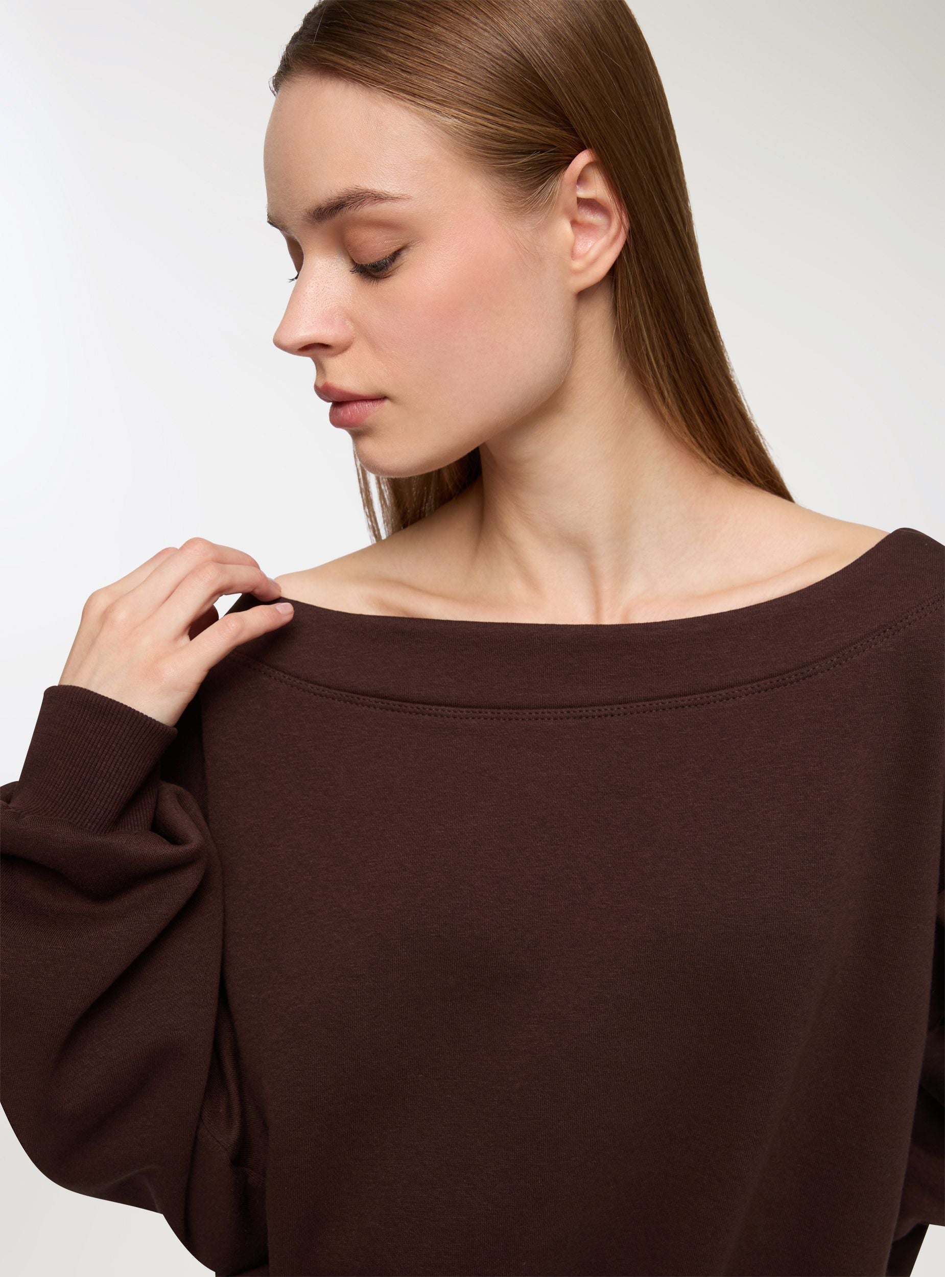 Dámská mikina v jednobarevném provedení s ženským a rafinovaným designem. Odkryté ramena dodávají smyslný a moderní nádech. Vyrobena z těžké tkaniny, je ideální pro chladné období. Bez kapuce a zipu, tato mikina je ideální pro vytváření minimalistických, ale výrazných outfitů. Univerzální kousek, který spojuje pohodlí a současný styl.Detaily