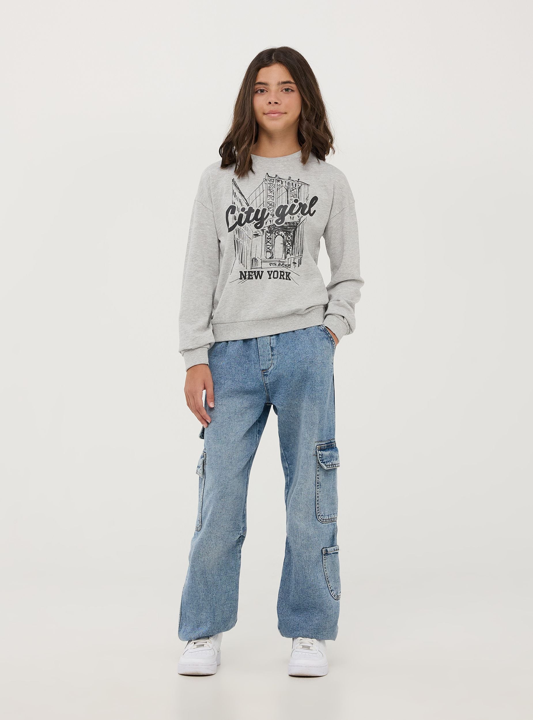 Měkká a pohodlná, tato dívčí mikina bez kapuce vyrobená z bavlny je dokonalým kouskem pro ležérní a módní vzhled. Design obsahuje potisk uprostřed s nápisem "City Girl" a grafickou reprezentaci New Yorku, což dodává outfitu městský nádech. Kousek má standardní střih, elastické manžety a lem pro pohodlné nošení. Ideální na školní dny nebo volný čas. Snadno se kombinuje s džíny a teniskami.Detaily