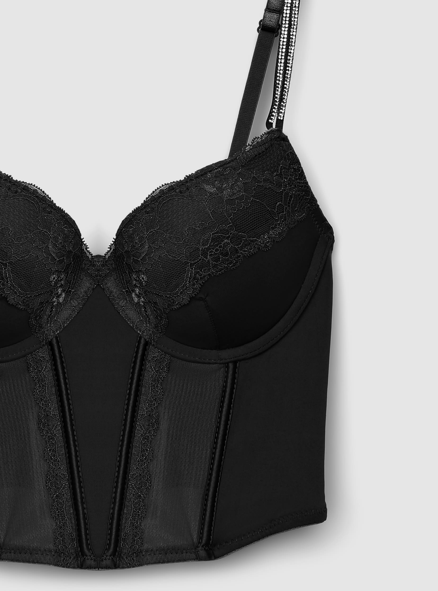 Dámská podprsenka model bustier s tvarovanými košíčky a kosticí, ideální pod rozepnuté košile nebo blejzry pro elegantní vzhled. Krajkové detaily na dekoltu a tylové panely vpředu dodávají ženskost, zatímco nastavitelné ramínka zdobená kamínky přinášejí třpytivý efekt. Zadní zapínání na háčky a přiléhavý střih, perfektní jak na speciální večery, tak na pečlivě sestavené každodenní outfity.Detaily
