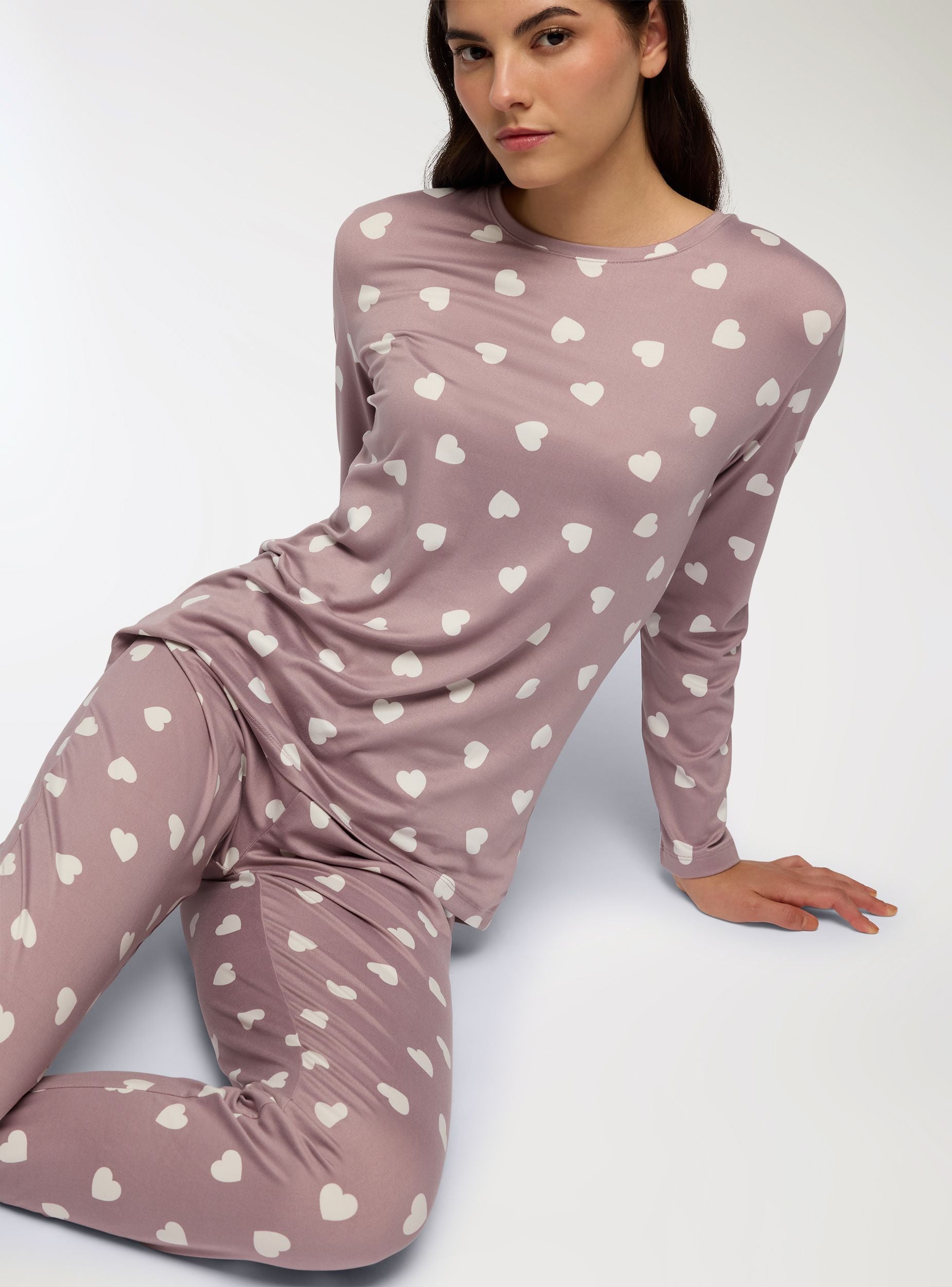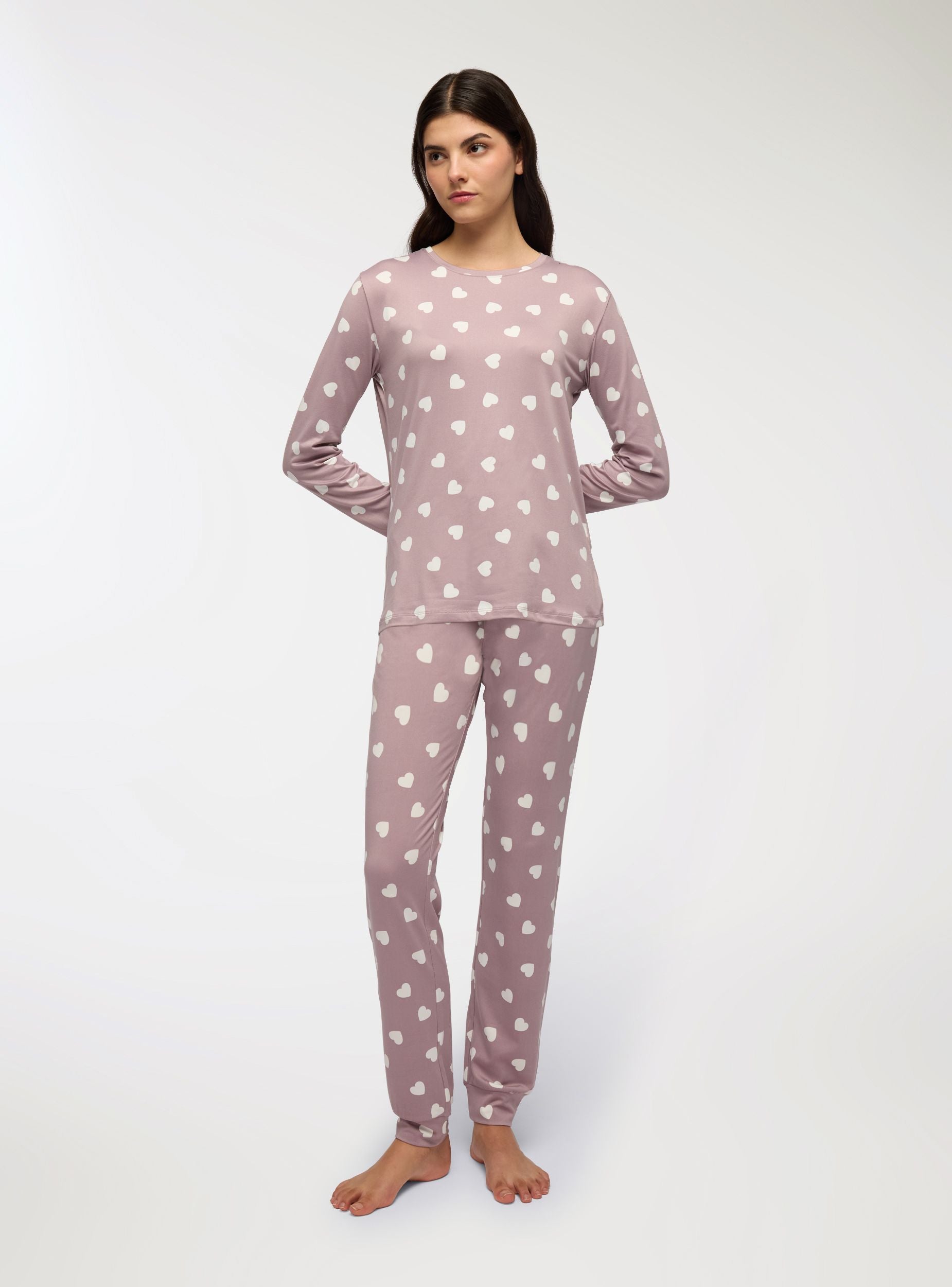 Dámský pyžamový set sestávající z trička s dlouhými rukávy a dlouhých kalhot, oba s potiskem srdíček. Tričko má kulatý výstřih a pohodlný střih, zatímco kalhoty mají v pase elastický pás pro větší pohodlí. Ideální pro relaxaci doma nebo na spaní, toto pyžamo spojuje styl a praktičnost.Detaily