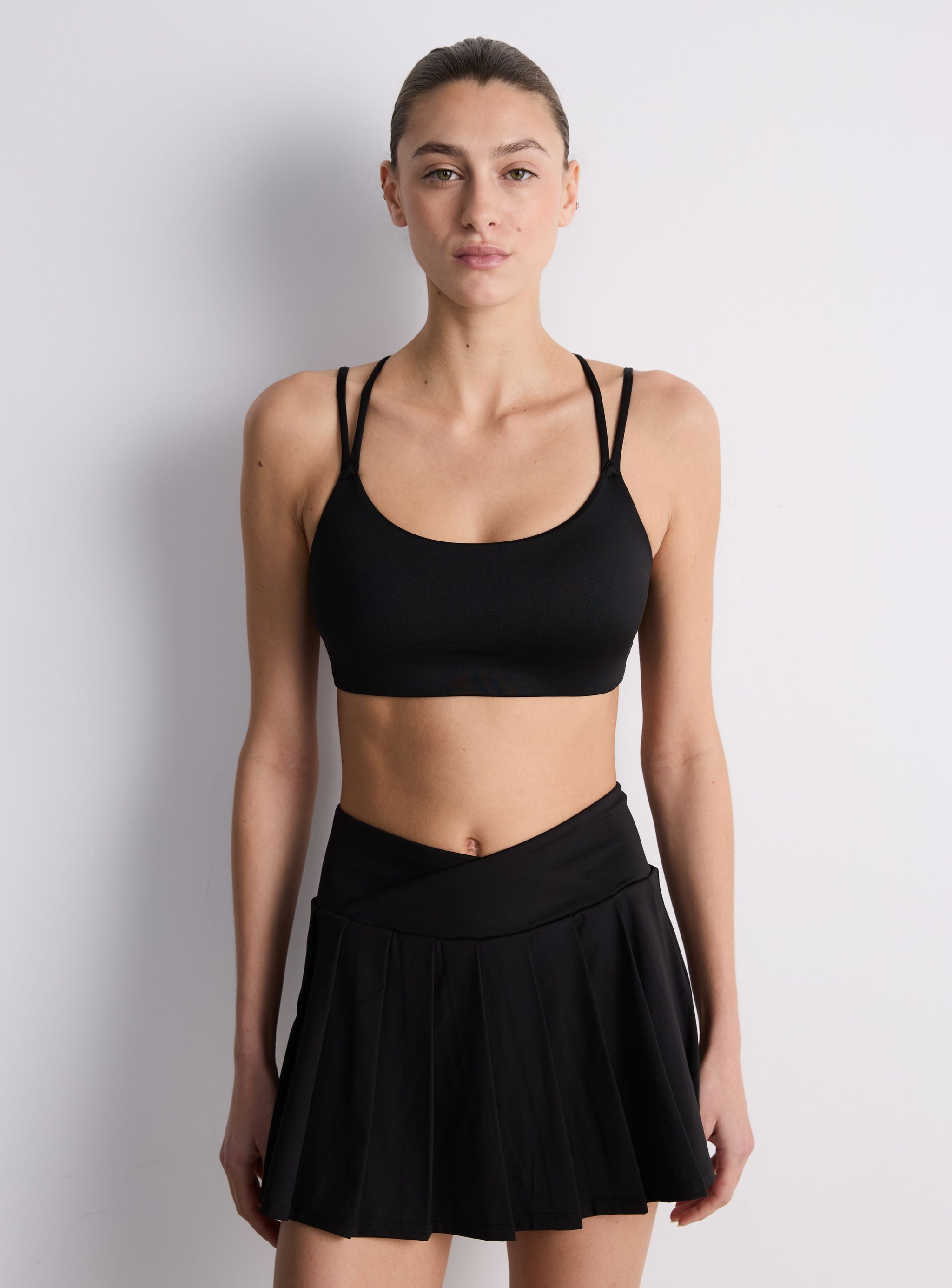 Dámský sportovní top v jednobarevném provedení s kulatým výstřihem a tenkými překříženými ramínky na zádech. Elastický pás pod prsy poskytuje lehkou podporu při nízkointenzivním tréninku, józe nebo volném čase. Aktivní linie.Detaily