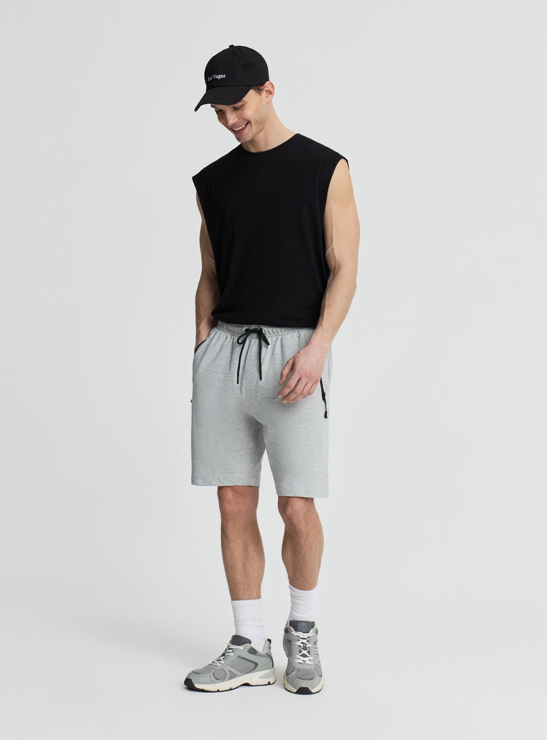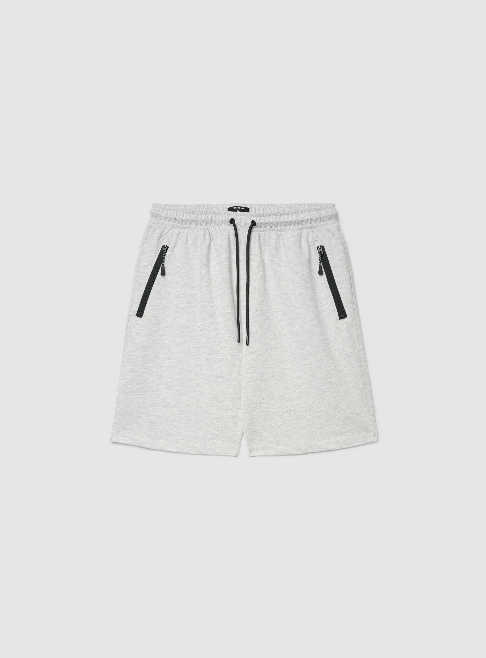 Pánské jednobarevné teplákové šortky, ideální pro trénink i volný čas. Model s elastickým pasem a nastavitelným šňůrkovým stahováním pro pohodlné nošení. Boční kapsy na zip pro bezpečné uložení drobných předmětů. Čistý střih a délka nad koleno, perfektní v kombinaci s mikinami a teniskami pro sportovní a městský vzhled. Lehká tkanina.Detaily