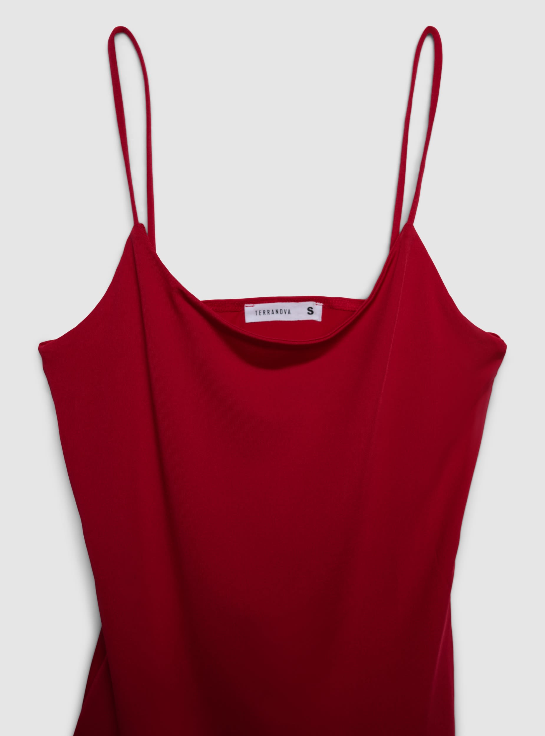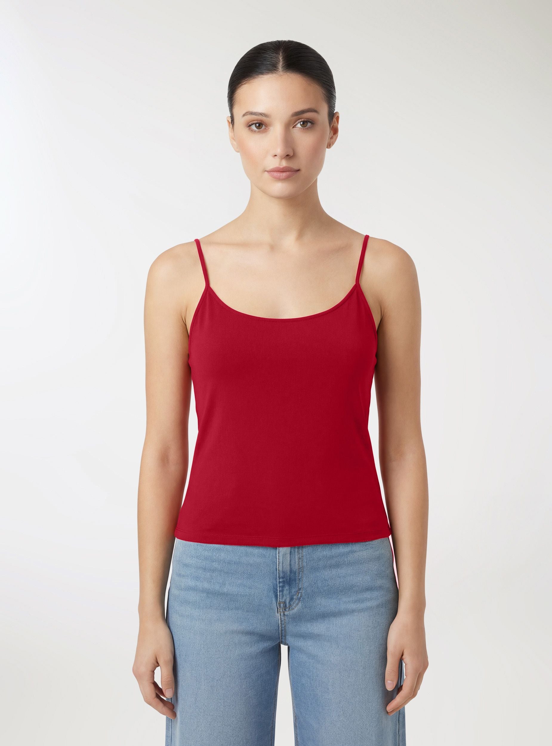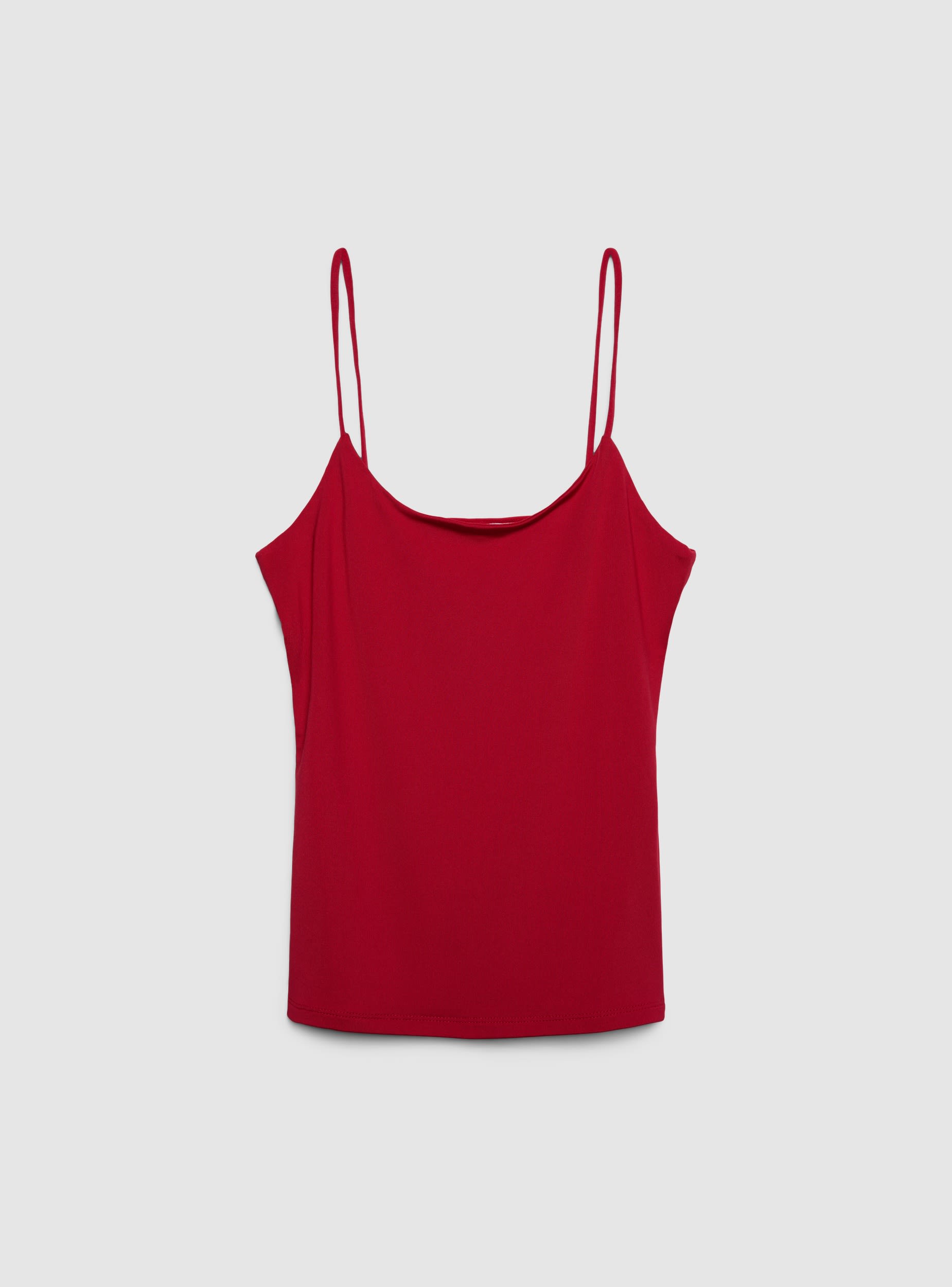 Dámské jednobarevné tílko s tenkými ramínky a měkkým řaseným výstřihem. Délka regular, ideální pod sako nebo košile do kanceláře a perfektní s džíny nebo sukněmi na volný čas. Minimalistický design. Univerzální kousek, který lze nosit samostatně v teplých dnech nebo ve vrstvách během přechodných období.