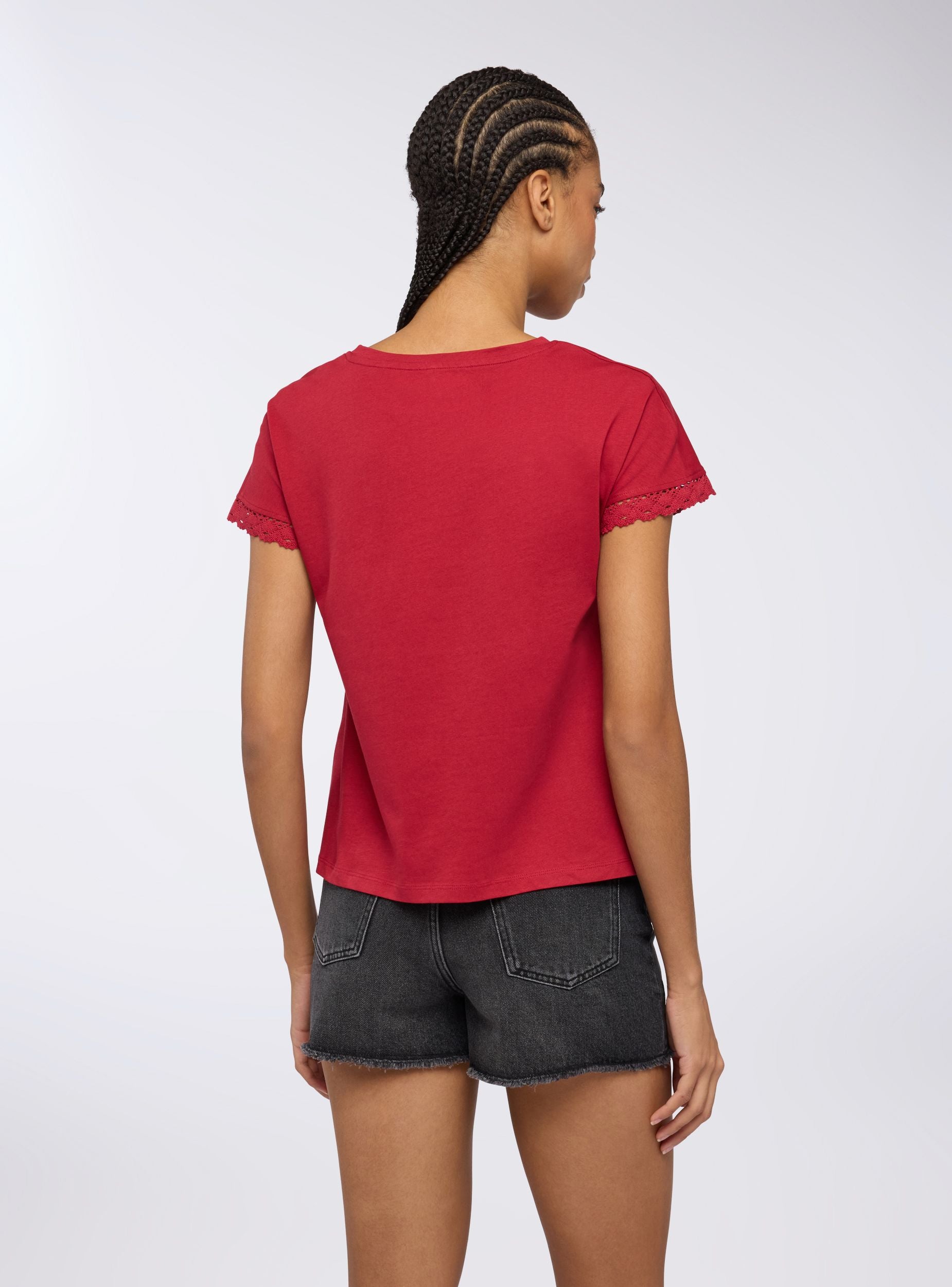 Dámské tričko s kulatým výstřihem a krátkými rukávy, obohacené o rafinovanou krajkovou vsadku na rukávech, která dodává kousku nádech ženskosti. Mandala potisk na přední straně přidává dekorativní prvek, což činí toto tričko ideálním pro ty, kteří hledají neformální, ale elegantní vzhled. Ideální pro letní outfity, spojuje pohodlí a styl s jedinečnými detaily.Detaily