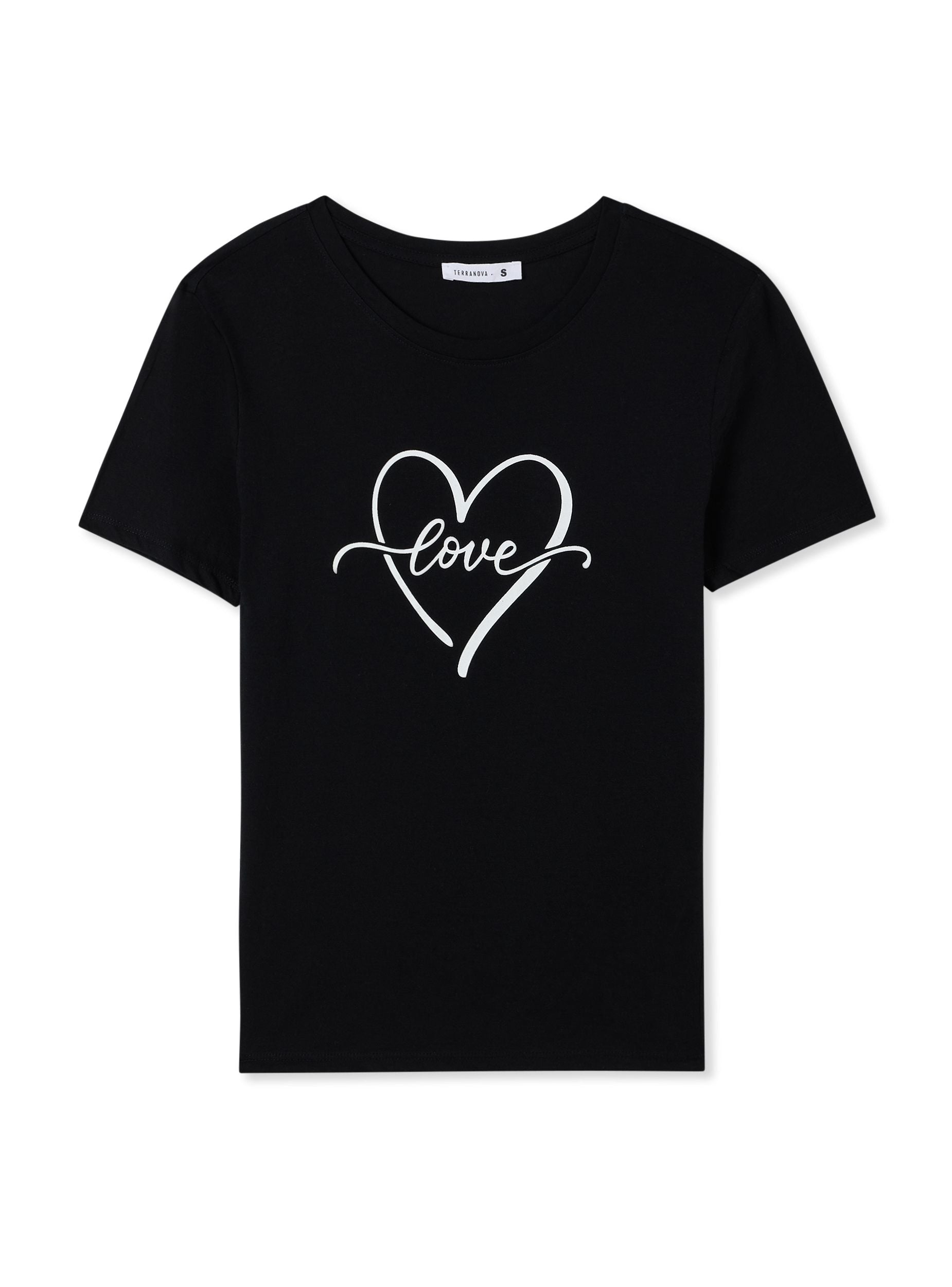 Dámské tričko s kulatým výstřihem a krátkými rukávy, ozdobené jemným potiskem stylizovaného srdce uprostřed s nápisem "love", který prochází designem. Tento kousek přidává romantický a ležérní nádech k outfitu, ideální pro kombinaci s džínami nebo sukněmi pro jednoduchý, ale efektivní vzhled.Detaily
