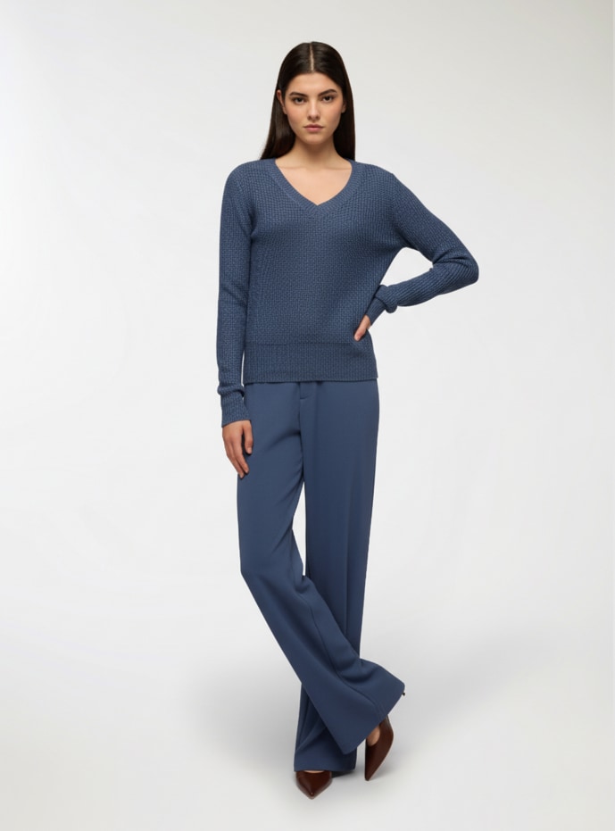 Dámské dlouhé kalhoty s širokým střihem, ideální pro ležérní a všestranný vzhled. Elastický pas zajišťuje pohodlí po celý den. Perfektní k nošení s košilemi nebo topy pro kancelářské nebo volnočasové outfity, tyto kalhoty zvýrazňují siluetu měkkou a moderní linií v jednobarevném provedení.