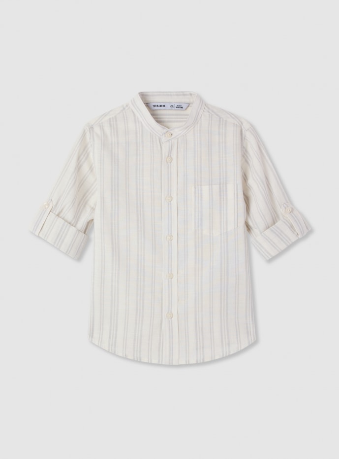 Chlapeřská proužkovaná košile s korejským límečkem a zapínáním vpředu. Dlouhé rukávy s manžetou upevněnou páskem a knoflíkem, náprsní kapsa a zaoblený spodní lem. Látka s efektem lnu. Ideální pro zvláštní příležitosti nebo casual chic vzhled s chino kalhotami a mokasíny, skvělá také k džínám a teniskám.