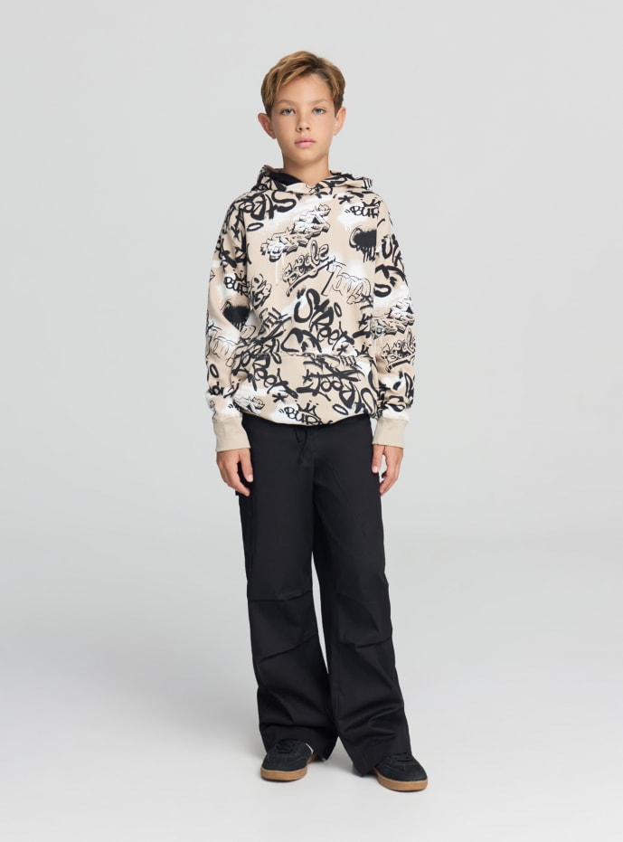 Dětská těžká mikina s kapucí, zdobená celoplošným graffiti potiskem. Ideální pro ležérní a moderní vzhled, perfektní pro volný čas nebo k doplnění streetwearového outfitu. Pohodlný střih a atraktivní design s detaily, které ji činí jedinečnou a módní.