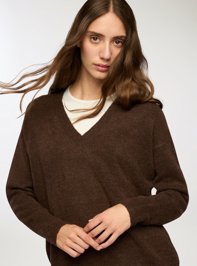 Dámský svetr s výstřihem do V a volným střihem. Ideální pro ležérní a univerzální vzhled, skvěle se hodí k džínům nebo kalhotám pro pohodlný a módní outfit. Dlouhé rukávy a jednoduchý design ji činí vhodnou pro různé příležitosti, od volného času po pracovní dny v kanceláři. Perfektní pro ty, kdo hledají praktický a stylový kousek.