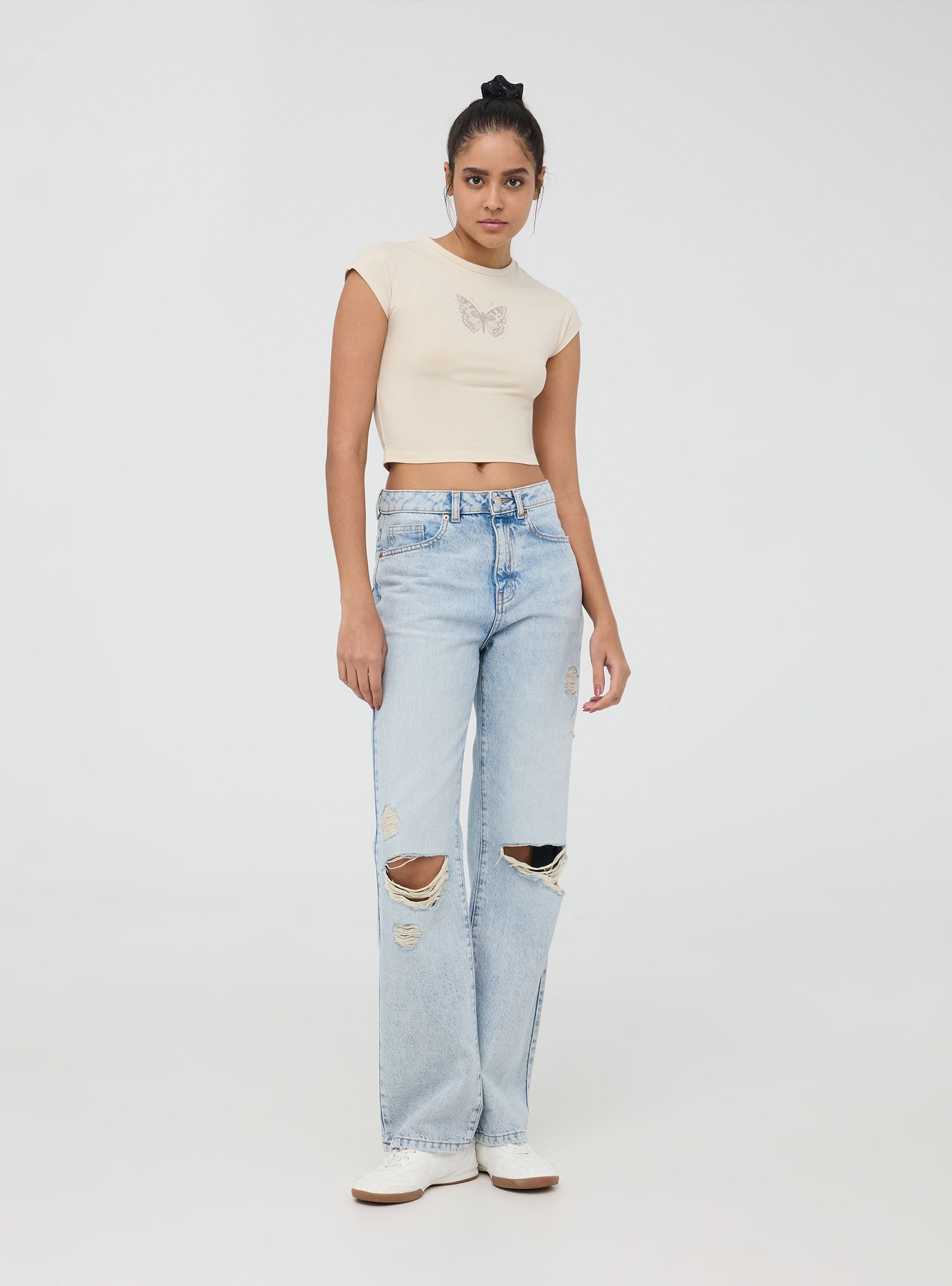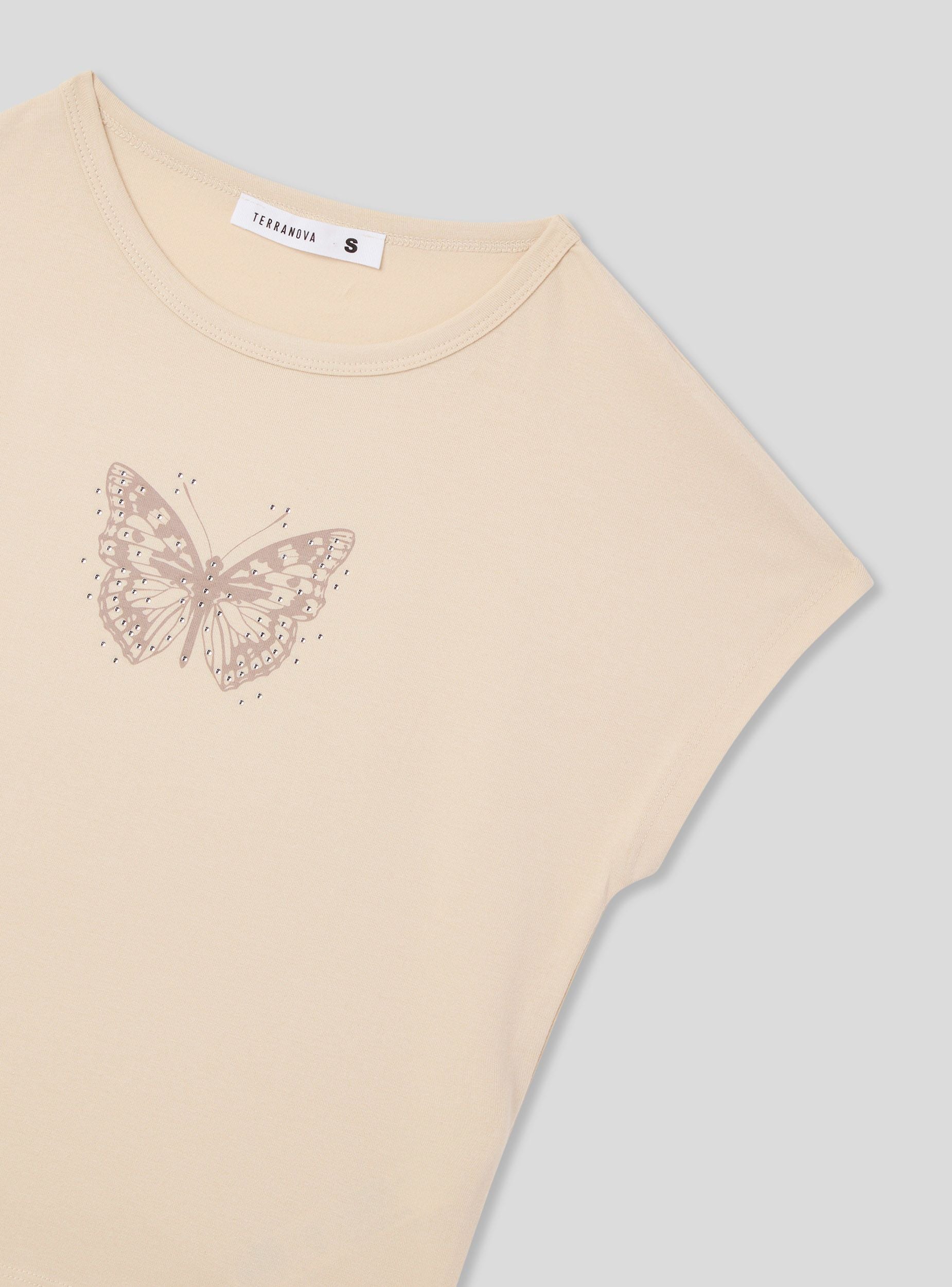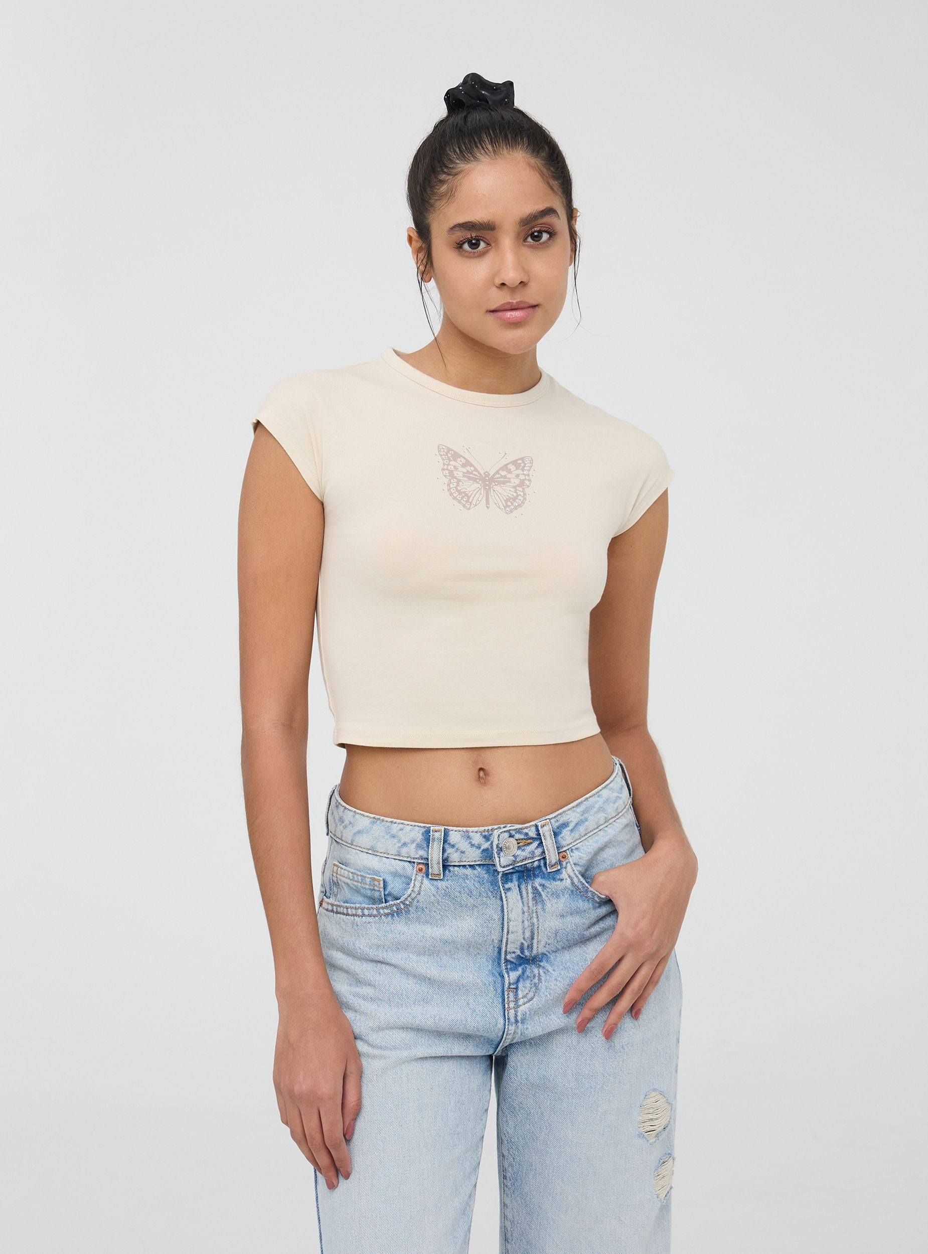 Damen-Crop-Top mit einem ansprechenden Design, das durch einen Schmetterlingsdruck auf der Vorderseite gekennzeichnet ist. Der Schmetterling ist mit Strass-Applikationen verziert, die dem Kleidungsstück einen funkelnden Touch verleihen und es einzigartig machen. Die kurzen Ärmel sorgen für Komfort und Frische, während der kurze Schnitt es perfekt für trendige und lässige Kombinationen macht und die Silhouette stilvoll betont. Dieses Modell vereint zarte Details mit einer modernen Passform.Details