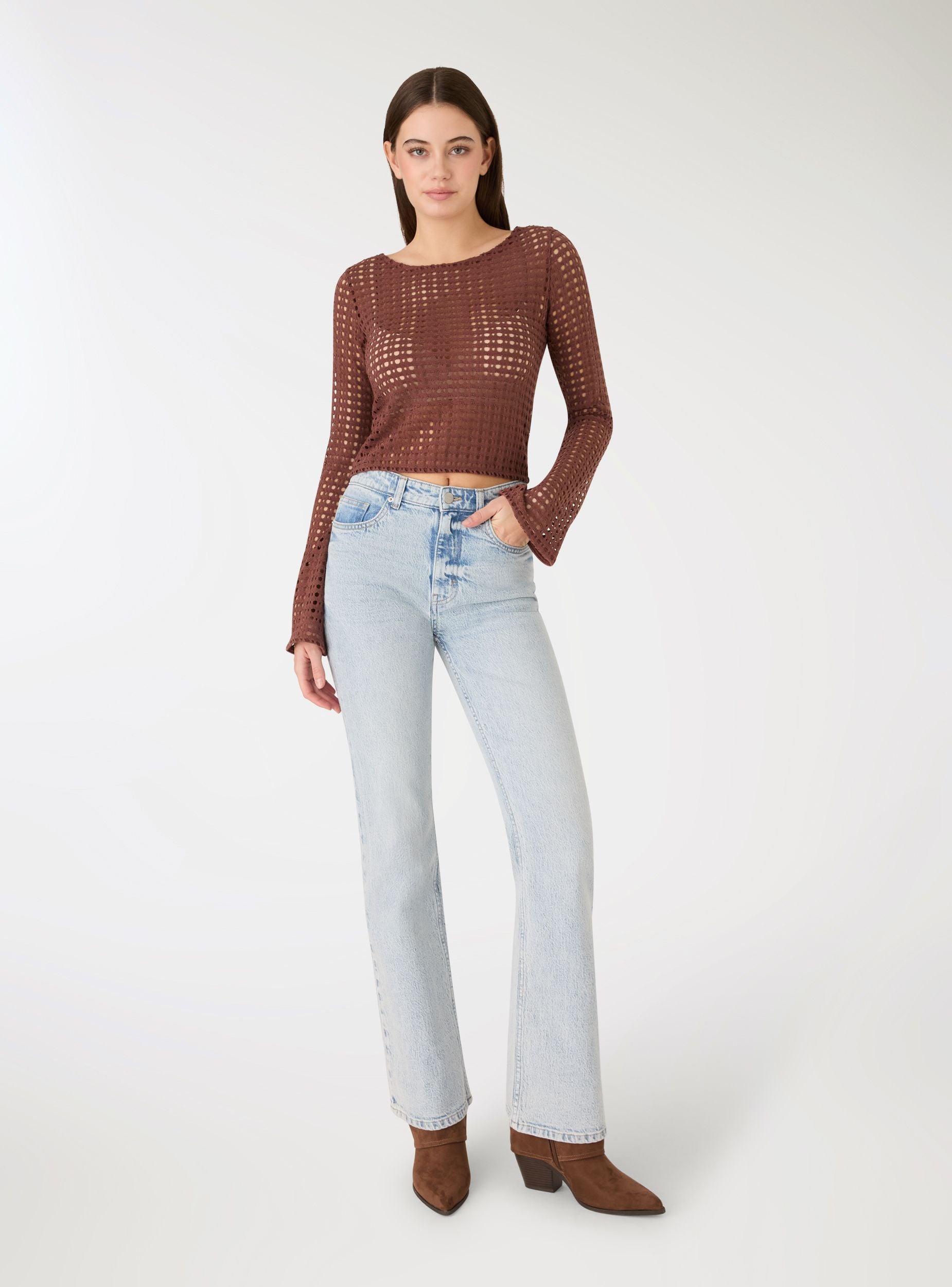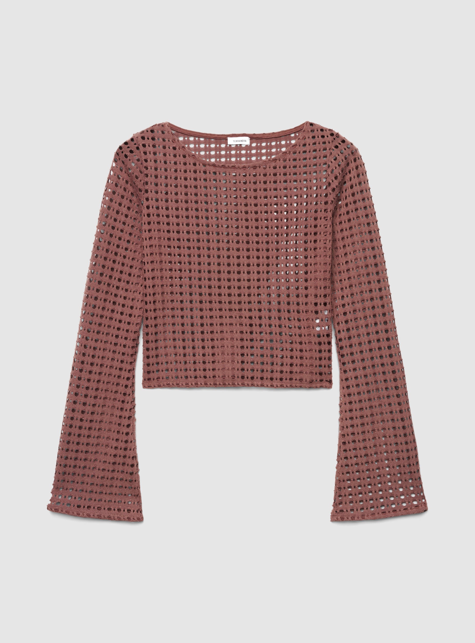 Einfarbiges, durchbrochenes Damen-Crop-Top, ideal für sommerliche Looks und das Schichten über Tops oder Bralettes. Das Design mit weitem U-Boot-Ausschnitt und langen Glockenärmeln verleiht einen raffinierten Touch und betont die Silhouette. Lässt sich leicht mit Jeans, hoch taillierten Hosen oder Röcken für Ausflüge und Freizeit kombinieren.Details