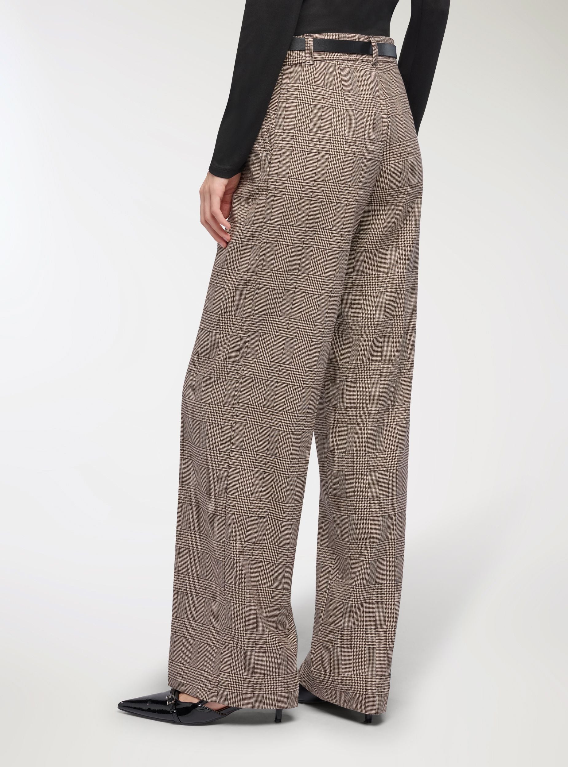Damenhose mit Glencheck-Muster, weiter Schnitt und geradem Bein, das weich bis zum Knöchel fällt. Modell mit Gürtelschlaufen und Gürtel, vordere Verschluss mit Knopf und Reißverschluss, seitliche französische Taschen. Perfekt fürs Büro mit Hemd und Blazer oder für die Freizeit mit T-Shirt und Sneakers, verleiht jedem Look eine raffinierte Note.