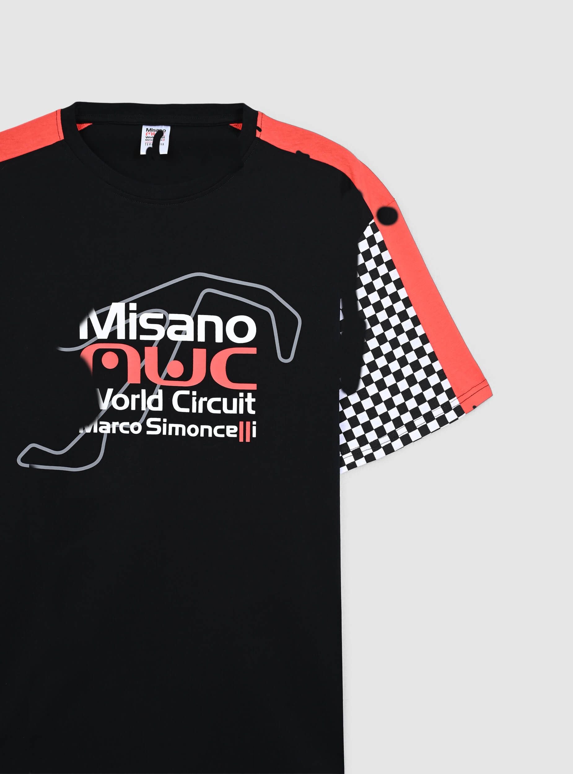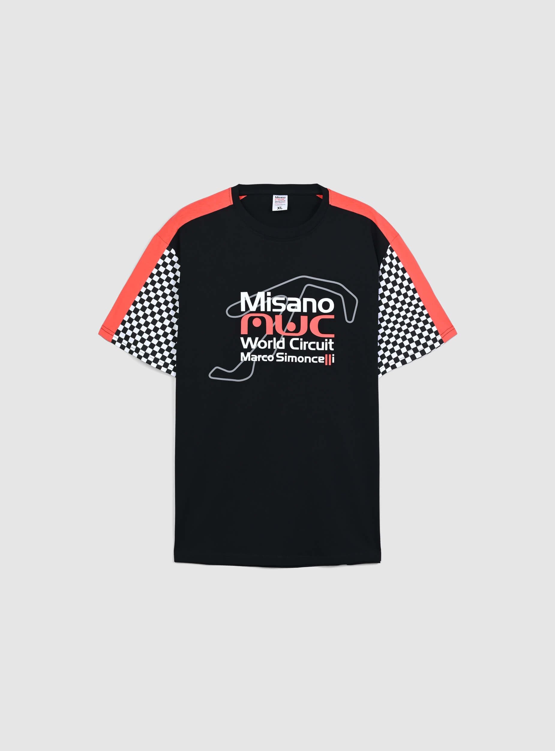 Herren T-Shirt aus Baumwolle mit kurzen Ärmeln und Rundhalsausschnitt. Das Design zeigt einen Druck, der dem Misano World Circuit gewidmet ist, mit karierten Details an den Ärmeln. Perfekt für Sportveranstaltungen, Freizeit oder dynamische Looks. Lässt sich leicht mit Jeans, Jogginghosen oder Shorts für ein lässiges und charaktervolles Outfit kombinieren.Details