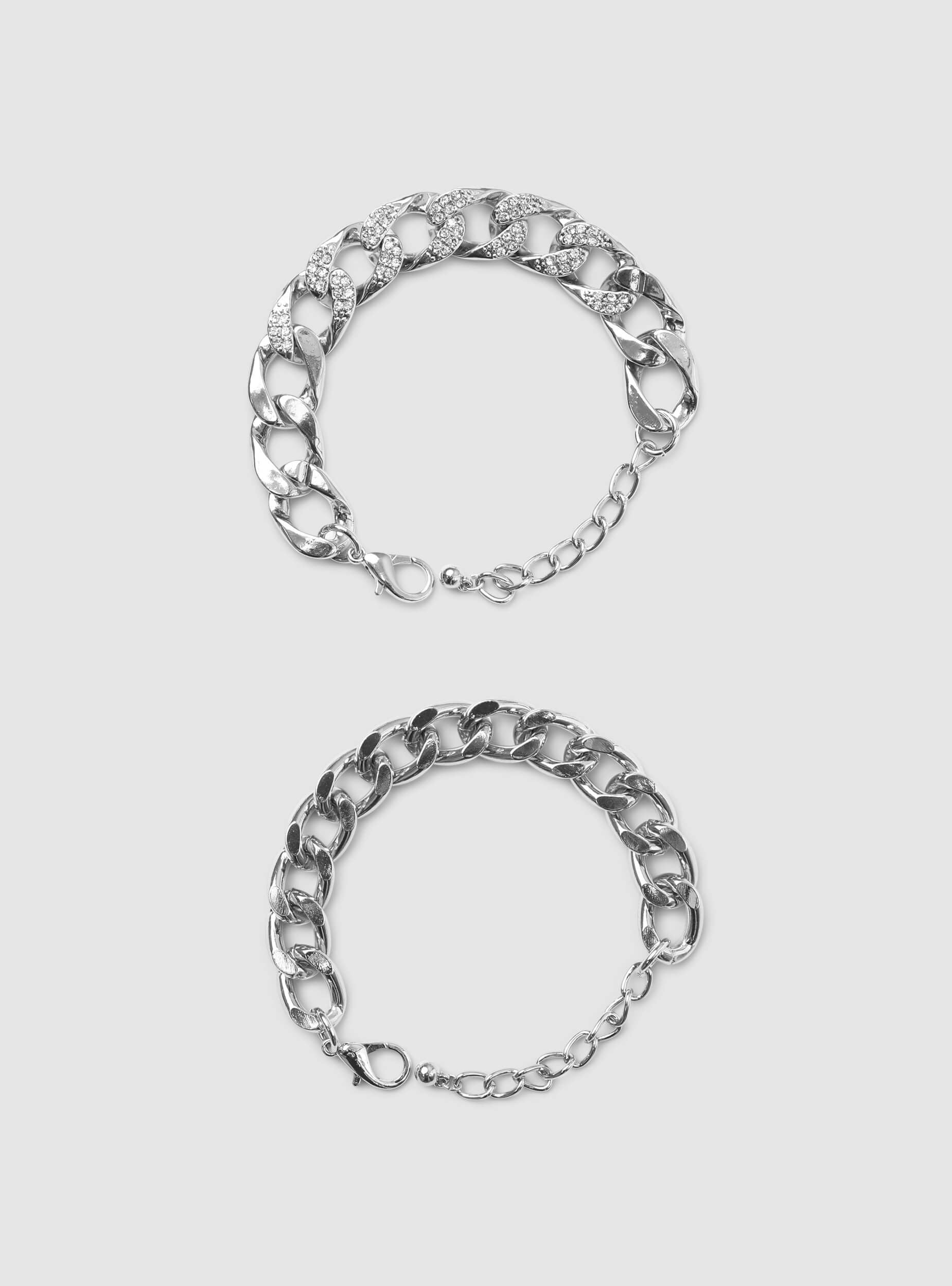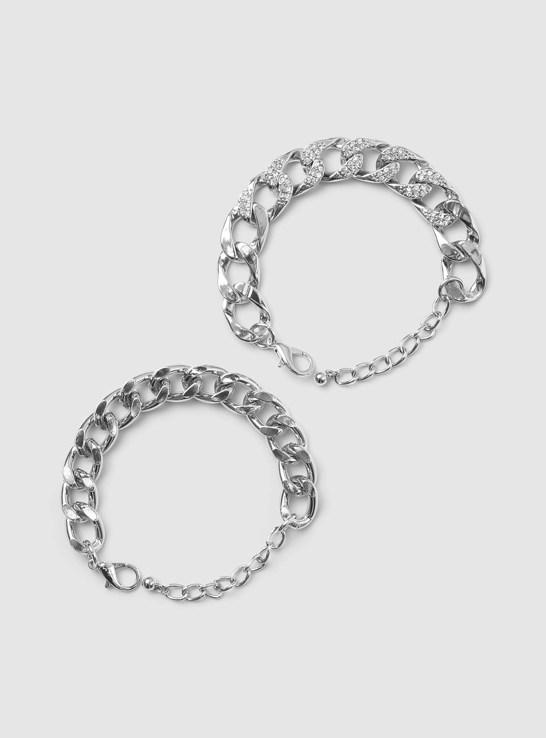 Verpackung bestehend aus 2 Damenarmbändern mit Kettendesign, ideal um jedem Look einen Hauch von Charakter und Stil zu verleihen. Ein Modell hat breite und glatte Glieder, mit einem essentiellen und zeitgenössischen Charme, während das andere mit funkelnden Strasssteinen verziert ist, perfekt für einen Hauch von Eleganz. Vielseitig und einfach zu kombinieren, können sie separat oder zusammen für einen markanteren Effekt getragen werden. Nickel frei.