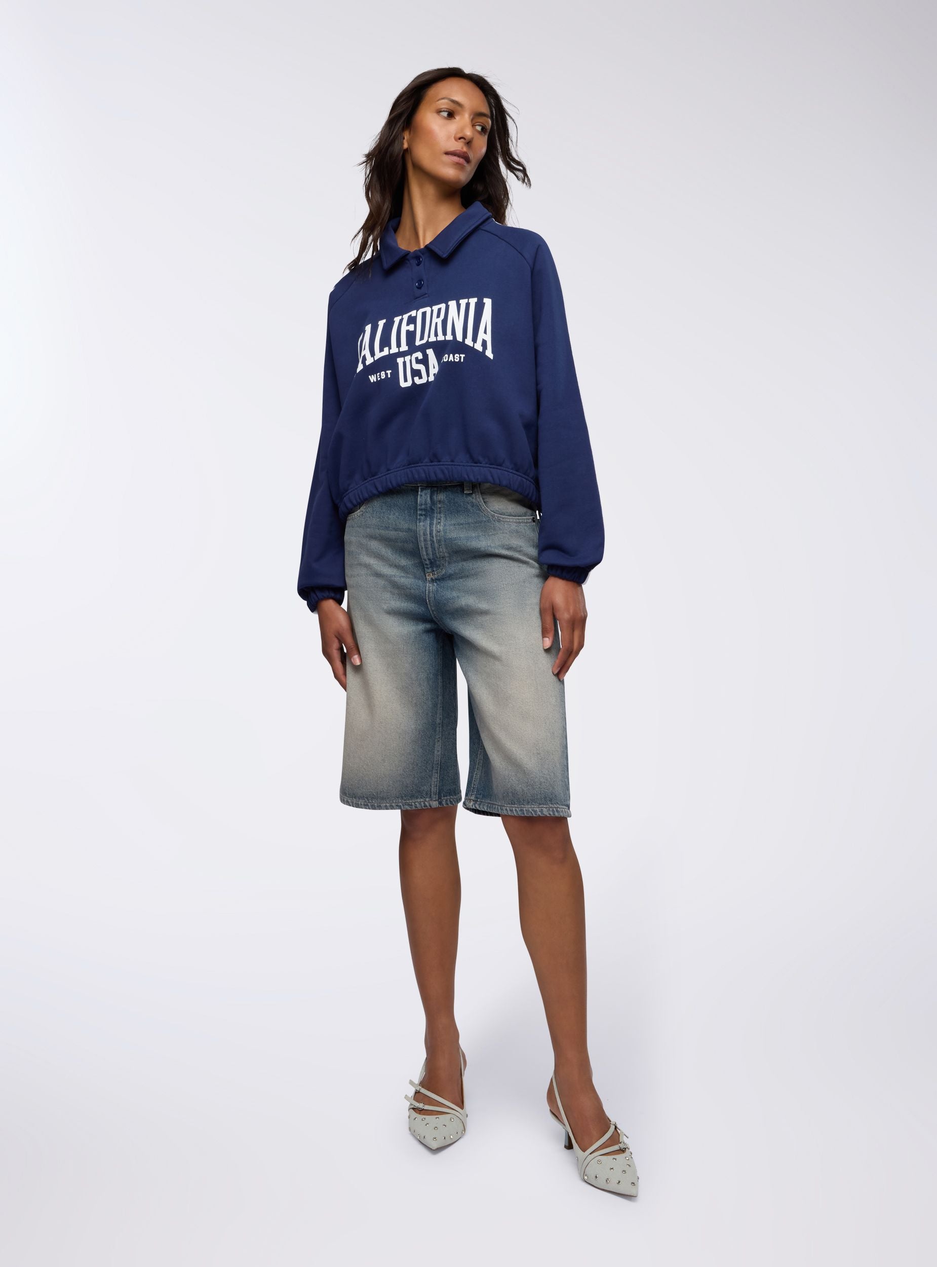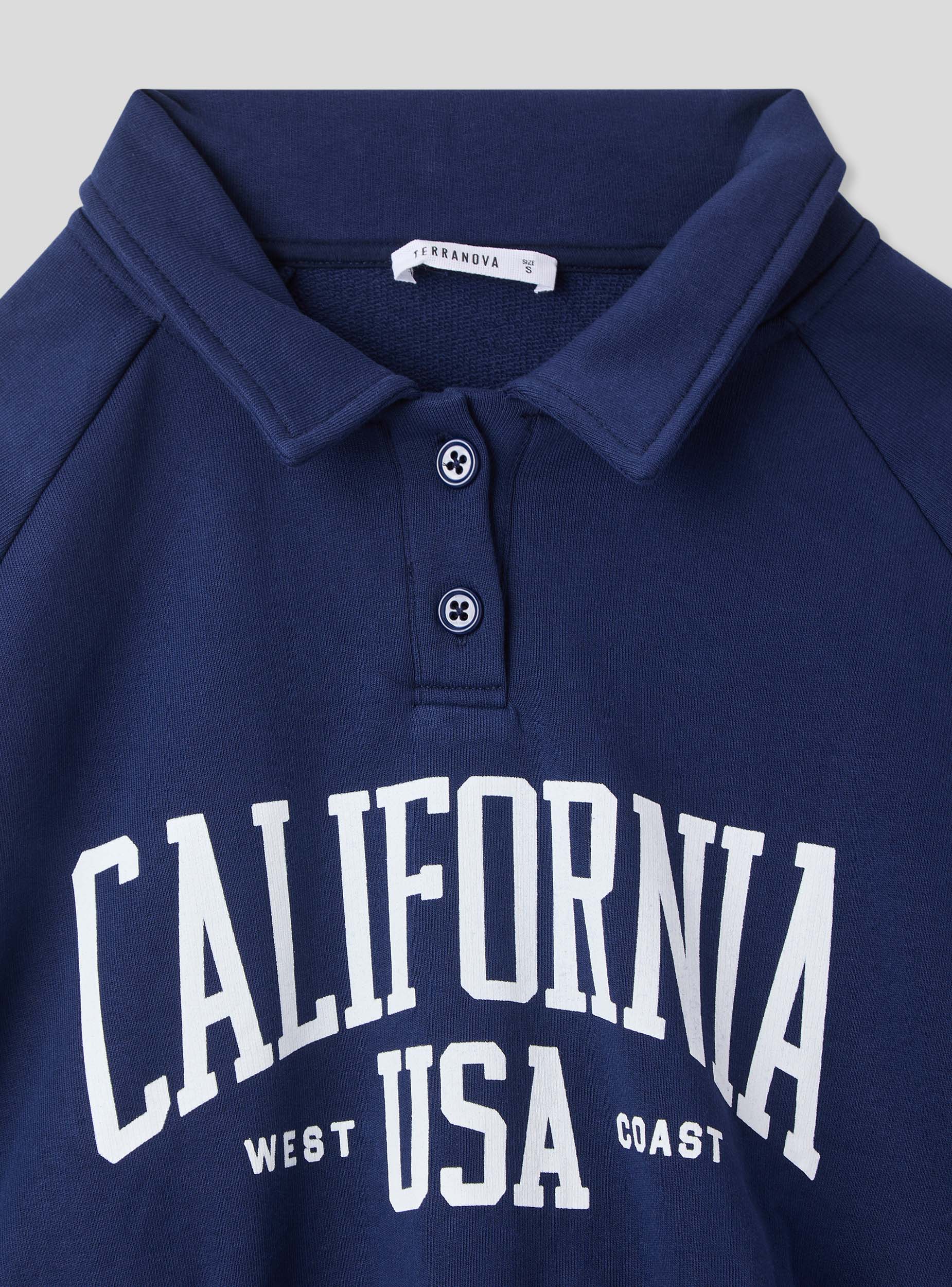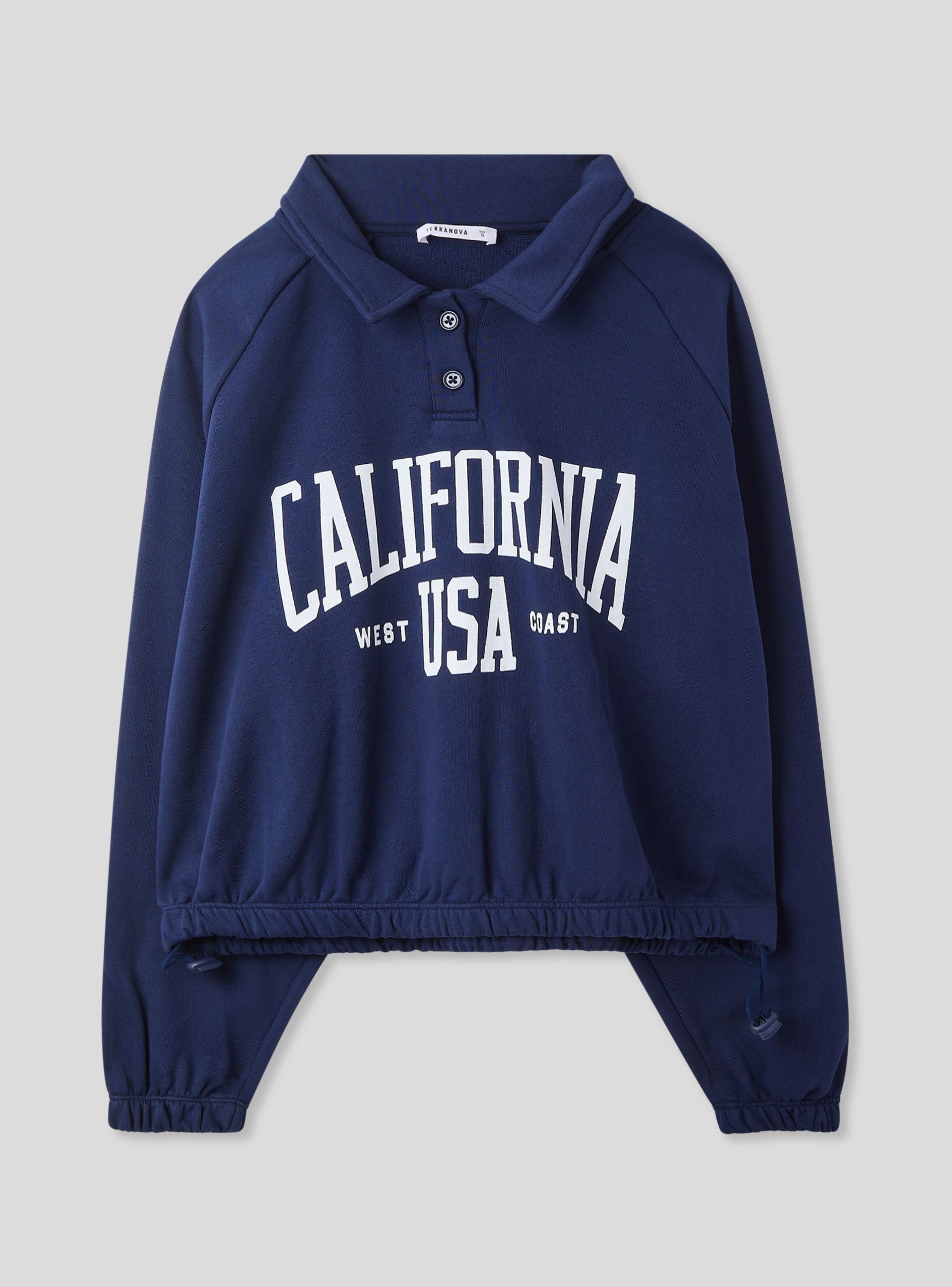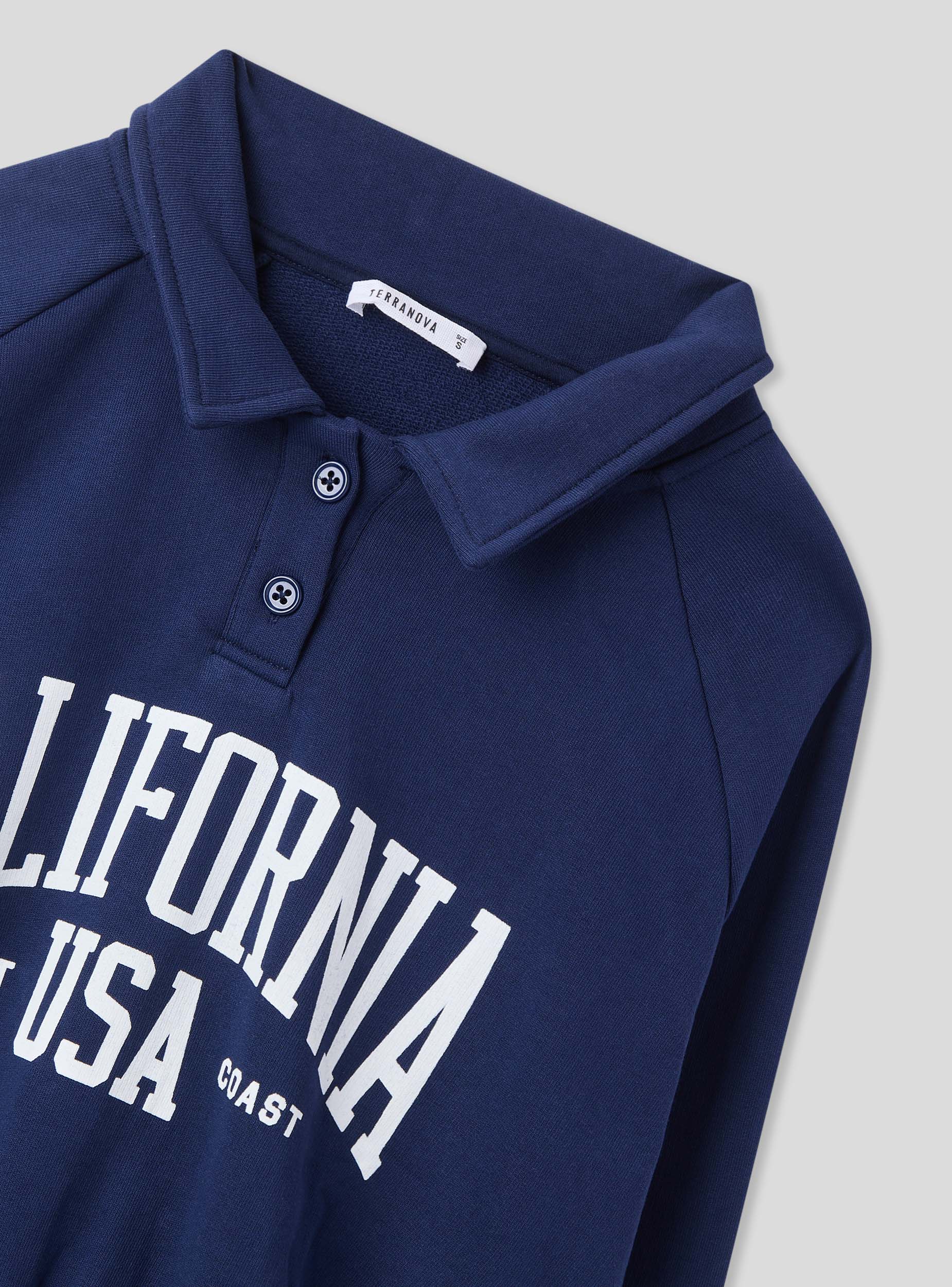 Leichte Damen-Fleecejacke, ideal für einen lässigen und sportlichen Look. Perfekt für die Freizeit, lässt sie sich leicht mit Jeans oder Jogginghosen kombinieren für ein bequemes und modisches Outfit. Das College-Print-Design verleiht einen urbanen Stil, während der Polo-Kragen mit Knöpfen und die Stopper am Saum Praktikabilität und Vielseitigkeit garantieren. Ein Teil, das Komfort und Trend für jeden Anlass vereint.Details