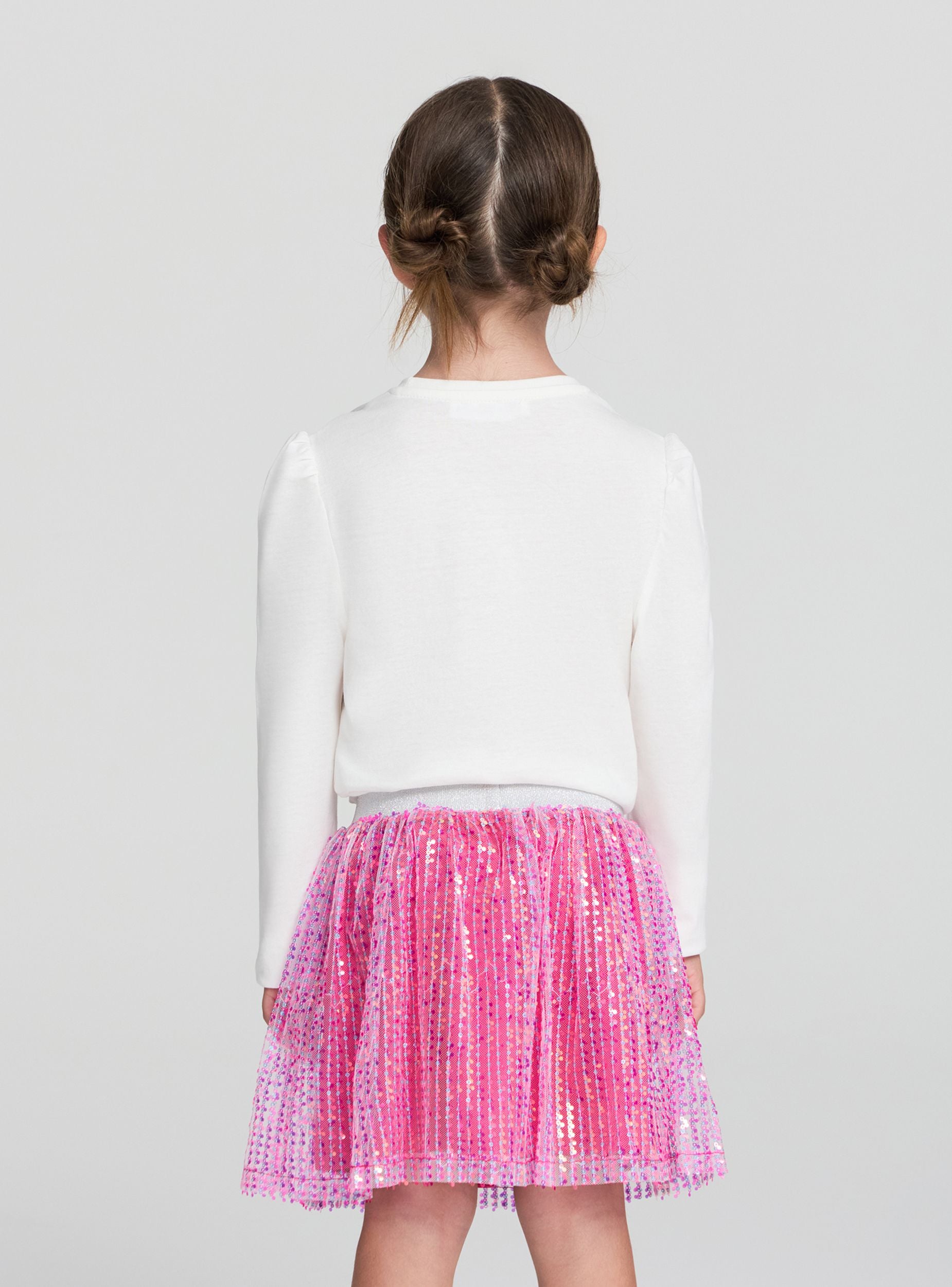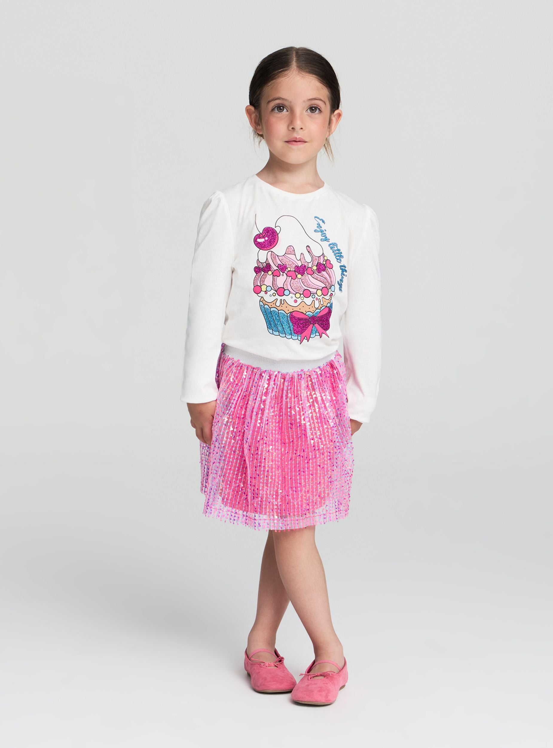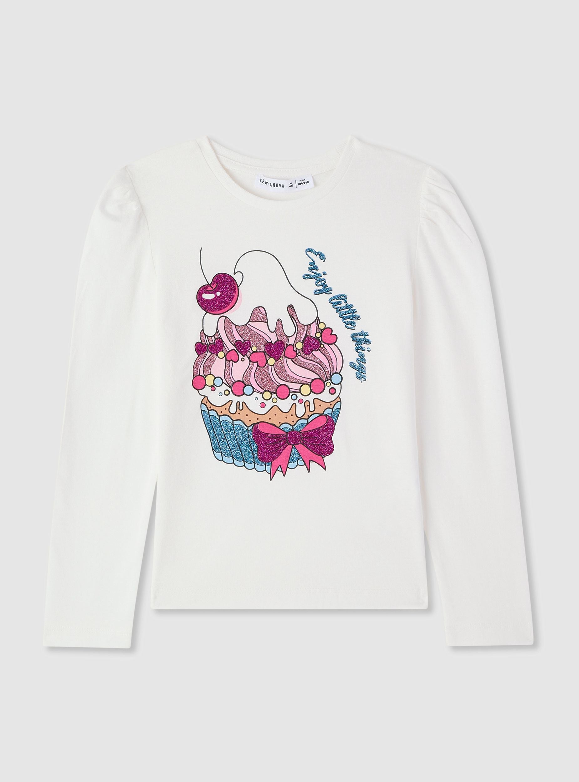 Langärmeliges Mädchen-T-Shirt mit Raffungen an den Schultern und einem lebhaften Aufdruck eines Cupcakes, verziert mit glitzernden Details und dem Schriftzug „Enjoy little things“. Ideal für einen lässigen, fröhlichen und farbenfrohen Look, passt es perfekt zu Jeans oder sportlichen Hosen für ein bequemes und fröhliches Outfit. Die reguläre Passform und das ansprechende Design machen es ideal für die Freizeit und Spieltage.Details