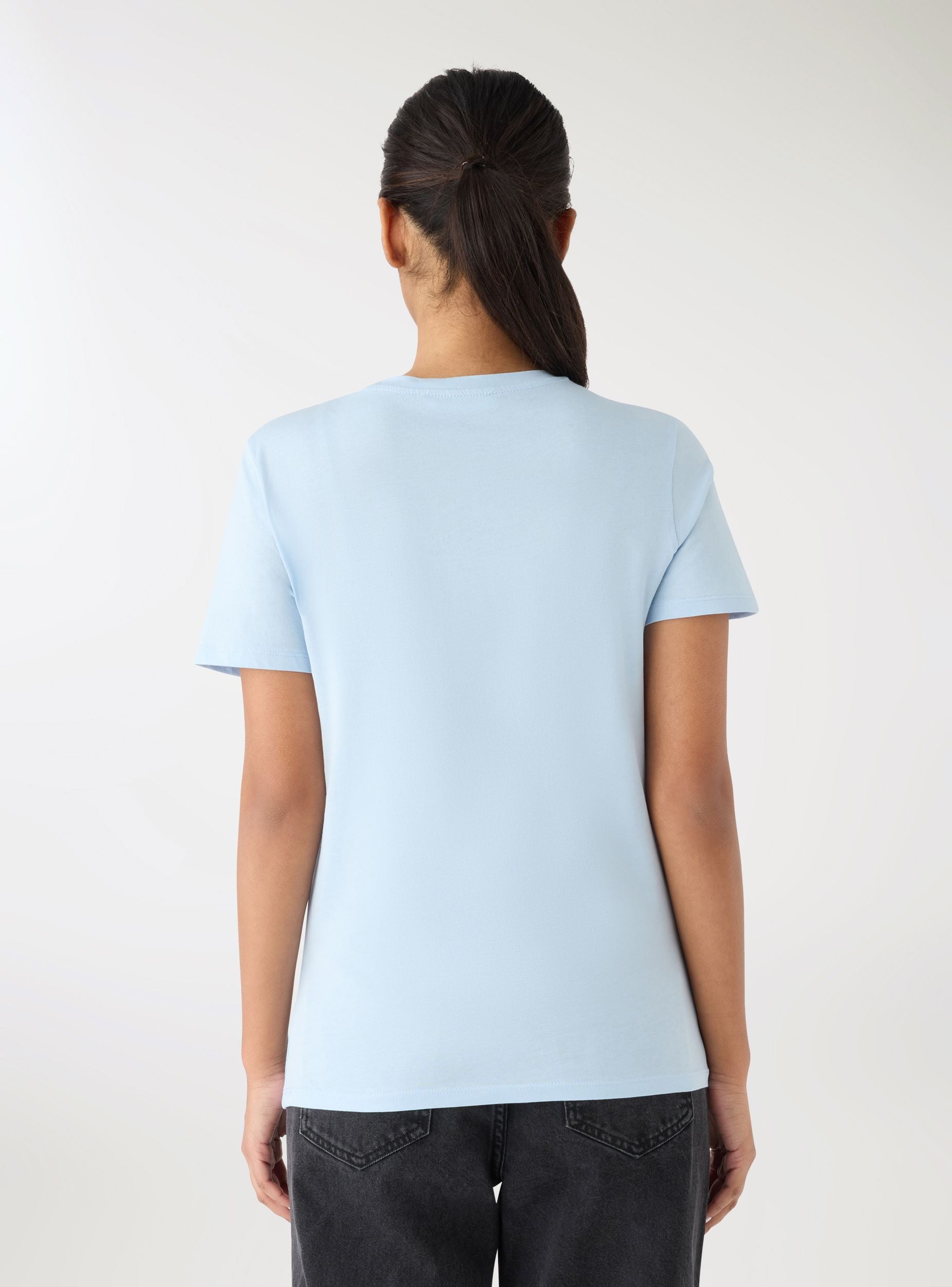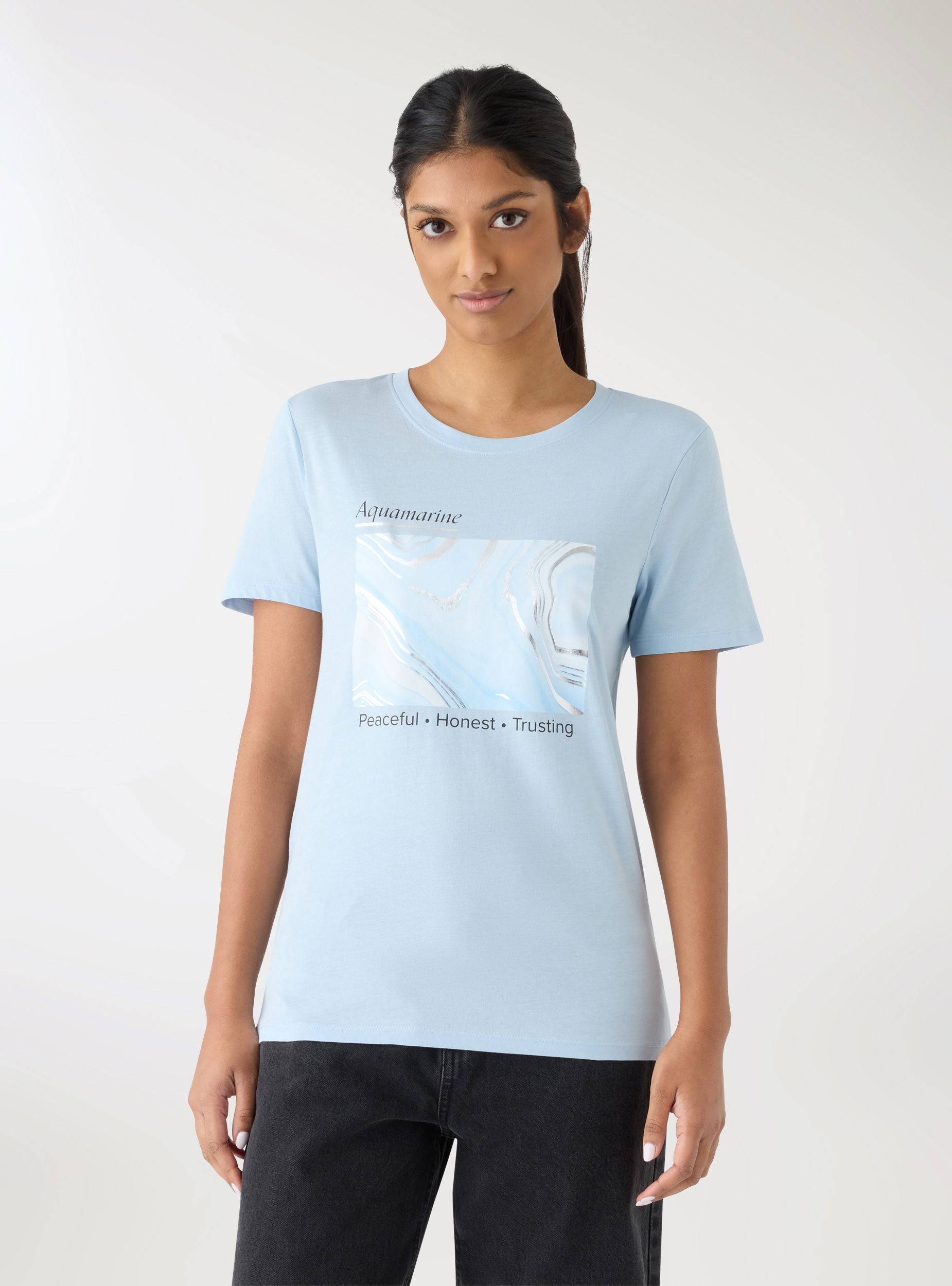 Damen-T-Shirt mit mineralischem Frontdruck und glitzernden Details. Rundhalsausschnitt, kurze Ärmel und eine reguläre Passform, perfekt für die Freizeit. Lässt sich leicht mit Jeans oder Röcken für einen lässigen Look kombinieren und kann unter leichten Jacken oder zipfreien Sweatshirts getragen werden. Das schlichte Design hebt die Grafik mit Schriftzug hervor und macht es ideal für den Alltag.Details