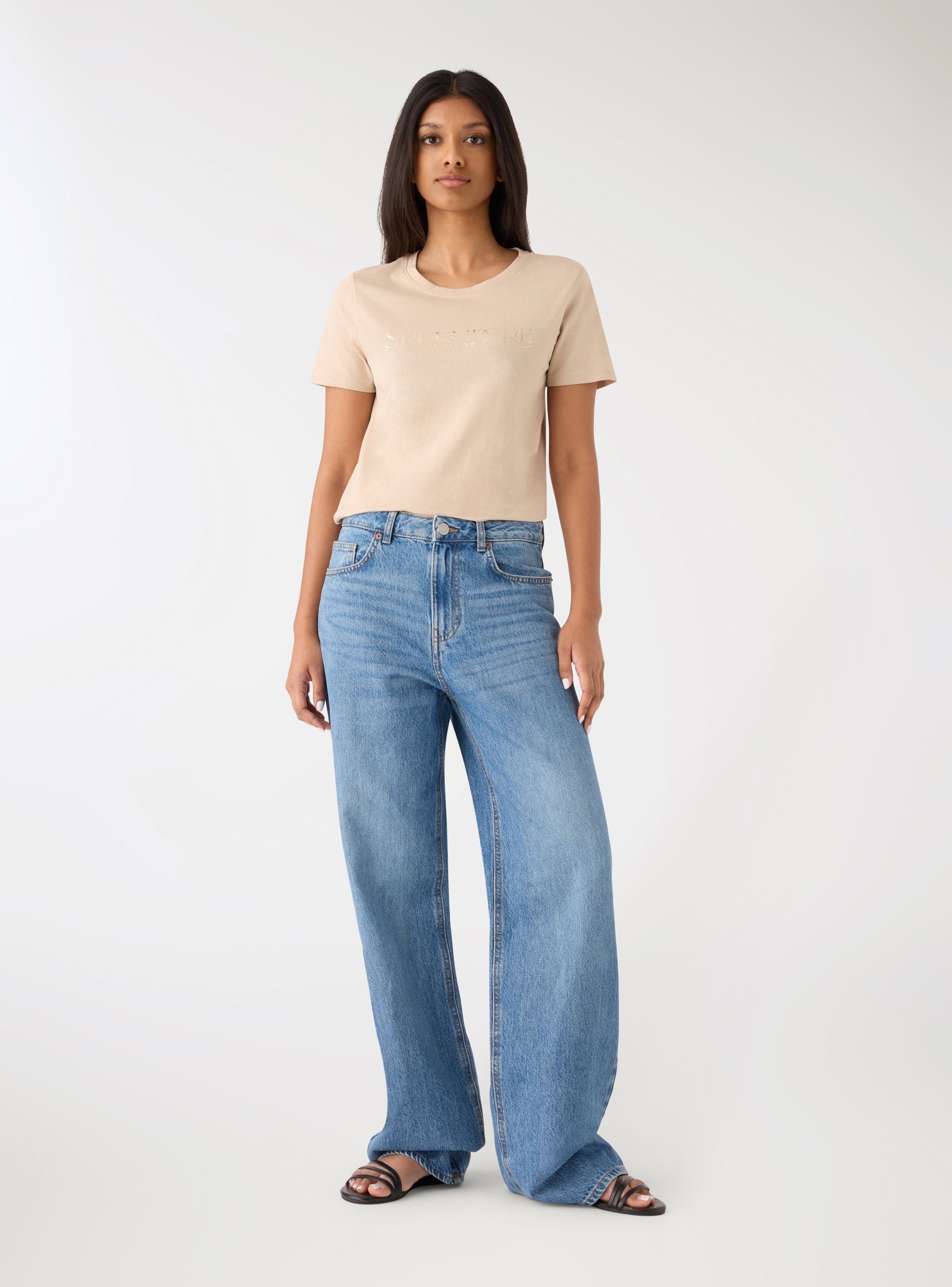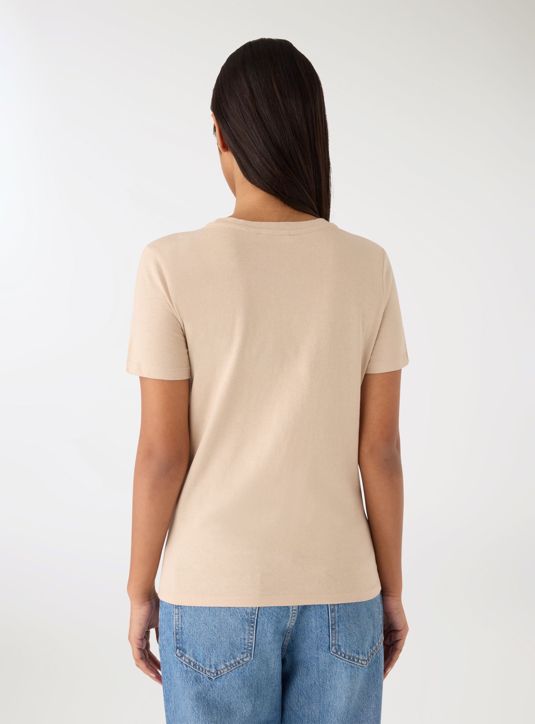 Damen-T-Shirt mit kurzen Ärmeln, Rundhalsausschnitt und regulärer Passform. Auf der Vorderseite befindet sich ein dekorativer Schriftzug mit glänzendem Effekt, ideal für lässige und urbane Looks. Leicht kombinierbar mit Jeans oder Röcken und zum Tragen unter leichten Jacken geeignet. Perfekt für den Alltag. Design mit Schriftzug, der deinem Outfit einen glänzenden Akzent verleiht.Details