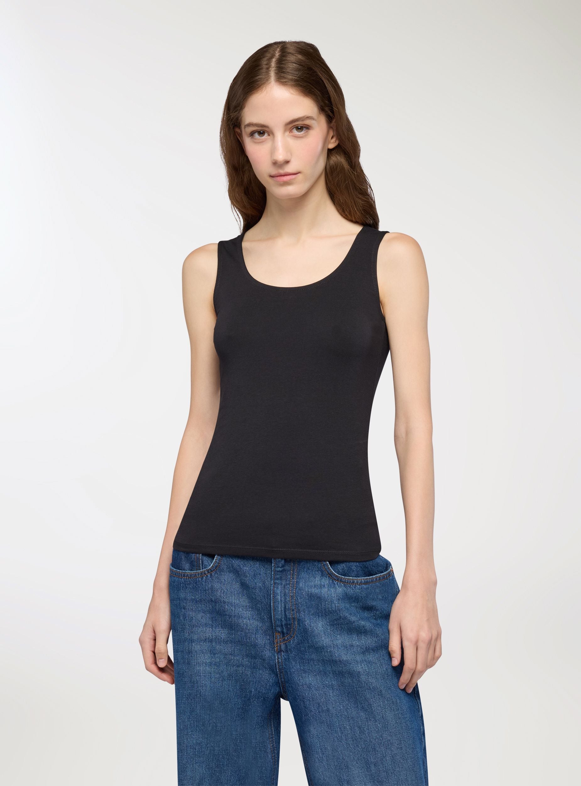 Pack bestehend aus zwei Damen-Tanktops, gefertigt aus weichem, elastischem Baumwollstoff in Uni-Farbe. Jedes Tanktop bietet außergewöhnlichen Komfort dank der Atmungsaktivität und Weichheit der Baumwolle, ideal für den täglichen Gebrauch. Das ärmellose Design und die enganliegende Passform betonen die Silhouette und machen sie perfekt zum Tragen sowohl allein als auch unter anderen Kleidungsstücken. Fügen Sie Ihrem Kleiderschrank Vielseitigkeit mit diesem praktischen Zweierpack Basic-Tanktops hinzu.Details