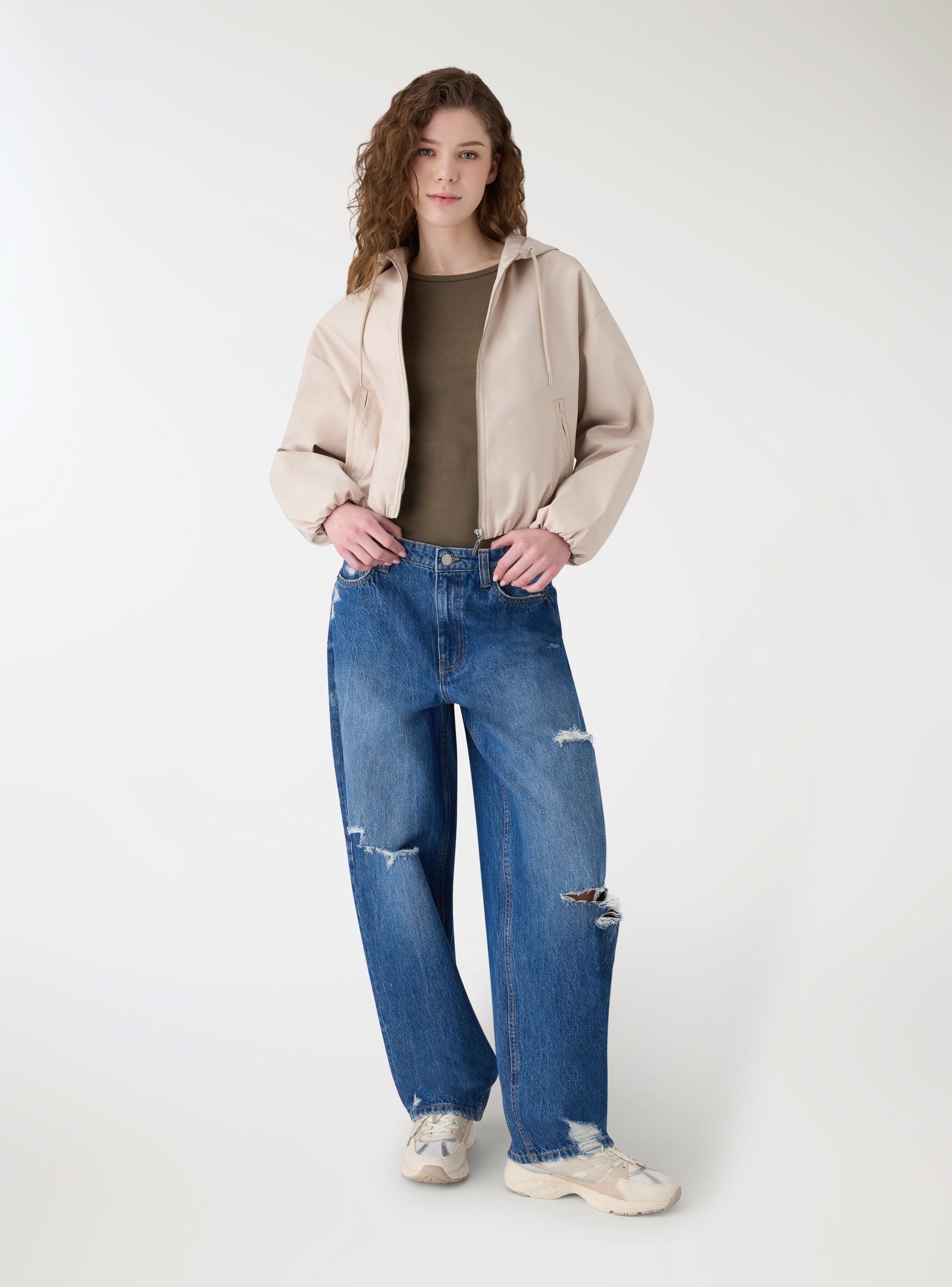 Damen-Windjacke mit Kapuze, ideal für einen urbanen und lässigen Look. Kurzes Modell mit elastischem Saum und Bündchen, Frontreißverschluss. Seitliche Eingrifftaschen. Perfekt über T-Shirt und Jeans oder zu Leggings in der Freizeit, schützt vor leichtem Wind und rundet das Outfit der Übergangszeit mit einem modernen, einfarbigen Akzent ab.Details
