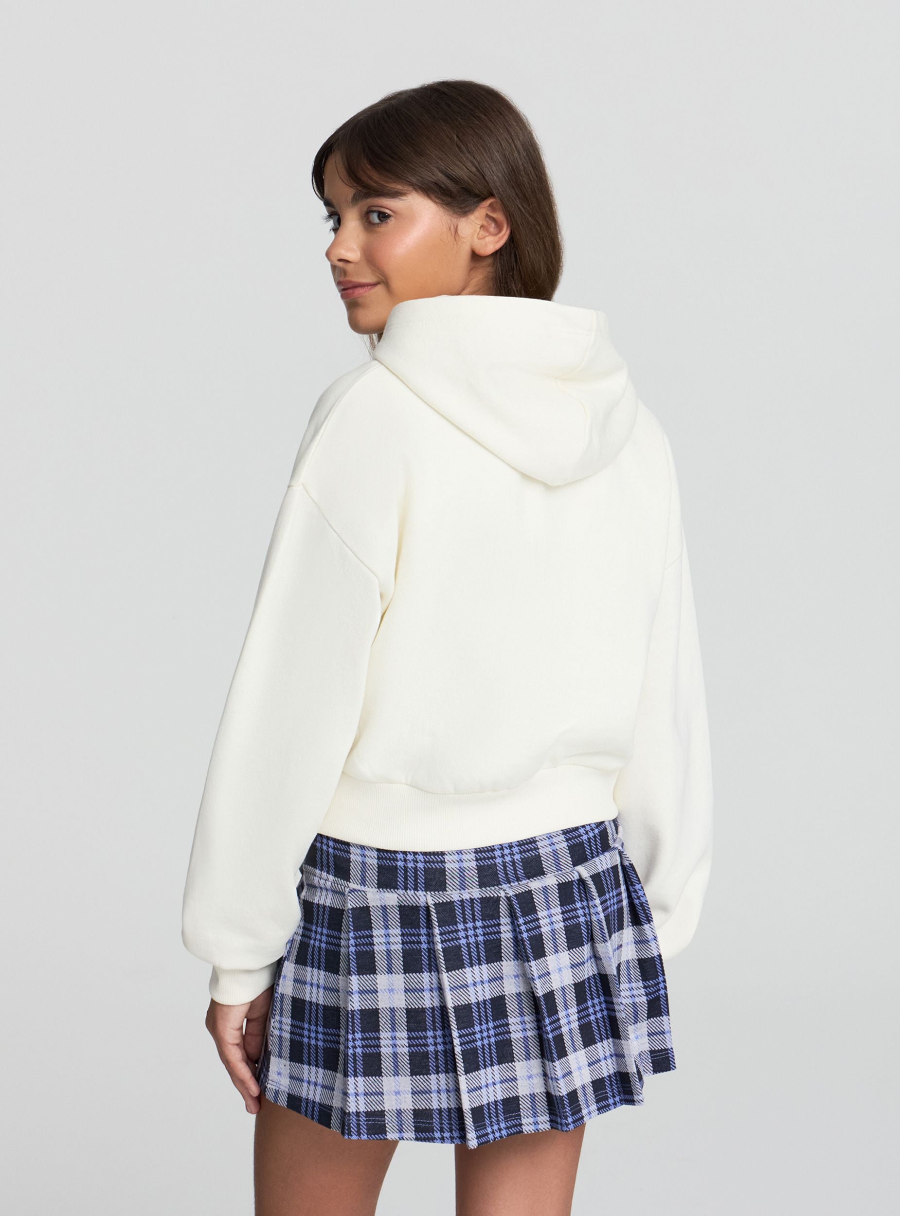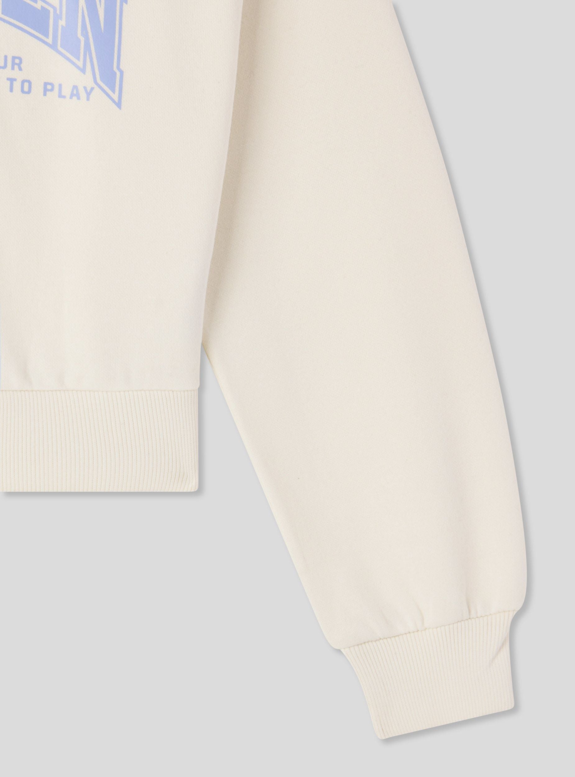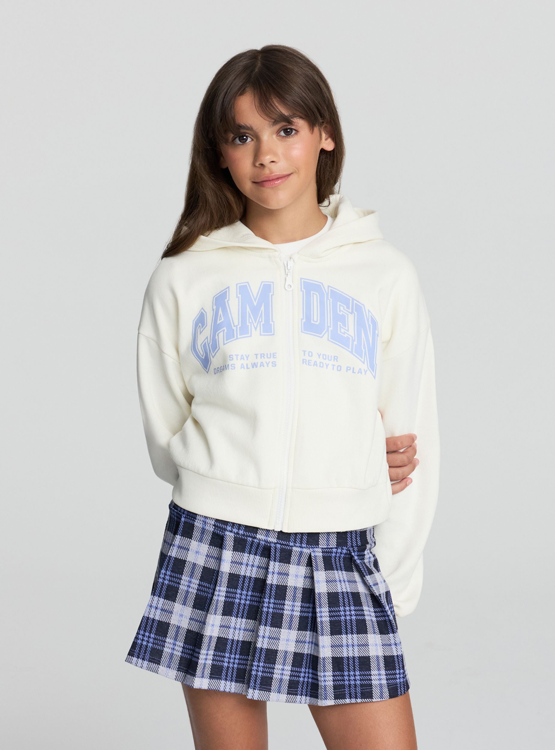 Schwere Kapuzenjacke für Mädchen, gekennzeichnet durch eine cropped Passform und einen Reißverschluss vorne. Das Design zeigt einen amerikanischen College-Style-Druck auf der Vorderseite, ideal, um einen trendigen Akzent zu alltäglichen Looks zu setzen. Die langen Ärmel und die elastischen Bündchen sorgen für Komfort und Praktikabilität, perfekt zum Kombinieren mit Jeans oder Sporthosen für die Freizeit oder die Schule.Details