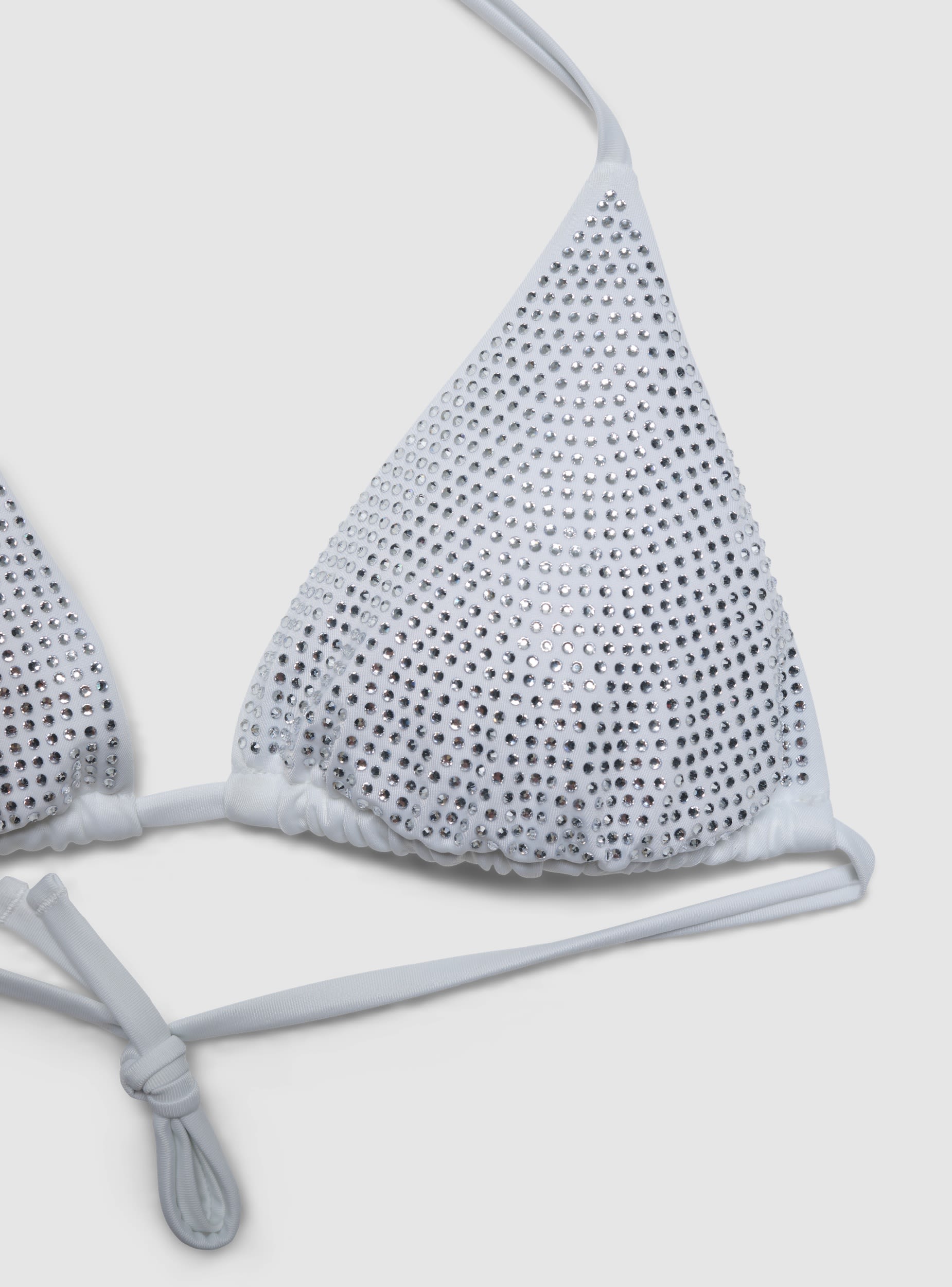 Damen-Bikini-Oberteil in Dreiecksform mit schimmerndem Effekt und Strassapplikationen, ideal für Tage am Strand oder im Schwimmbad. Verstellbare, zum Binden am Hals und Rücken vorgesehene Träger sowie verschiebbare Cups ermöglichen eine individuelle Passform. Perfekt kombinierbar mit passenden Slips und leichten Strandkleidern.Details