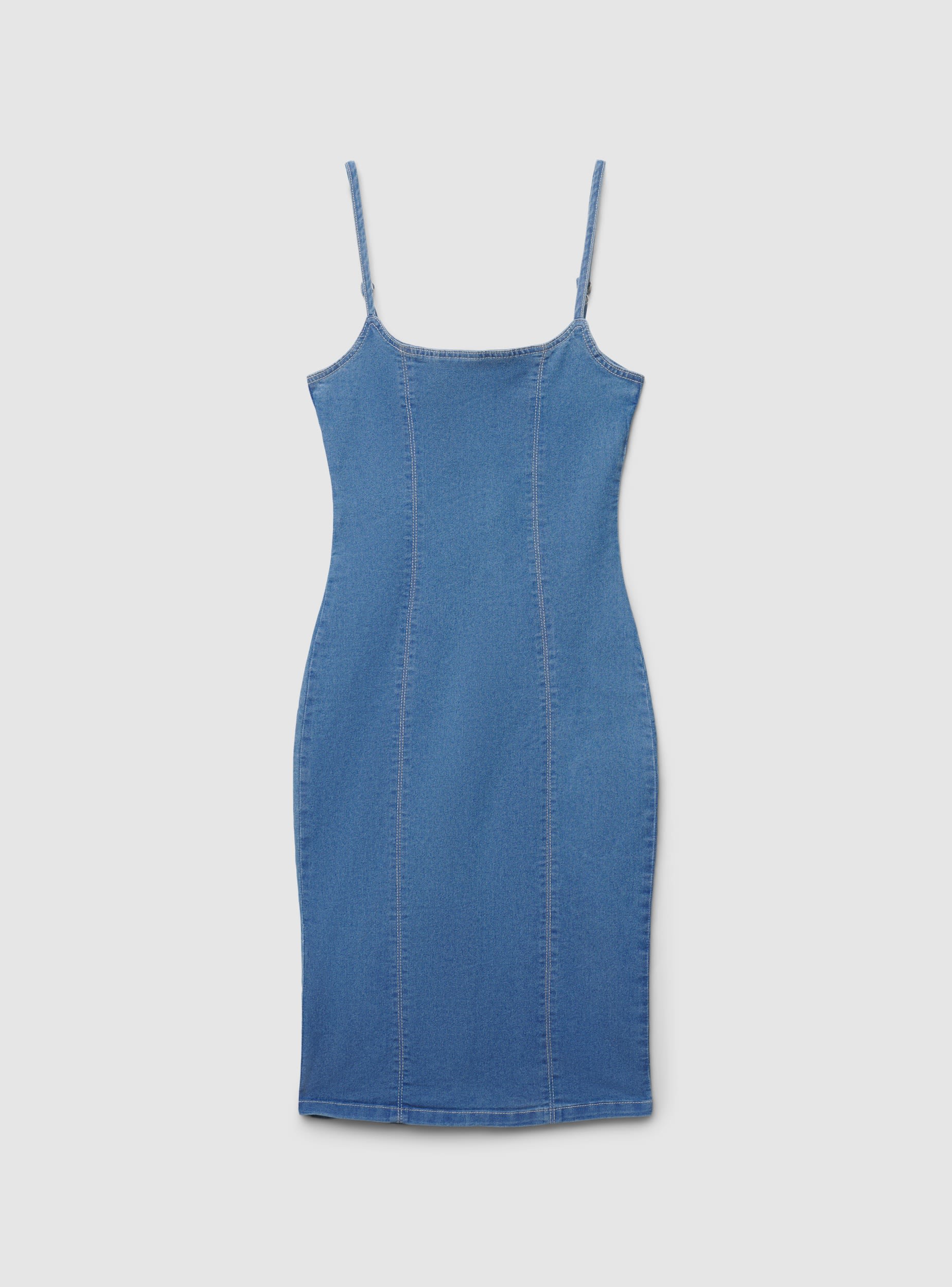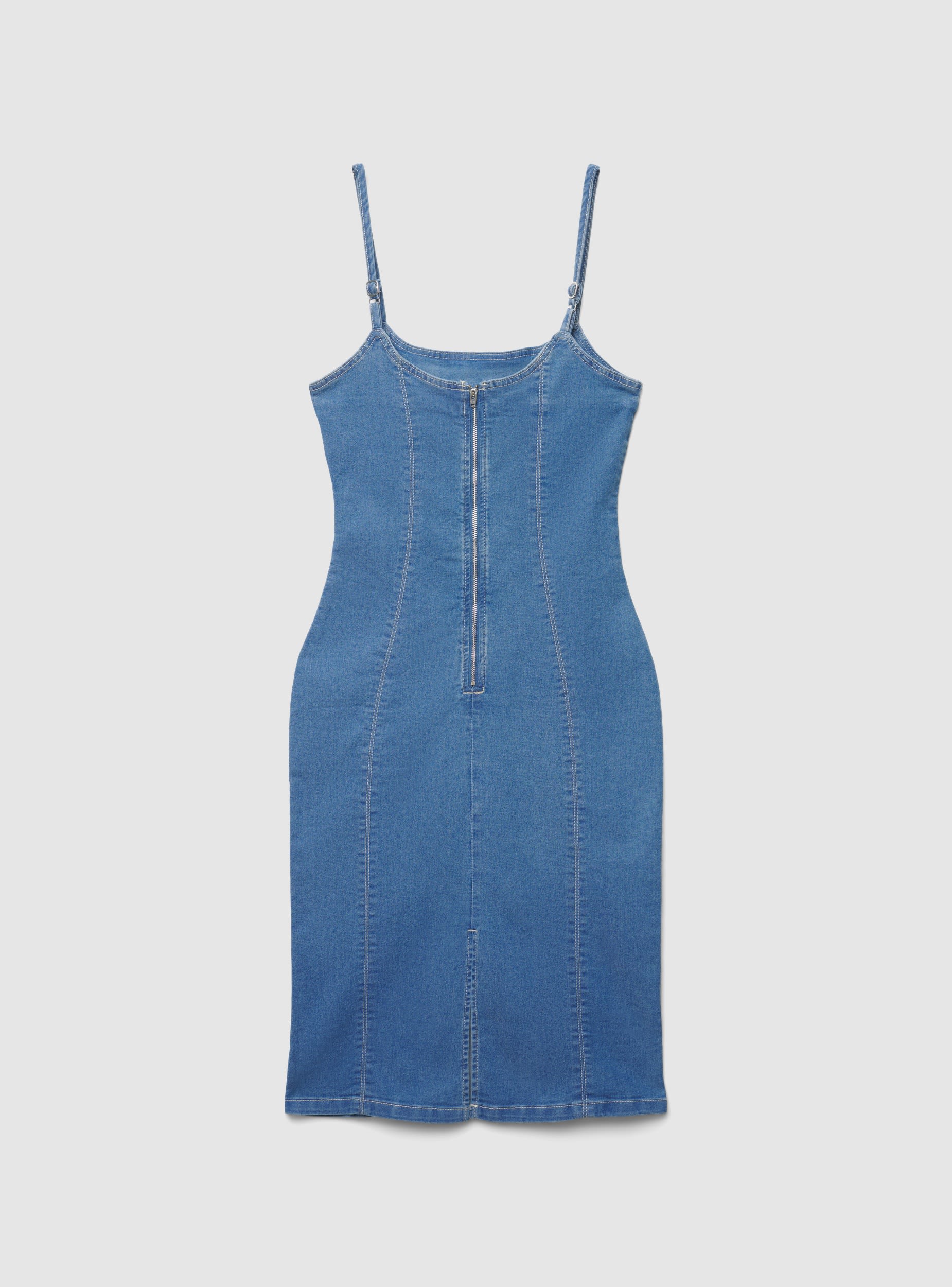 Einfarbiges Damenkleid aus Denim, figurbetonte Etuiform, die die Silhouette betont. Mit verstellbaren dünnen Trägern und rundem Ausschnitt, verfügt es über taillierte Nähte und einen Reißverschluss vorne für einen praktischen Verschluss. Knielang, perfekt für Abende oder Ausflüge in die Stadt. Einfach zu kombinieren mit minimalistischen Sandalen oder Sneakers für einen trendigen Look.Details