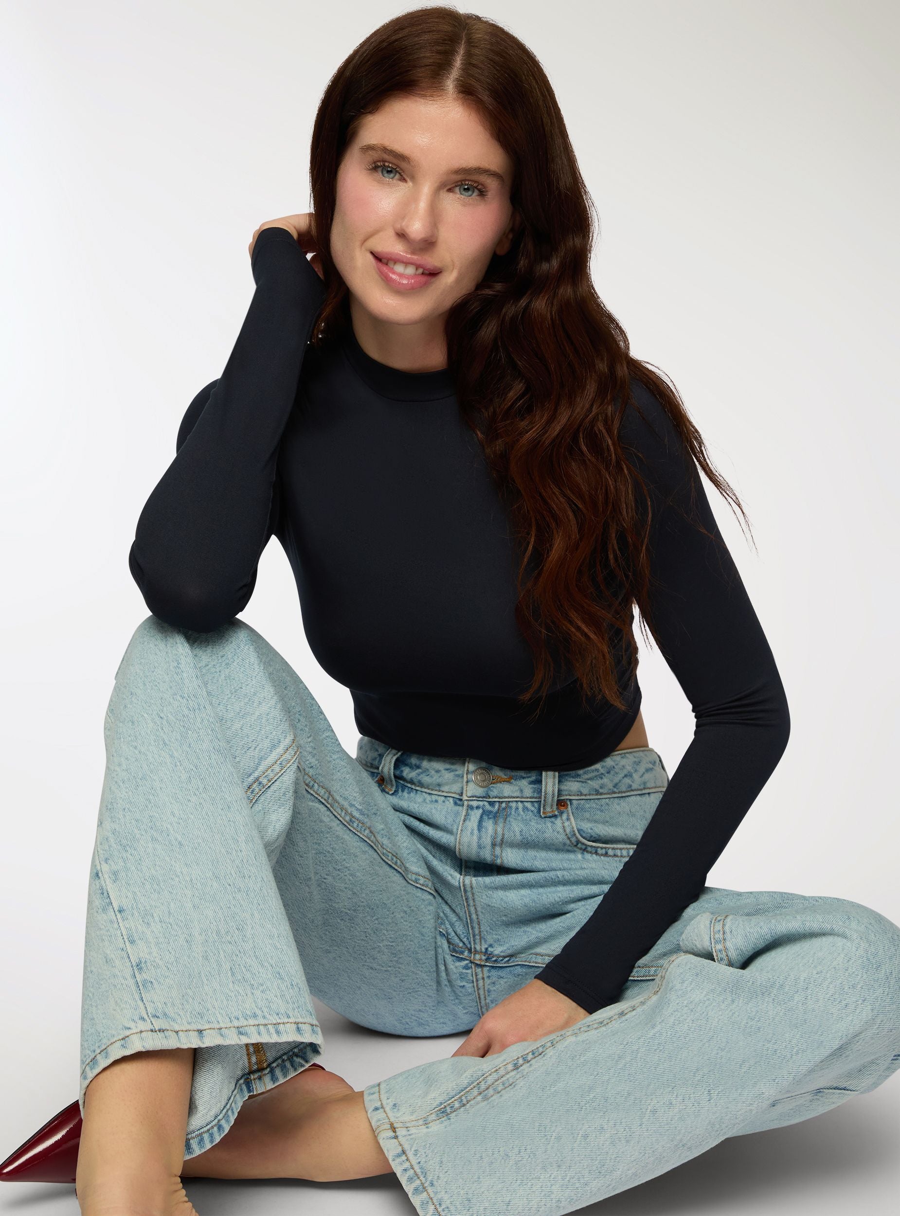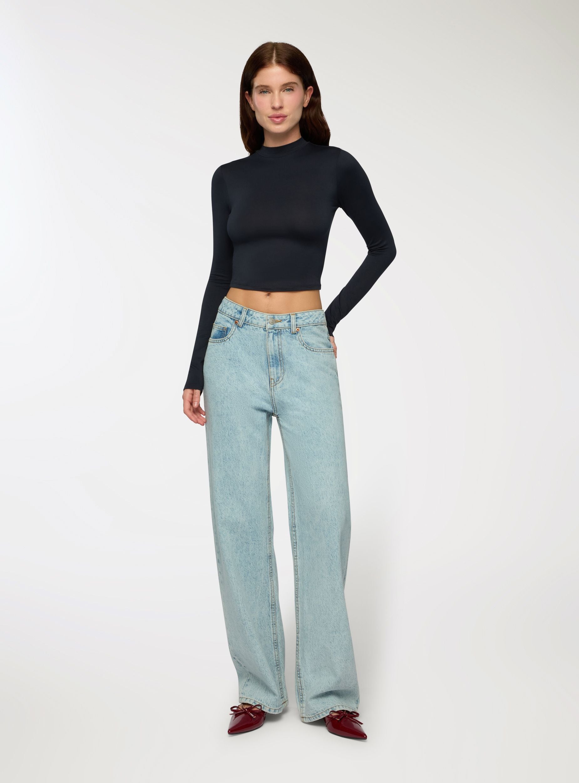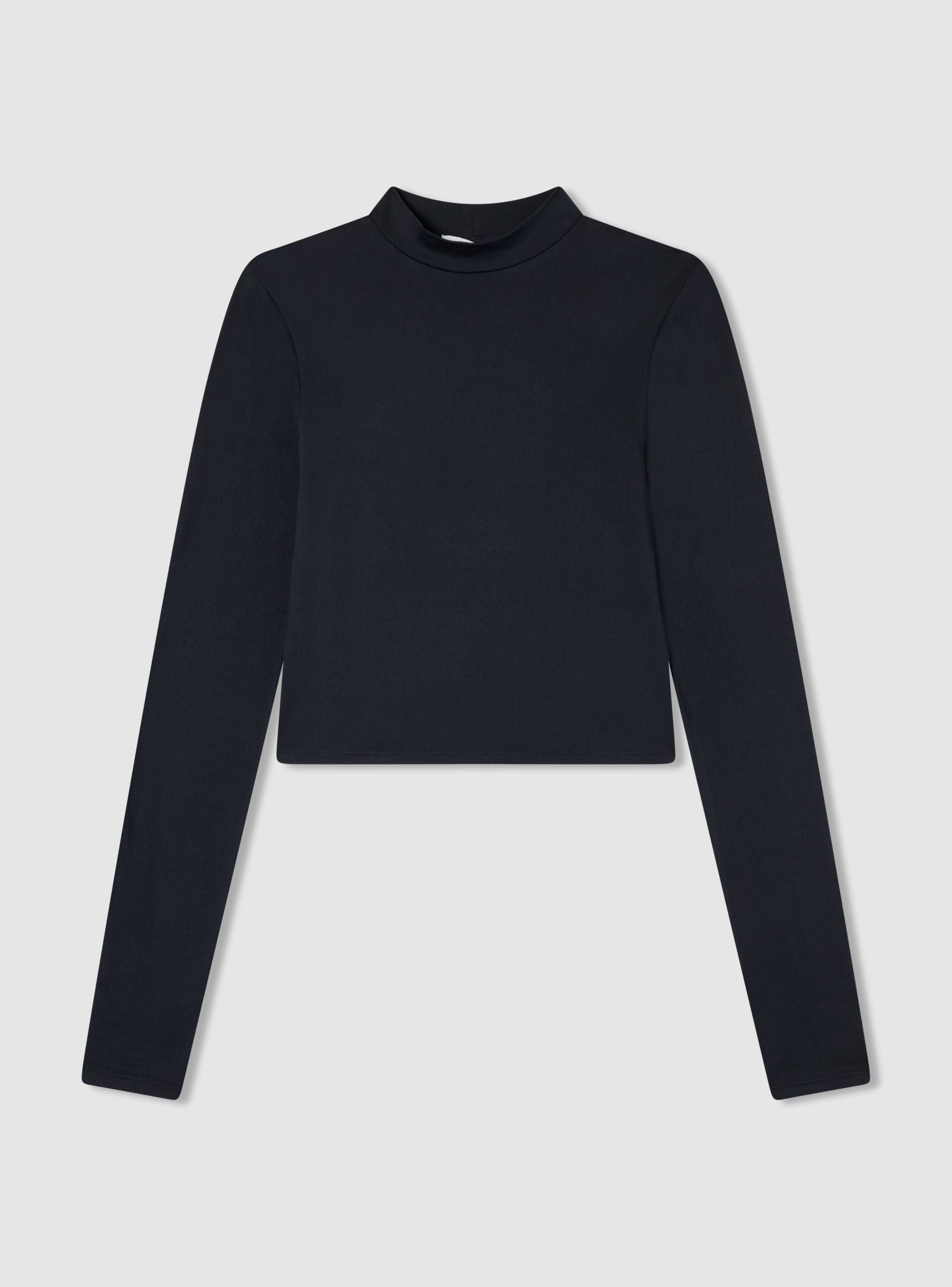 Elastisches Damenlangarmshirt mit Crop-Design und hohem Kragen. Perfekt für legere und moderne Outfits, lässt es sich leicht mit Jeans oder High-Waist-Röcken kombinieren. Die eng anliegende Passform und der kurze Schnitt machen es ideal für modische Looks. Geeignet für informelle Anlässe. Ein unverzichtbares Basic-Teil für den Kleiderschrank.Details