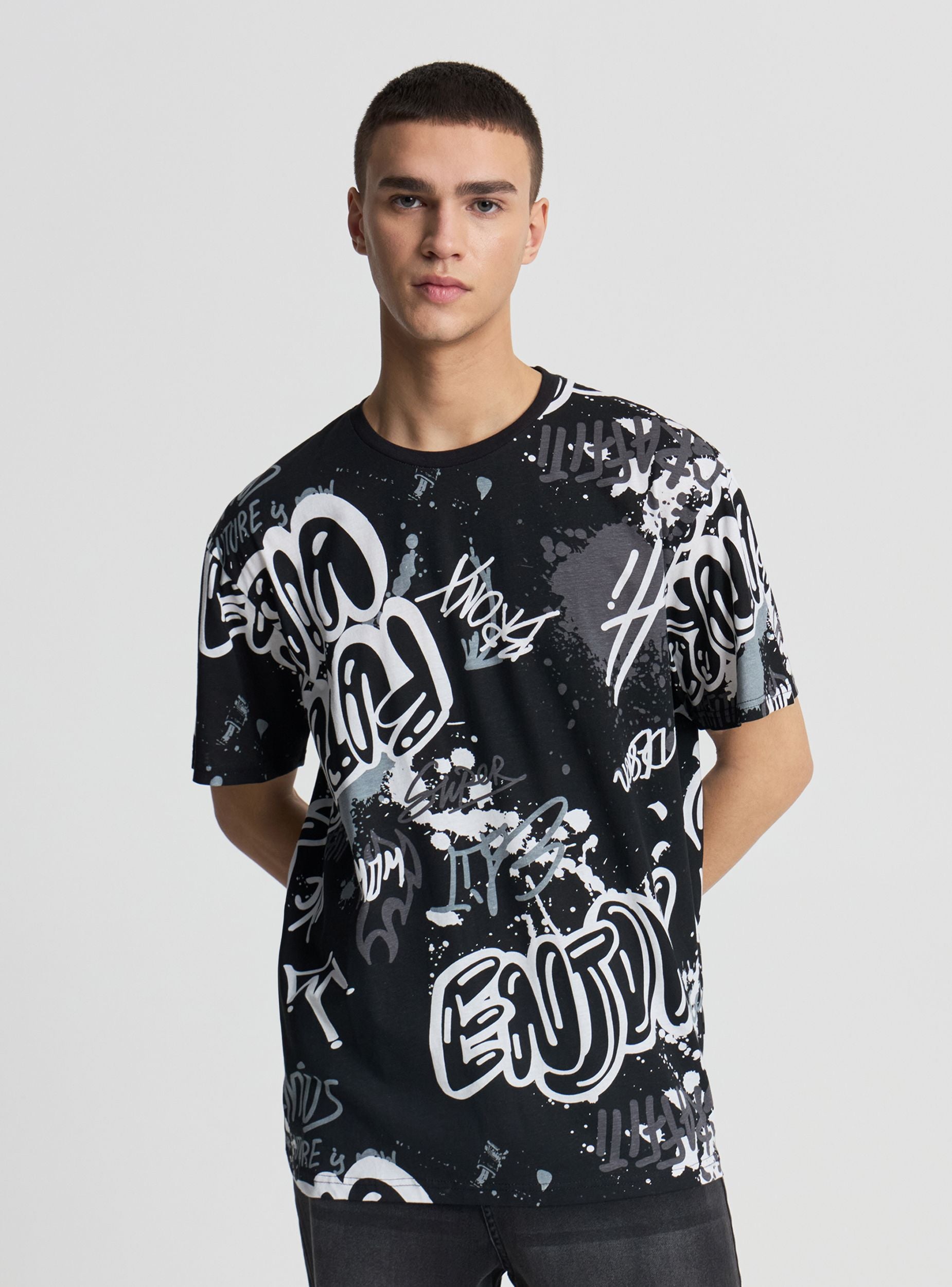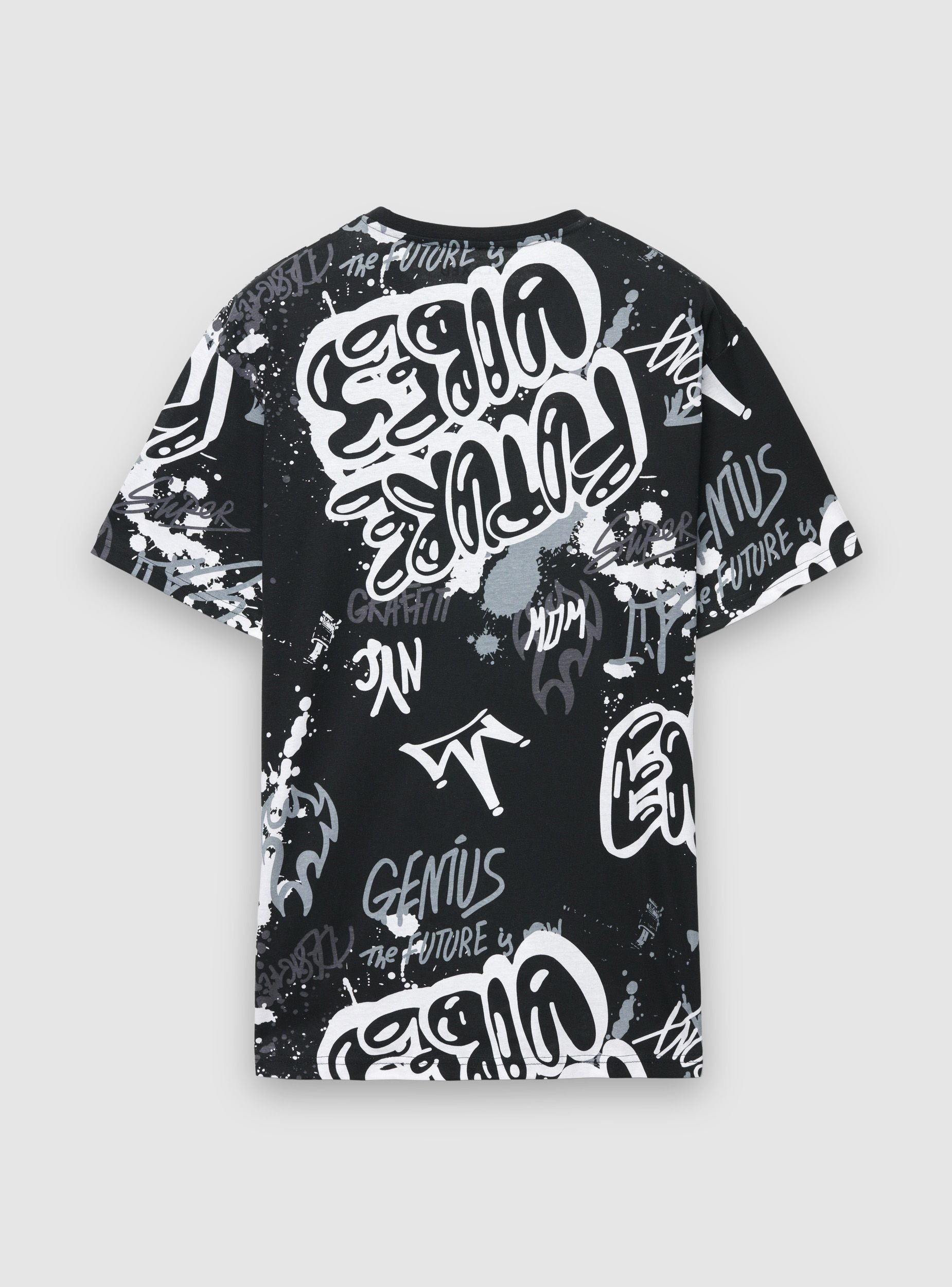 Herren-T-Shirt mit entspannter Passform und durchgehendem Graffiti-Print. Rundhalsausschnitt, kurze Ärmel und gerader Saum für einen urbanen Look, der sich jeden Tag leicht tragen lässt. Perfekt zu Jeans und Sneakern für die Freizeit oder unter einem offenen Hemd für ein lässiges Outfit. Die Schrift- und Spritzgrafik verleiht Charakter, während die bequeme Verarbeitung Bewegungsfreiheit garantiert.Details