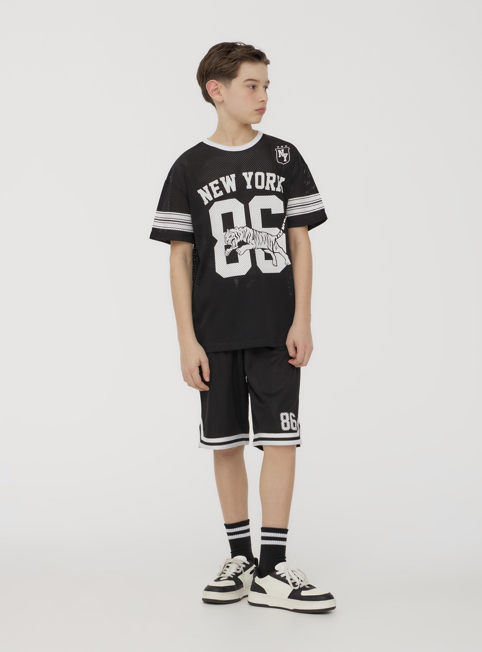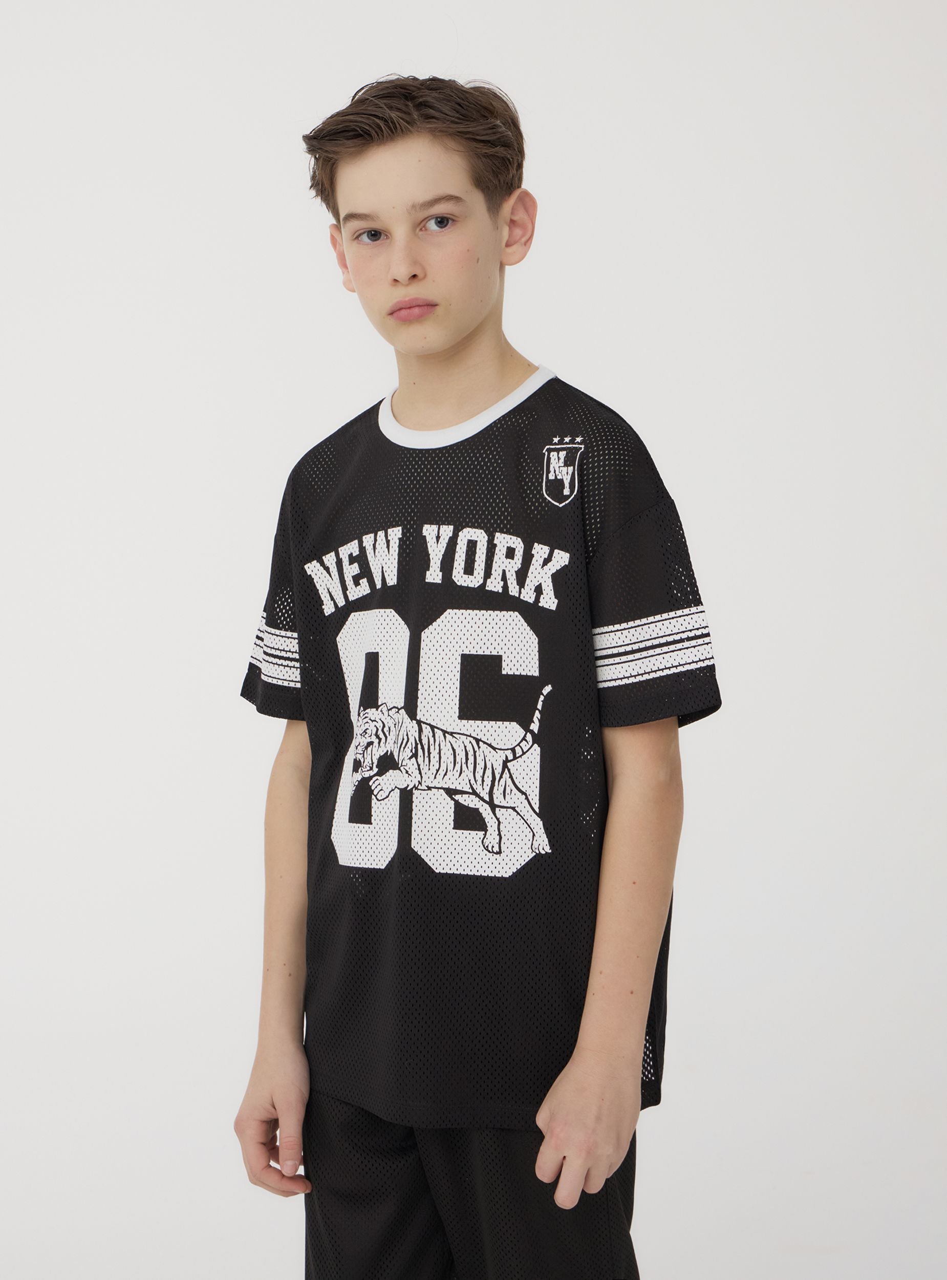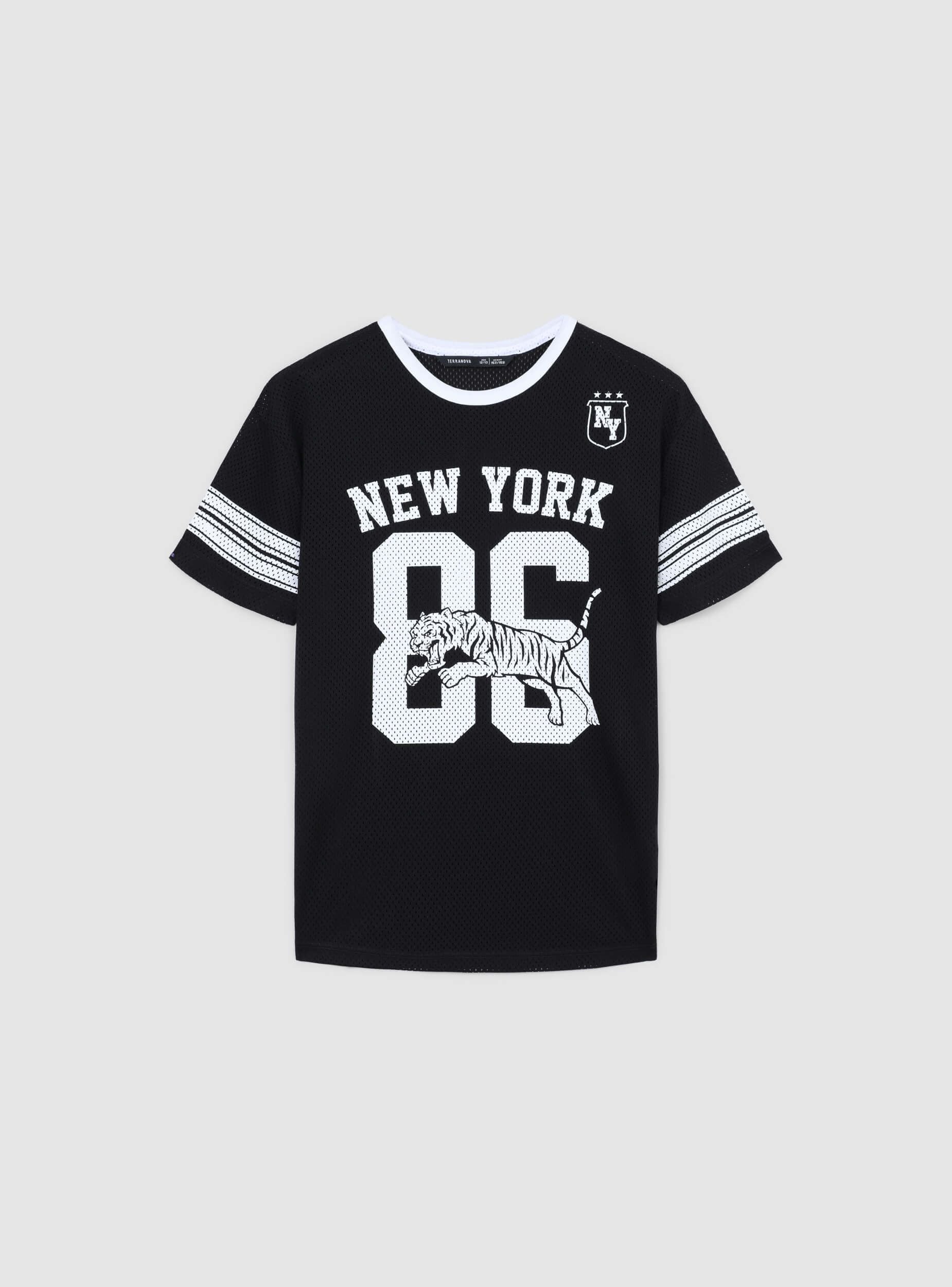 Kinder T-Shirt, ideal für einen sportlichen und dynamischen Look, perfekt für die Freizeit oder für Aktivitäten im Freien. Ausgestattet mit einer regulären Passform, zeigt es einen ansprechenden grafischen Druck und Streifendetails an den Ärmeln. Ein vielseitiges und bequemes Kleidungsstück für jeden lässigen Anlass.Details