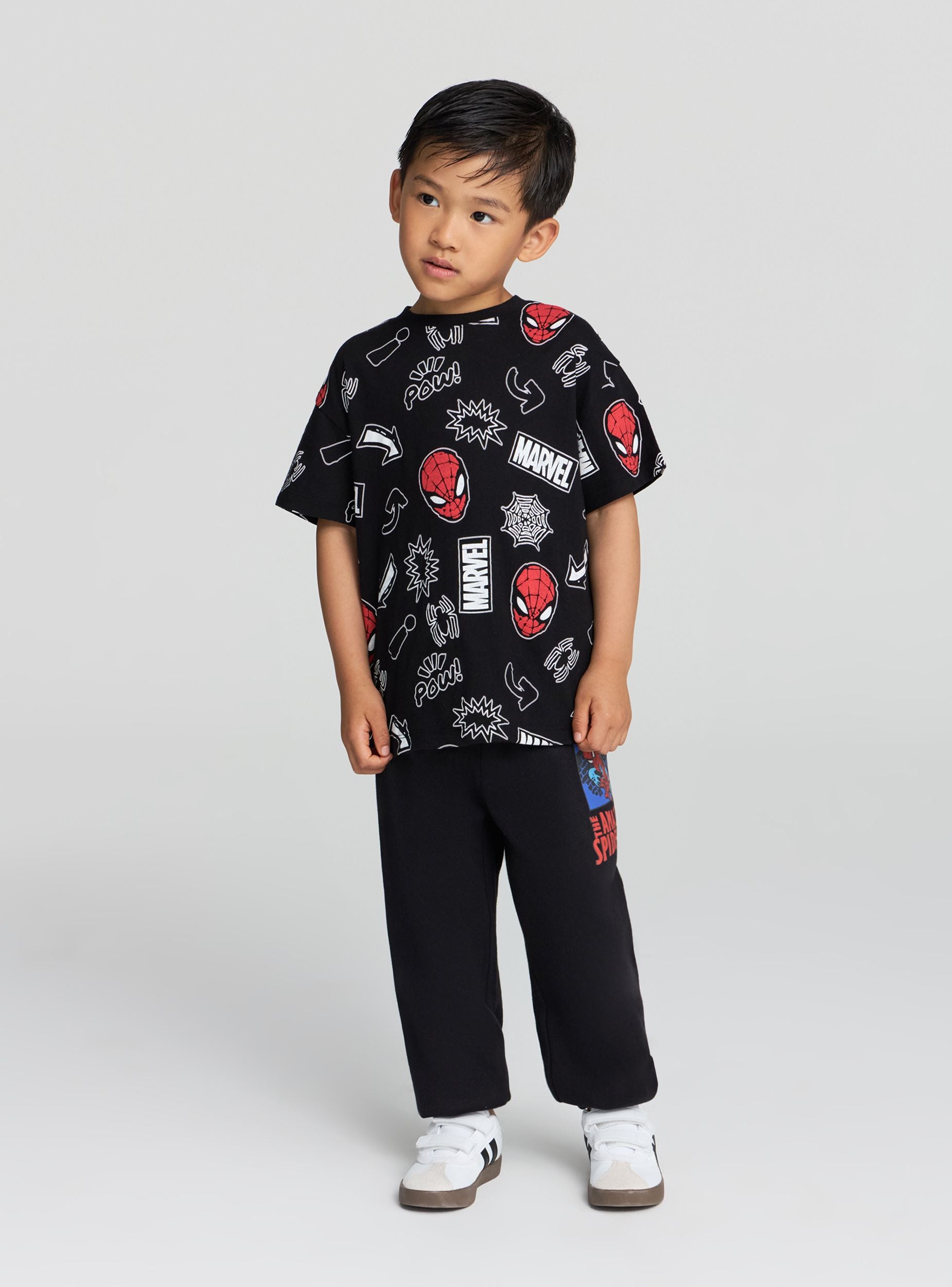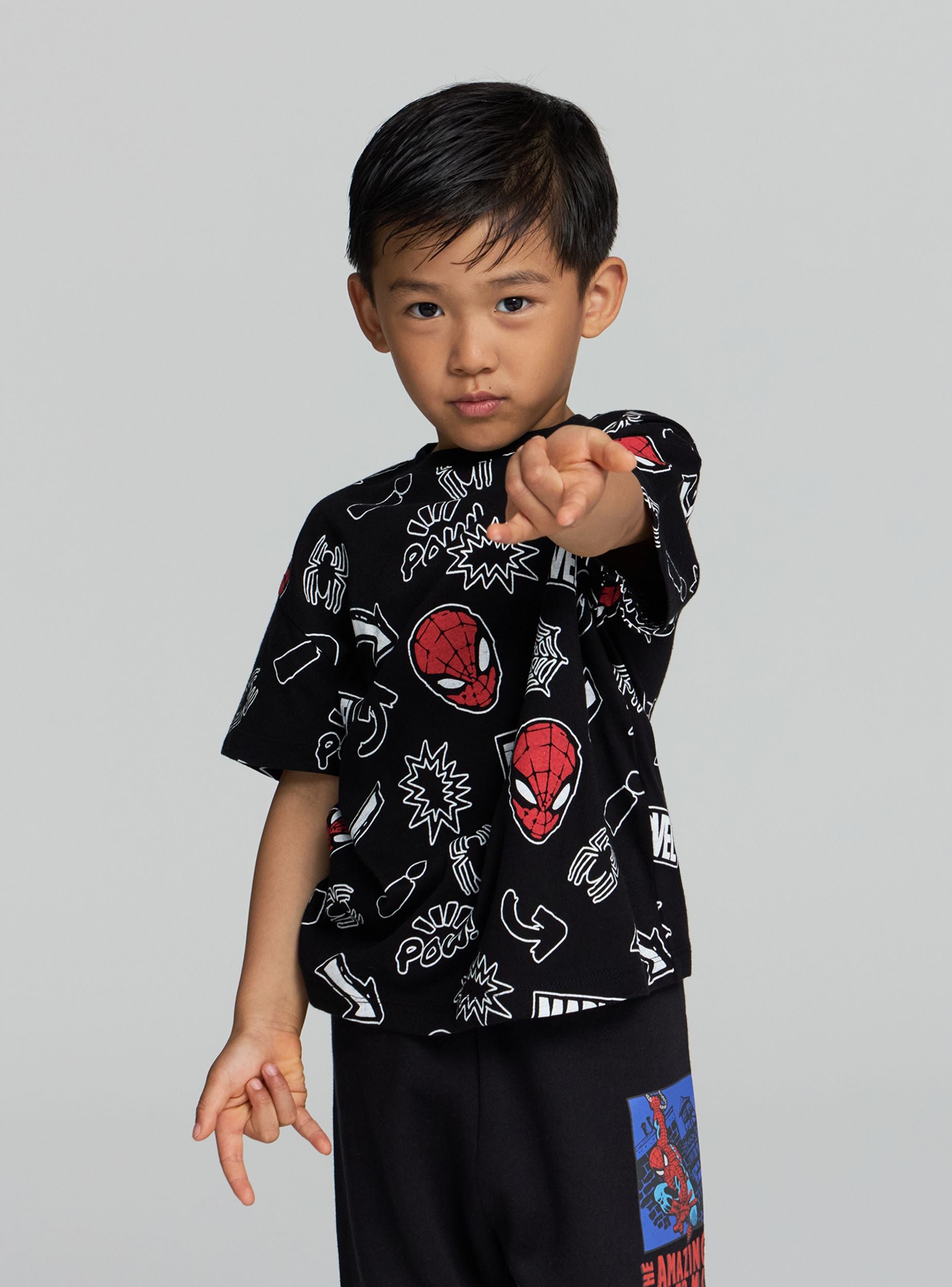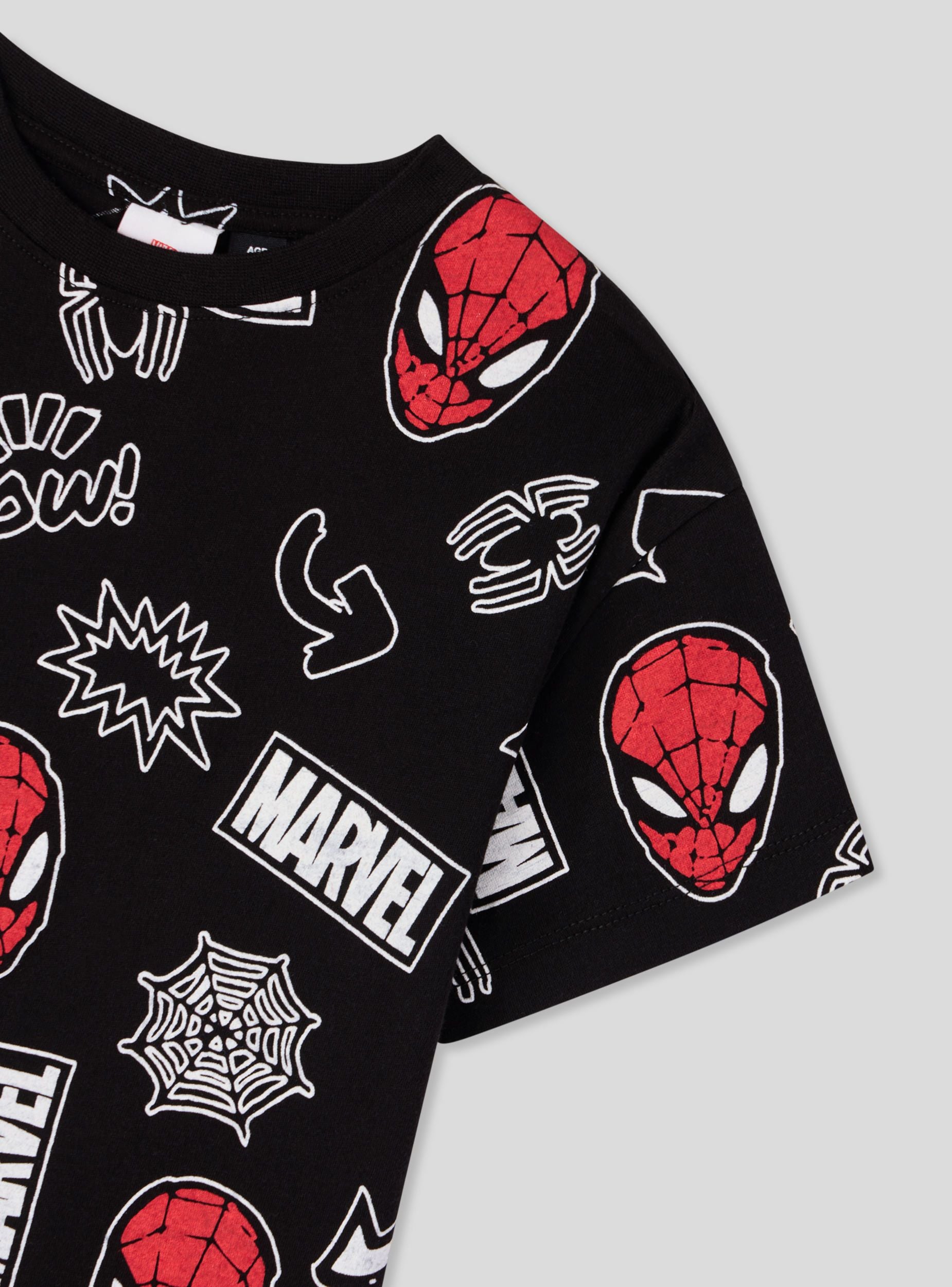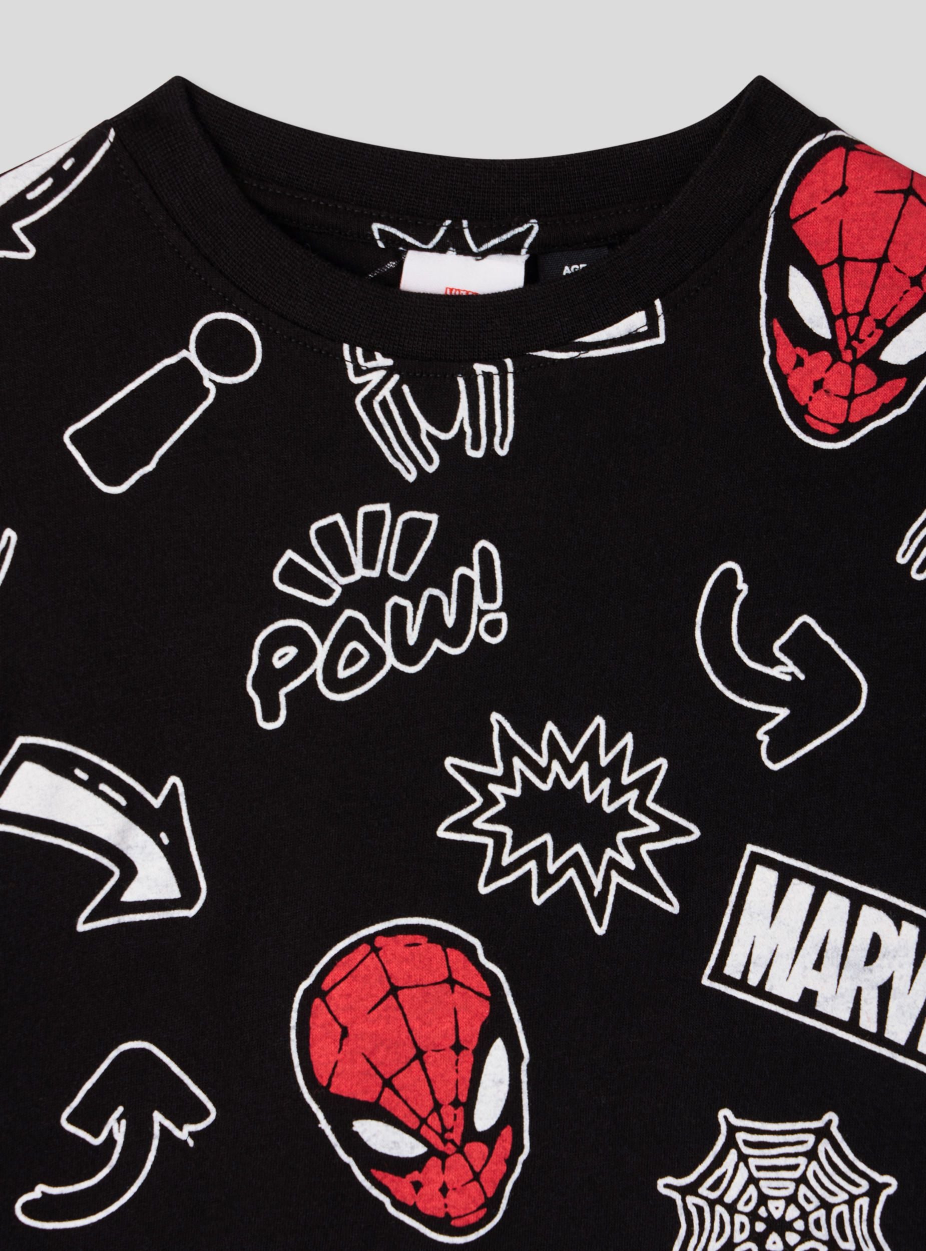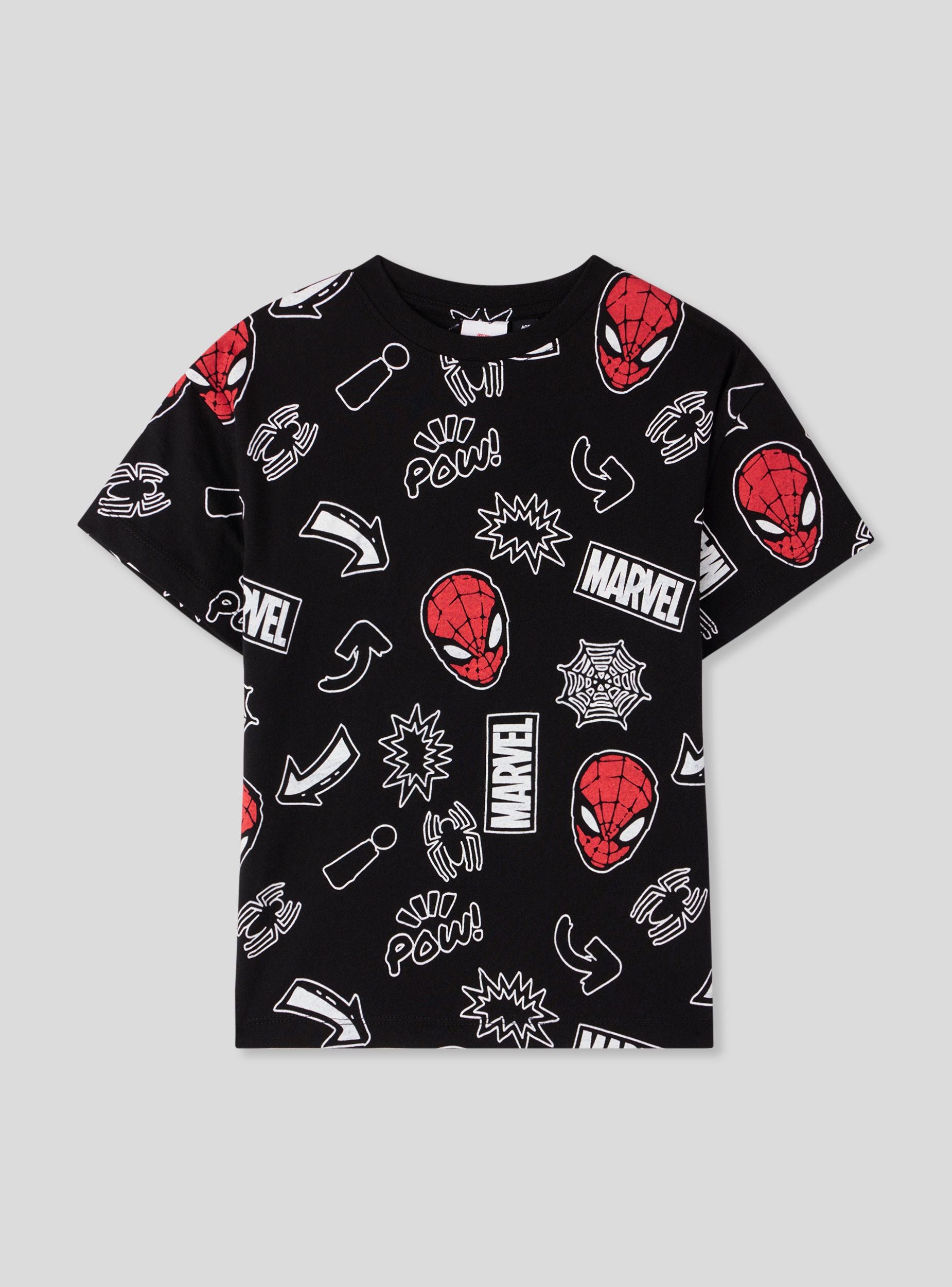 T-Shirt für Jungen mit Allover-Druck inspiriert von Spiderman®, ideal für kleine Superhelden-Fans. Das Modell hat kurze Ärmel, einen Rundhalsausschnitt und eine normale Passform, perfekt für den täglichen Gebrauch und die Freizeit. Lässt sich leicht mit Jeans oder Shorts kombinieren für einen dynamischen und lustigen Look, geeignet sowohl für die Schule als auch für Ausflüge mit Freunden.Details