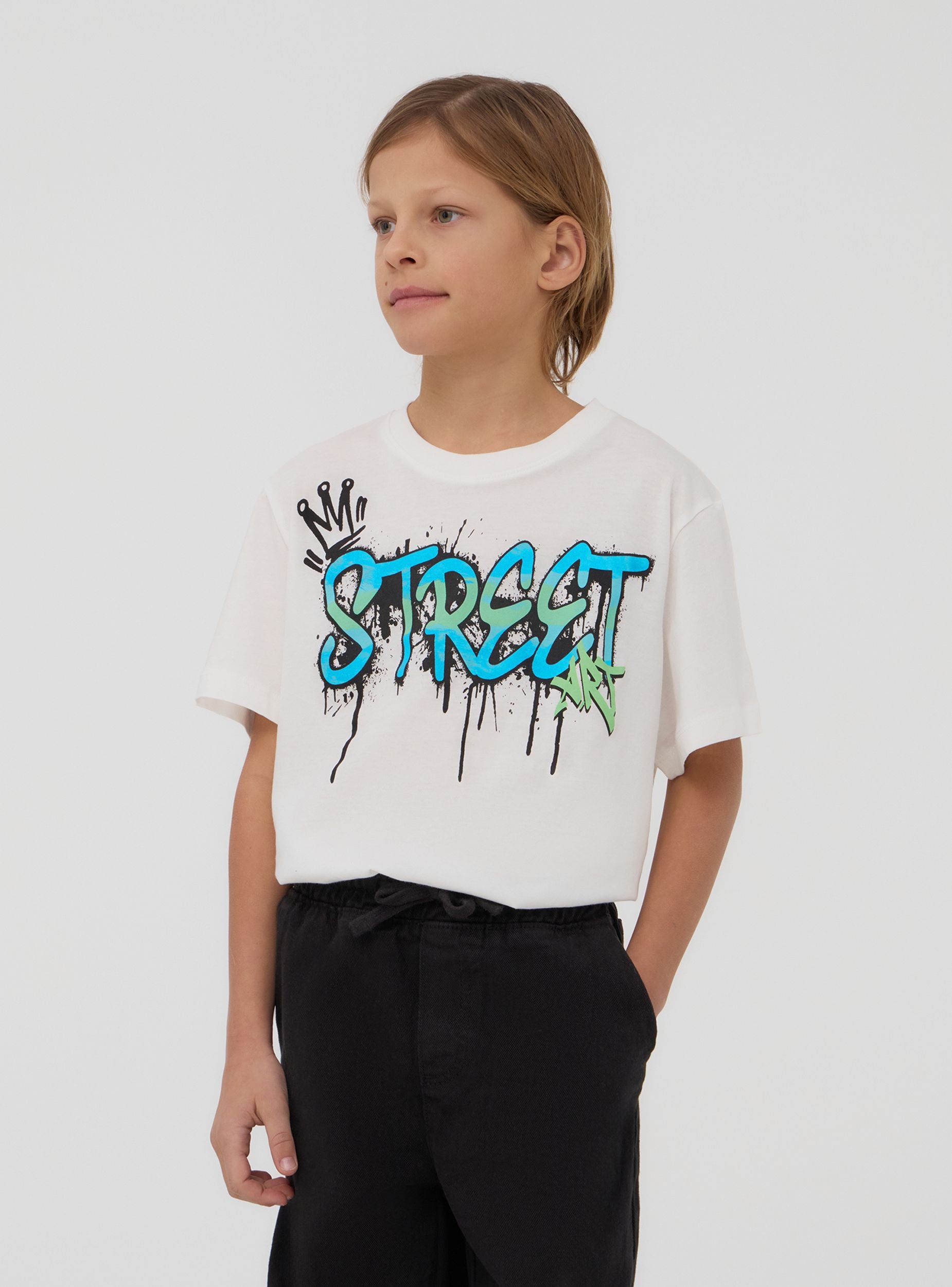 Perfektes Kinder-T-Shirt für einen lässigen und originellen Look, ideal für die Freizeit und Tage im Freien. Mit kurzen Ärmeln und Rundhalsausschnitt zeichnet es sich durch den Graffiti-Stil Schriftzug aus, der dem Kleidungsstück einen urbanen und dynamischen Touch verleiht. Eine bequeme und trendige Wahl für jeden informellen Anlass.Details
