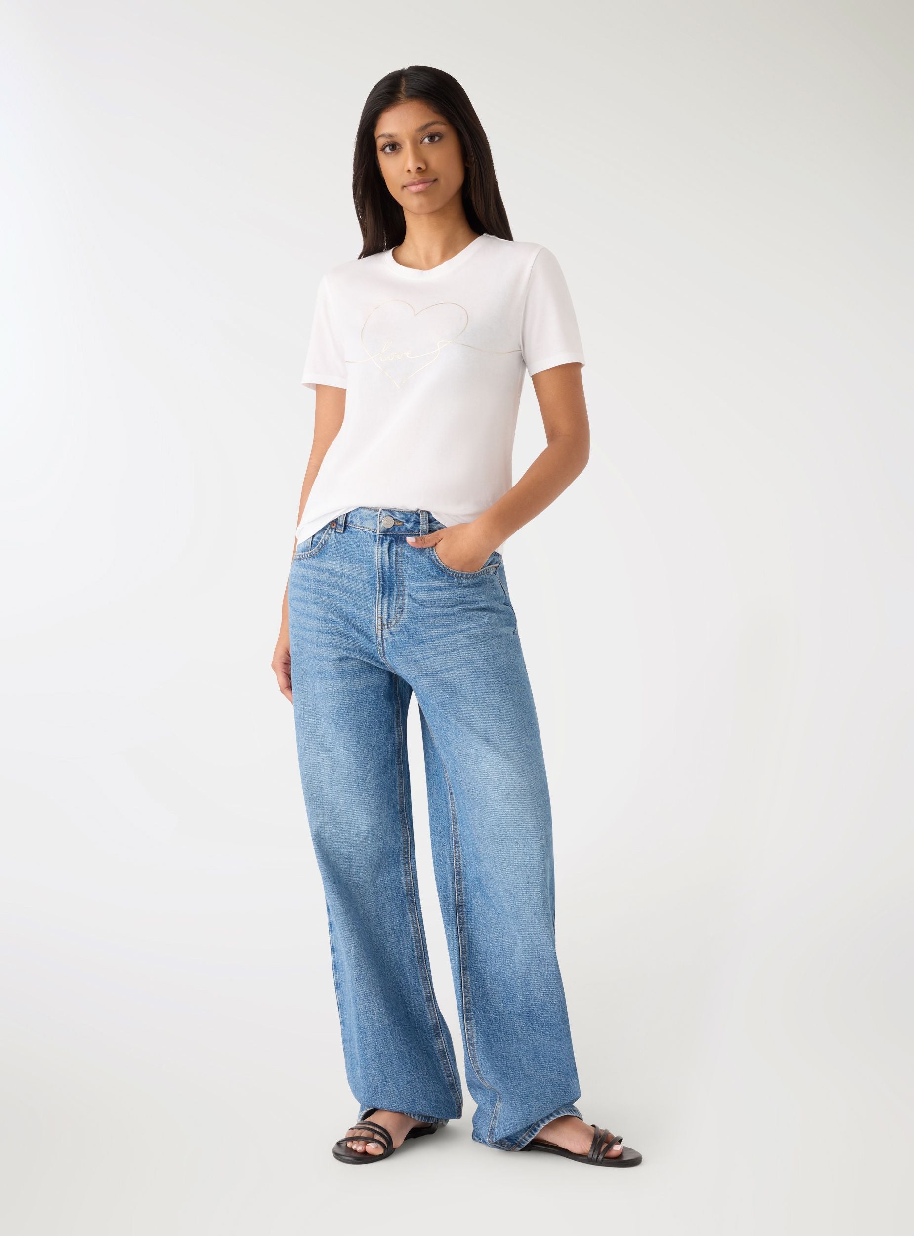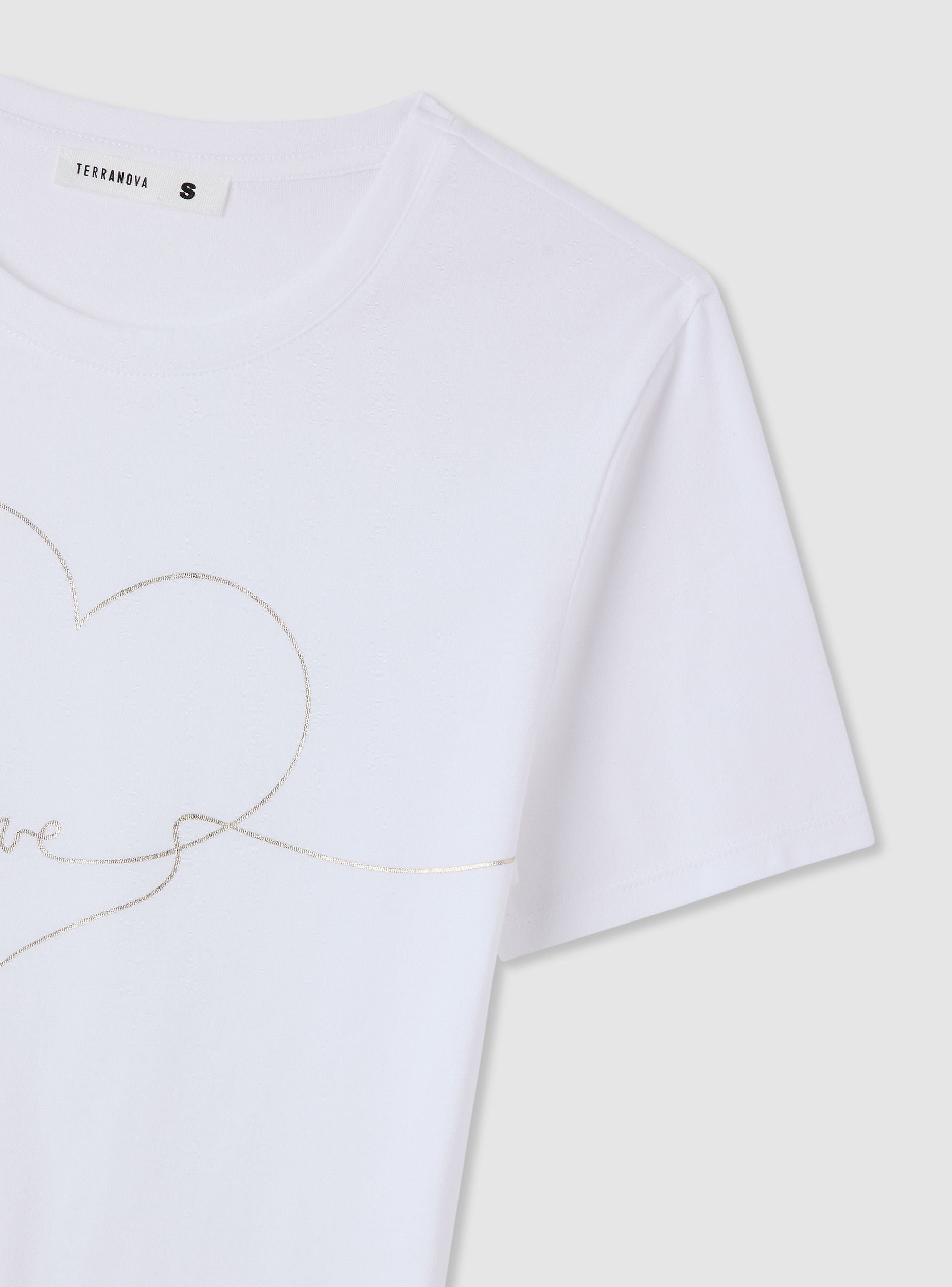 Damen-T-Shirt mit kurzen Ärmeln in Uni-Farbe und Herz-Print. Rundhalsausschnitt und Regular Fit für einen leicht kombinierbaren Look mit Jeans, Shorts oder Röcken. Grafische Details mit Glitzereffekt verleihen eine feminine Note. Perfekt für die Freizeit und legere Outfits, kann unter einer leichten Jacke oder einem Cardigan getragen werden und rundet den Alltagslook stilvoll ab.Details
