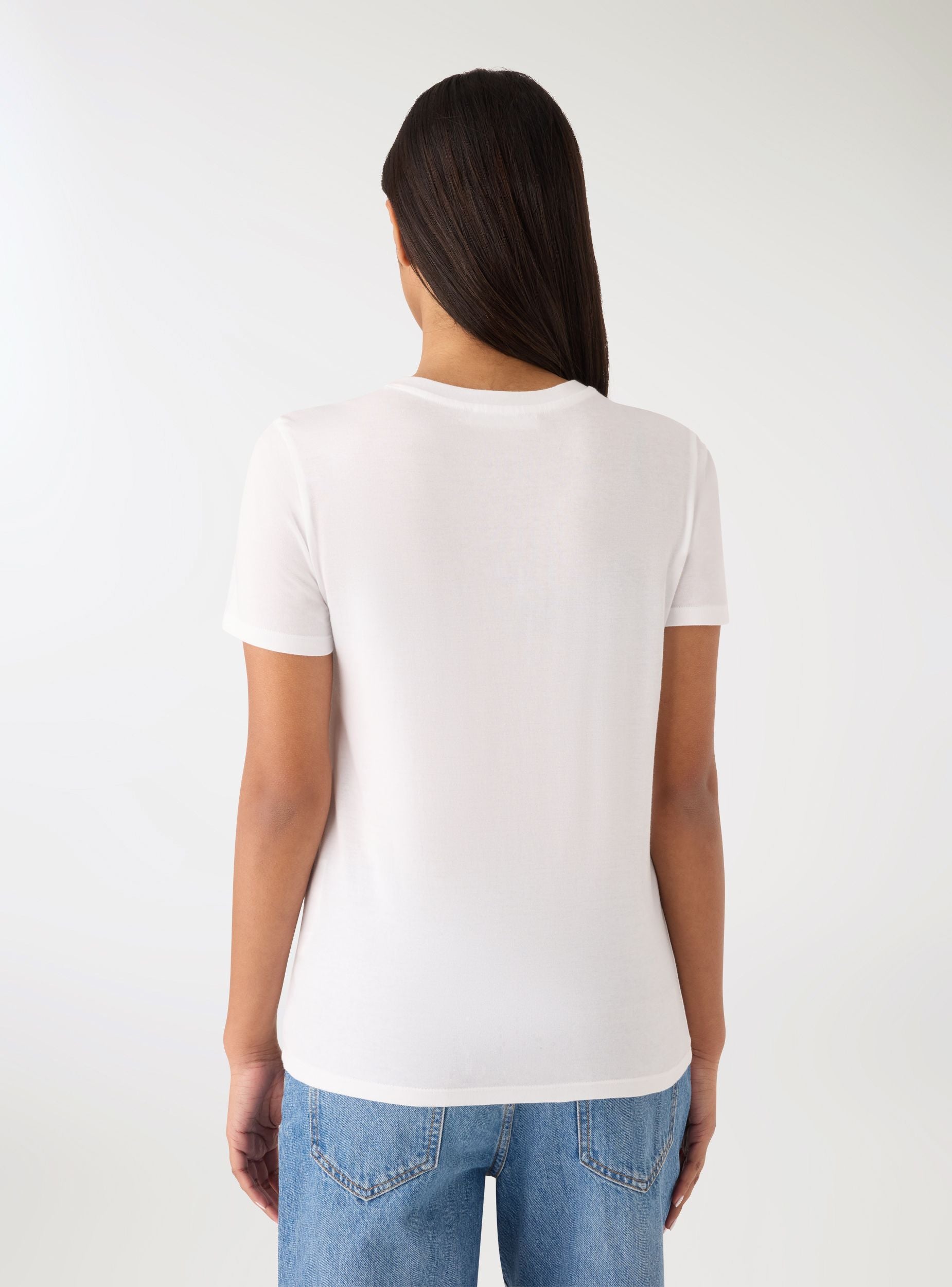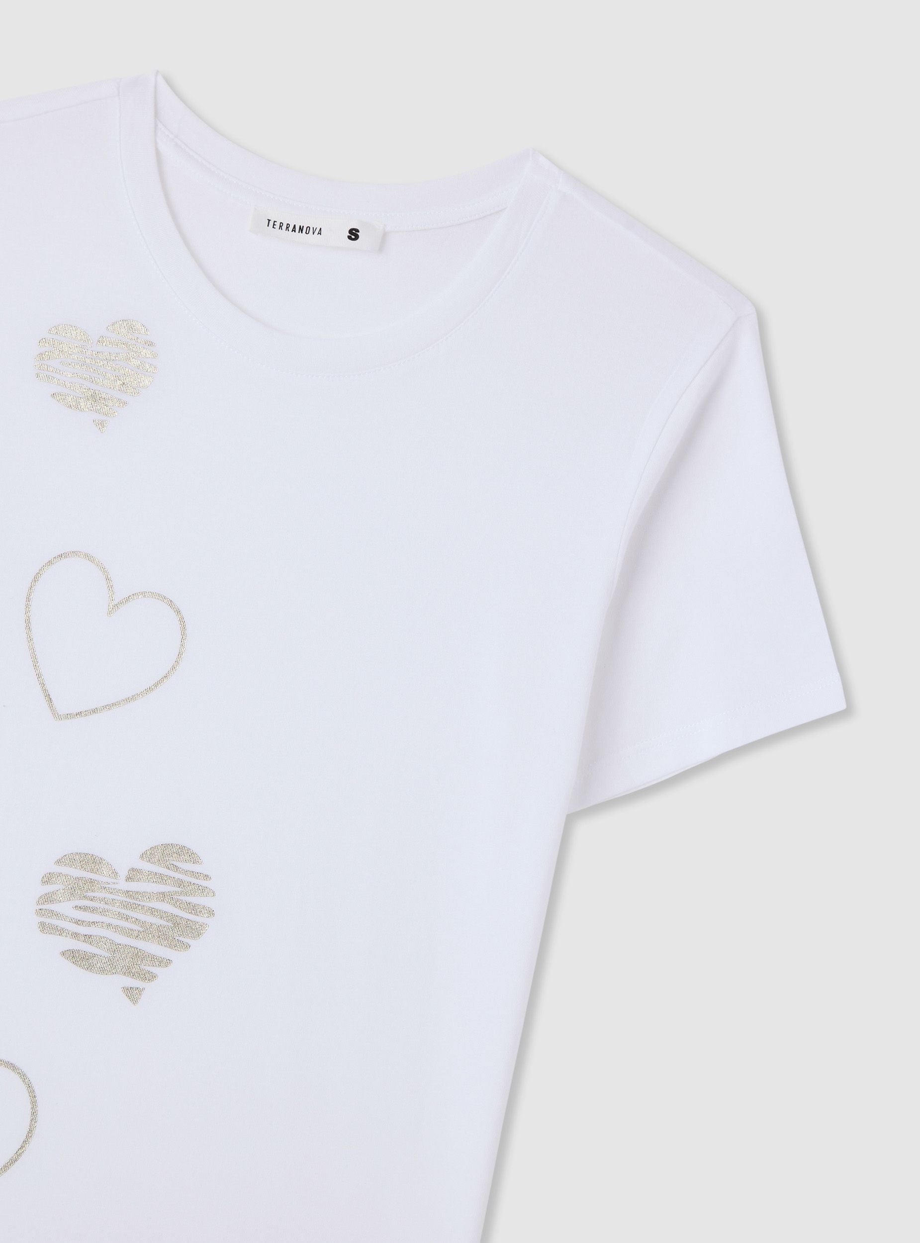 Damen-T-Shirt mit kurzen Ärmeln in Uni-Farbe und Herz-Print. Rundhalsausschnitt und reguläre Passform für einen leicht kombinierbaren Look mit Jeans, Shorts oder Röcken. Grafische Details mit glitzerndem Effekt verleihen eine feminine Note. Perfekt für Freizeit und lässige Outfits, kann unter einer leichten Jacke oder einem Cardigan getragen werden und rundet Alltagslooks stilvoll ab.Details
