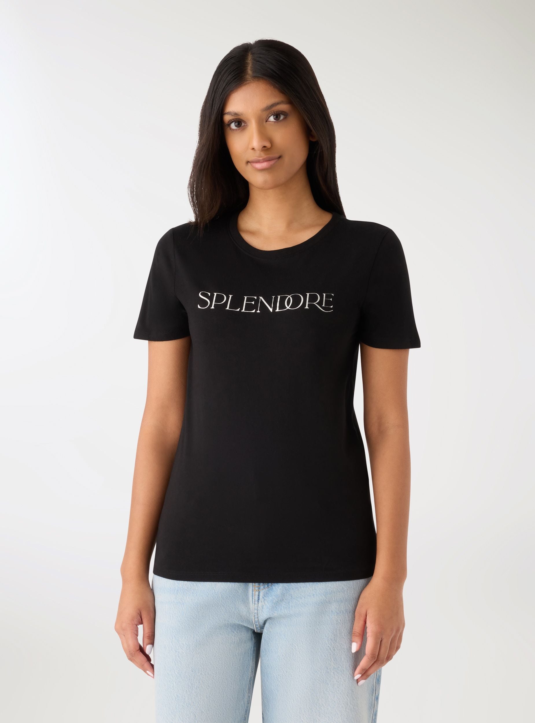 Damen-T-Shirt mit kurzen Ärmeln, Rundhalsausschnitt und regulärer Passform. Auf der Vorderseite befindet sich ein dekorativer Schriftzug mit Glitzereffekt, ideal für einen lässigen und urbanen Look. Leicht kombinierbar mit Jeans oder Röcken und perfekt zum Tragen unter leichten Jacken. Perfekt für den Alltag. Design mit Schriftzug, der deinem Outfit einen glänzenden Akzent verleiht.Details