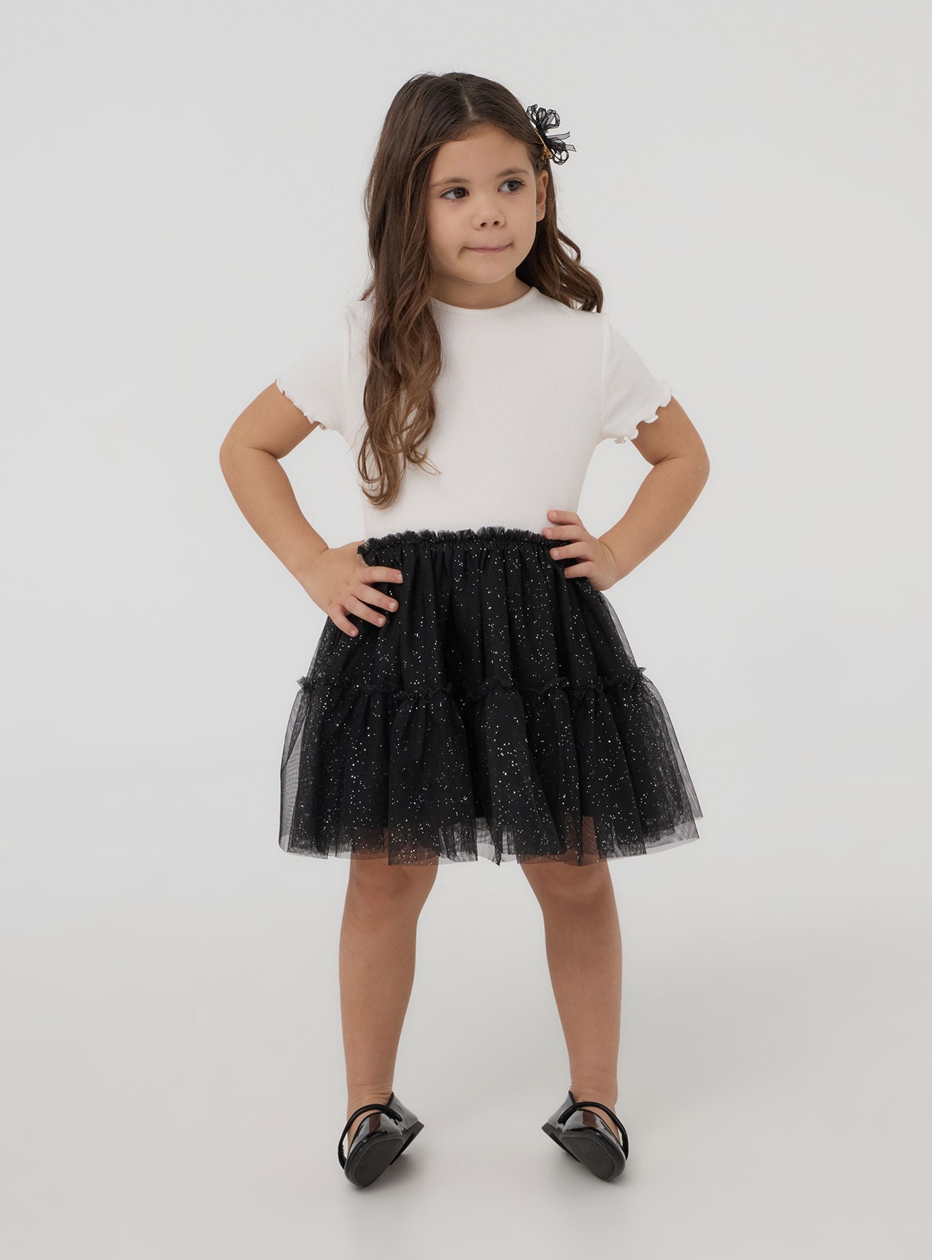 Ein zweifarbiges Mädchenkleid mit glamourösem Effekt. Dieses zweigeteilte Kleid ist perfekt für alle, die funkelnde Details lieben, dank der mit Glitzer verzierten Tüllrüschen, die es magisch und ideal für besondere Anlässe machen. Die kurzen Ärmel und das verspielte Design sorgen für Komfort und Stil und passen perfekt zu den Vorlieben der Kleinen. Ein fröhliches und vielseitiges Kleidungsstück, das dafür gedacht ist, dass sich jedes Mädchen wie eine echte Hauptdarstellerin fühlt.Details