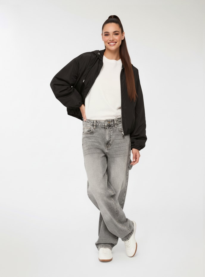 Damen-Bomberjacke mit Kapuze und Kordelzug, ideal für einen lässigen und modernen Look. Ausgestattet mit Reißverschluss und Seitentaschen bietet sie sowohl Praktikabilität als auch Stil. Die reguläre Passform macht sie perfekt zum Tragen über T-Shirts oder Pullovern und eignet sich für verschiedene Anlässe. Das einfarbige Design macht sie vielseitig und leicht kombinierbar mit Jeans oder Sporthosen.