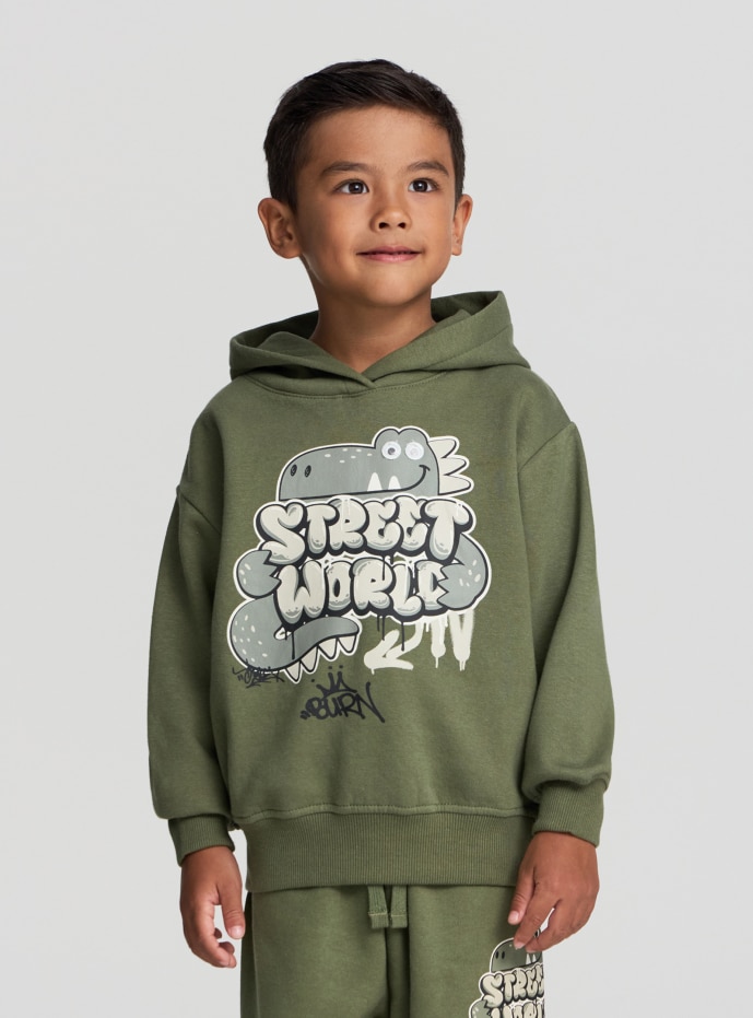 Schwerer Kinder-Sweatshirt mit Kapuze, ideal für einen lässigen und modischen Look. Es verfügt über einen auffälligen grafischen Aufdruck auf der Vorderseite im Graffiti-Stil, perfekt, um den Alltagsoutfits eine originelle Note zu verleihen. Die bequeme Passform und das Kapuzendesign machen es geeignet für kühle Tage oder Outdoor-Aktivitäten. Es lässt sich leicht mit Jeans oder Sporthosen kombinieren und sorgt so für einen vielseitigen und praktischen Look.
