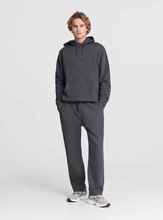 Schwere Herren-Trainingshosen, ideal für einen lässigen und sportlichen Look. Sie verfügen über einen verstellbaren Kordelzug in der Taille für eine individuelle und bequeme Passform. Mit seitlichen Schrähtaschen für Praktikabilität und Stil ausgestattet. Das gerade Bein bietet ein modernes und vielseitiges Design, perfekt für Kombinationen mit T-Shirts und Sweatshirts. Ideal für Freizeit und leichte Aktivitäten.