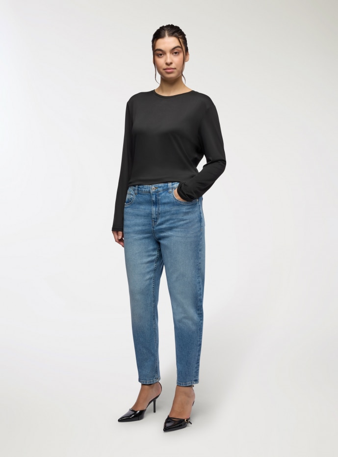 Damenjeans mit Mom-Fit-Passform, ideal für einen lässigen und vielseitigen Look. Sie verfügen über eine mittlere Denim-Waschung und einen Knopfverschluss sowie vordere und hintere Taschen für mehr Praktikabilität. Perfekt kombinierbar mit T-Shirts oder Hemden für ein alltägliches Outfit. Das einfarbige Design macht sie für viele Anlässe geeignet und garantiert Komfort und Stil.