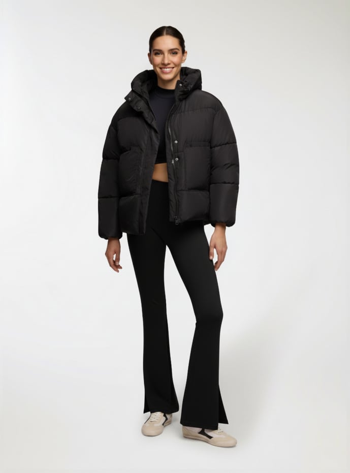 Damen-Steppjacke mit Kapuze, ideal, um kalte Tage stilvoll zu meistern. Ausgestattet mit Reißverschluss und Druckknöpfen bietet sie Praktikabilität und Schutz. Die großen Fronttaschen erhöhen die Funktionalität, während die Oversize-Passform sie perfekt macht, um sie über Pullovern oder Sweatshirts zu tragen. Modernes und vielseitiges Design, geeignet für legere und informelle Looks.